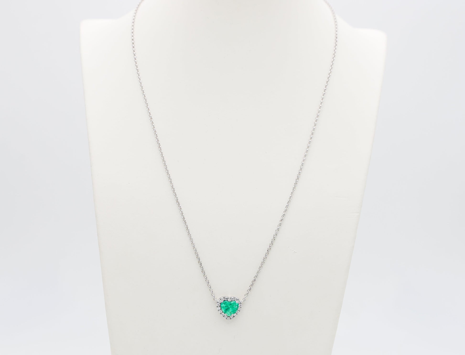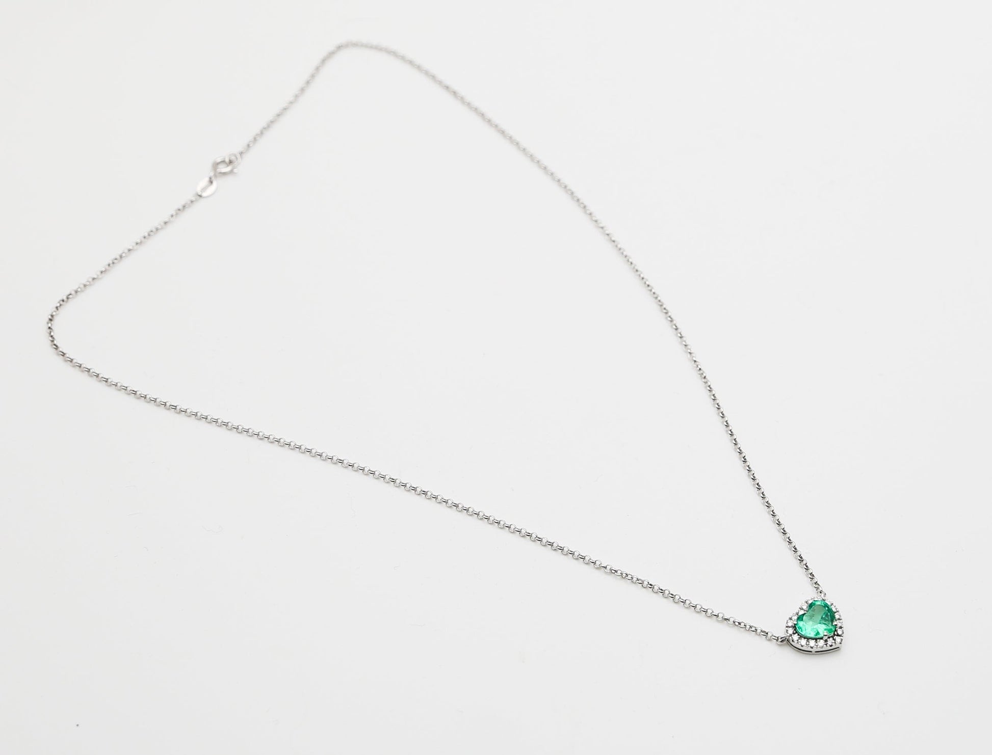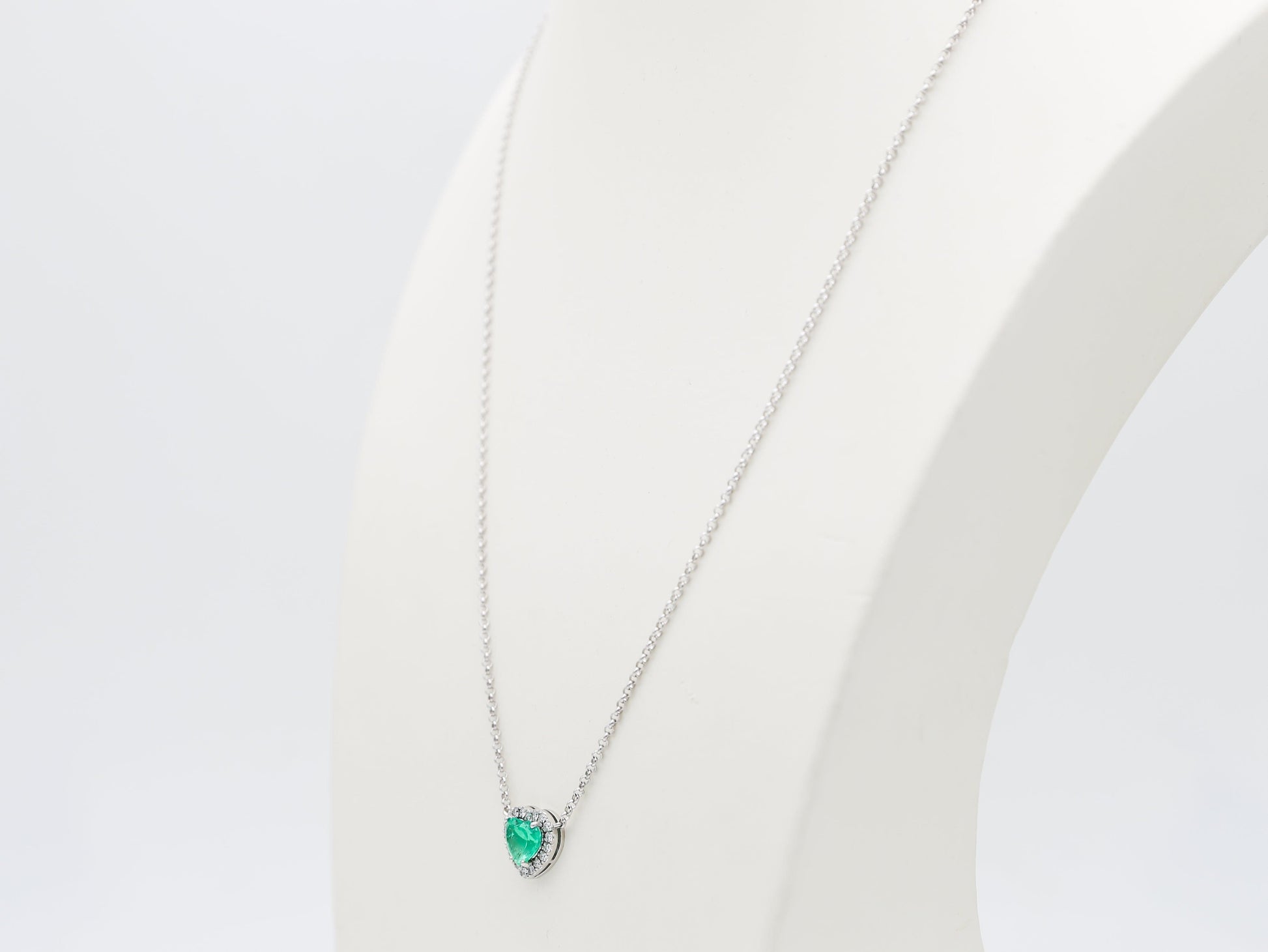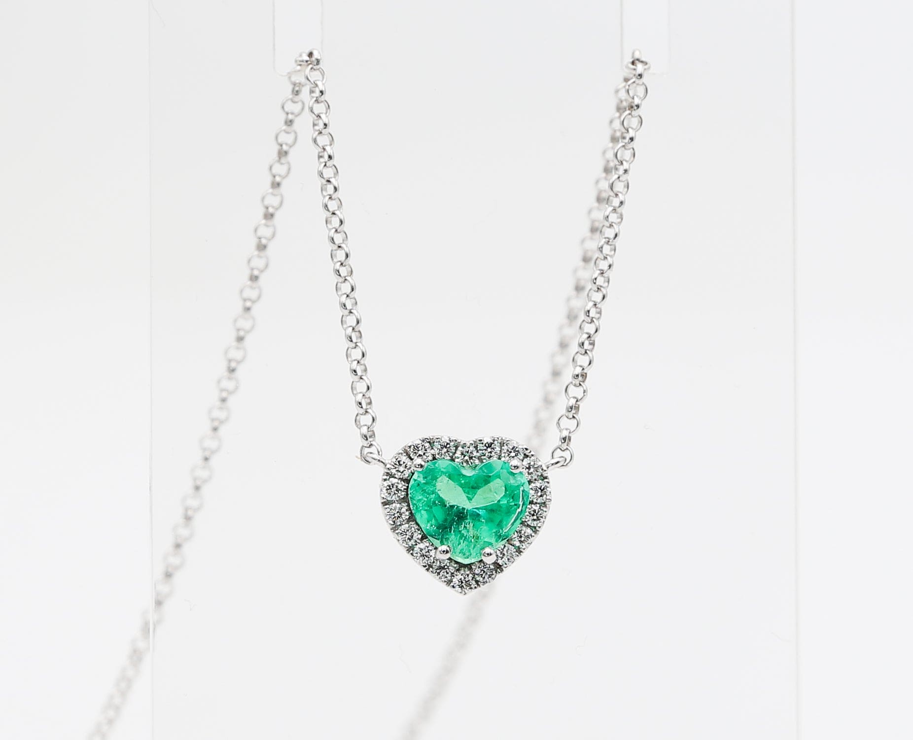 Questa collana è un gioiello molto elegante e monta uno splendido smeraldo al centro, di taglio cuore e di colore verde molto intenso.