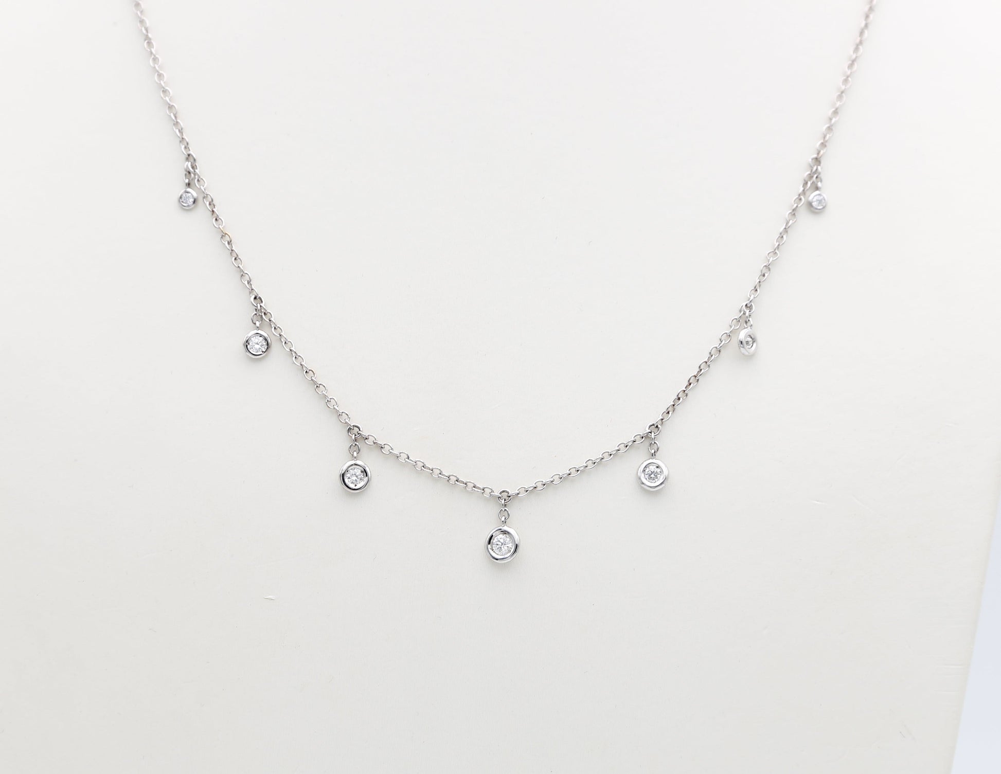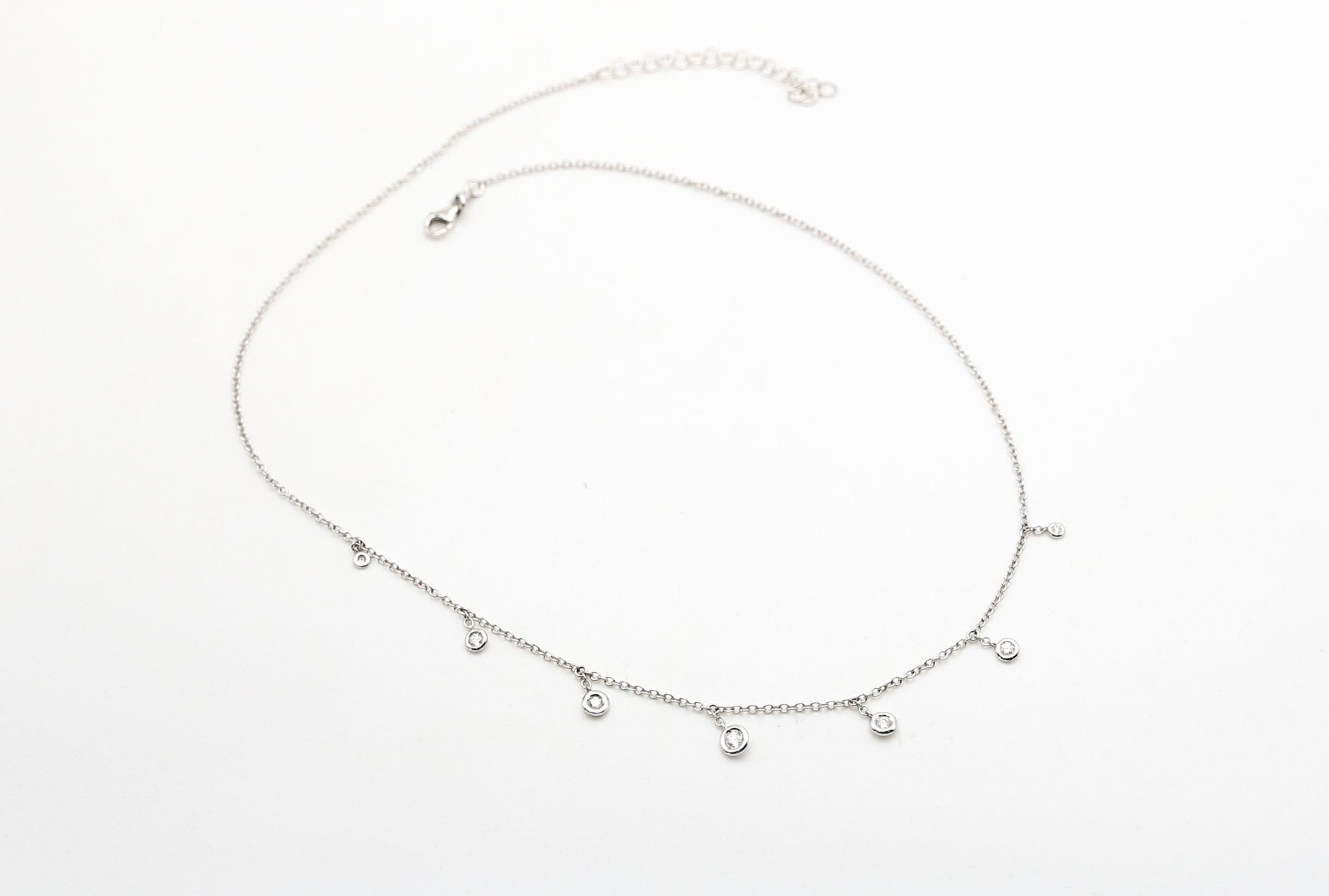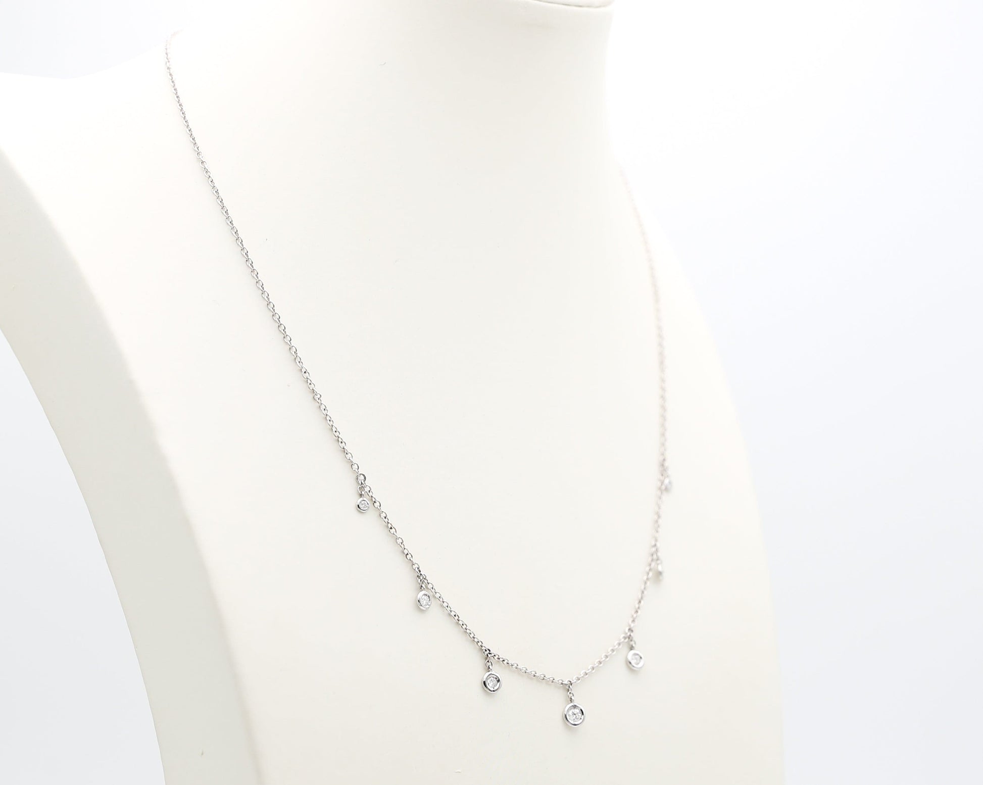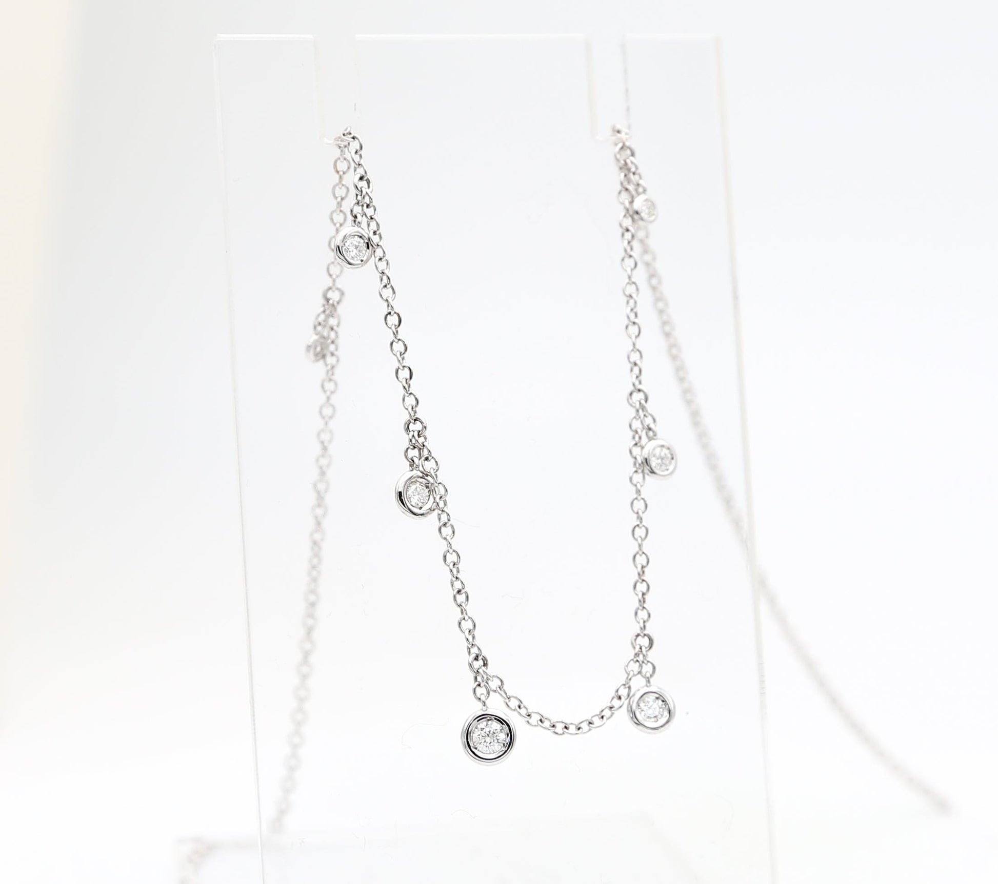 La catena è in maglia mini rolò, e nella sua lunghezza, che misura 45 cm, si trovano distanziati 7 diamanti con incastonatura a cipollina con una pratica e sicura chiusura a moschettone.