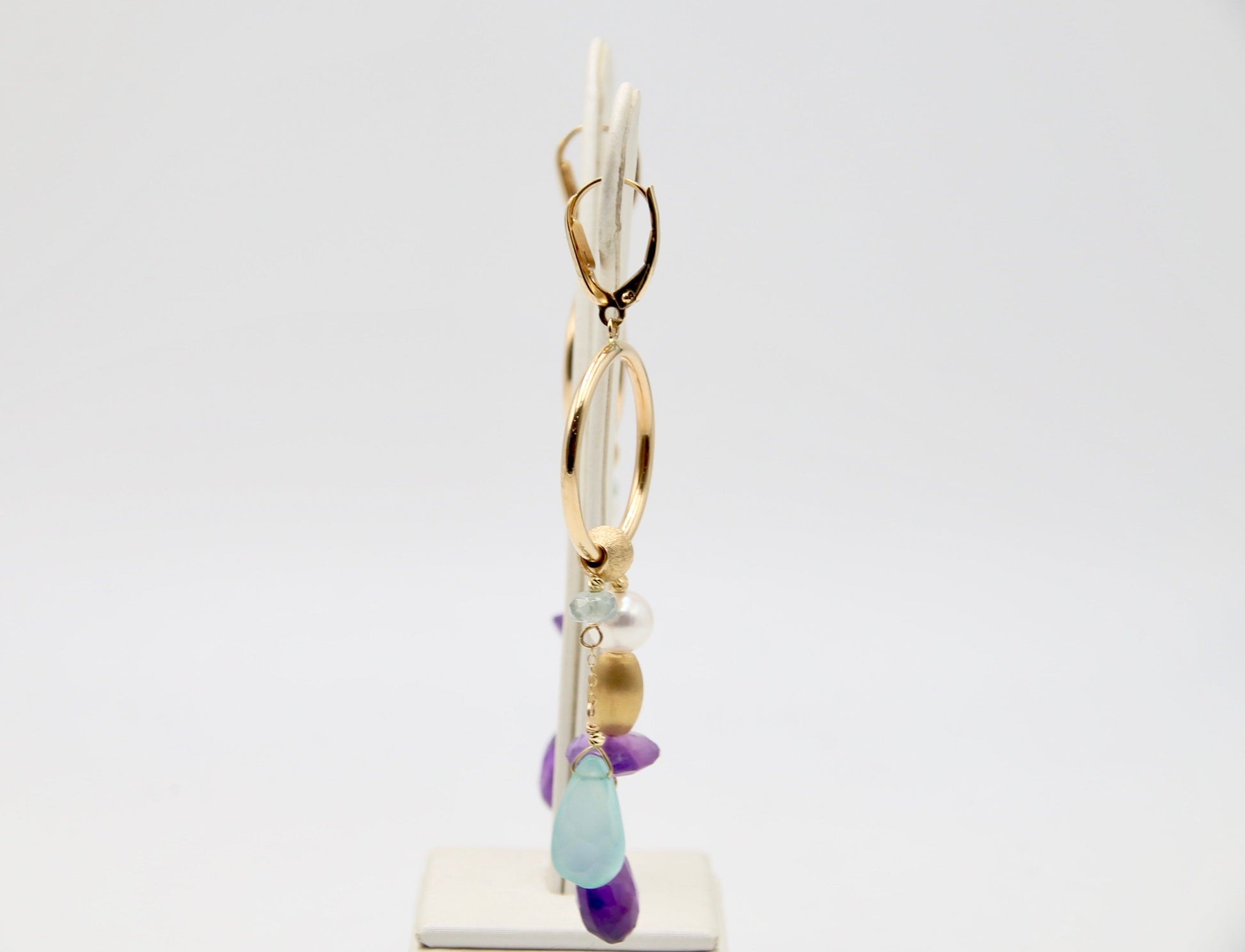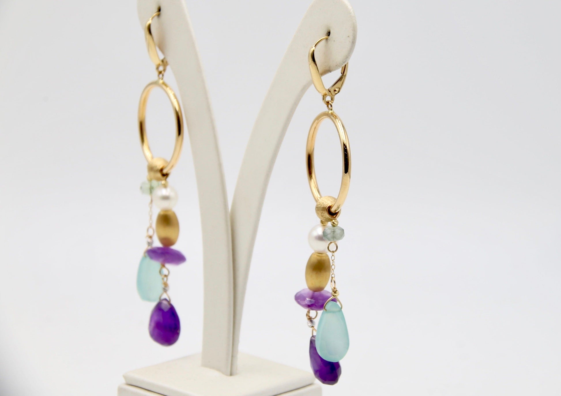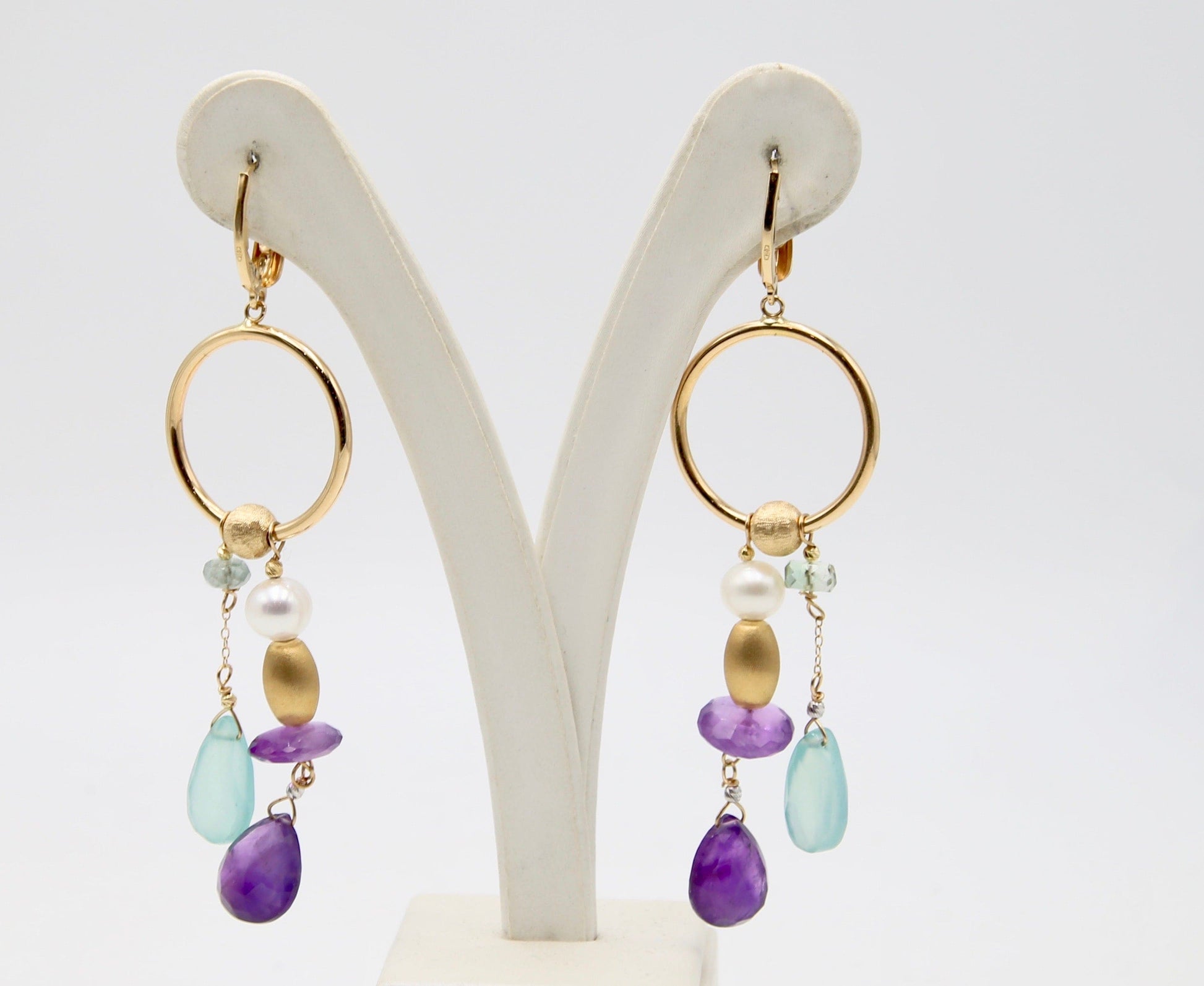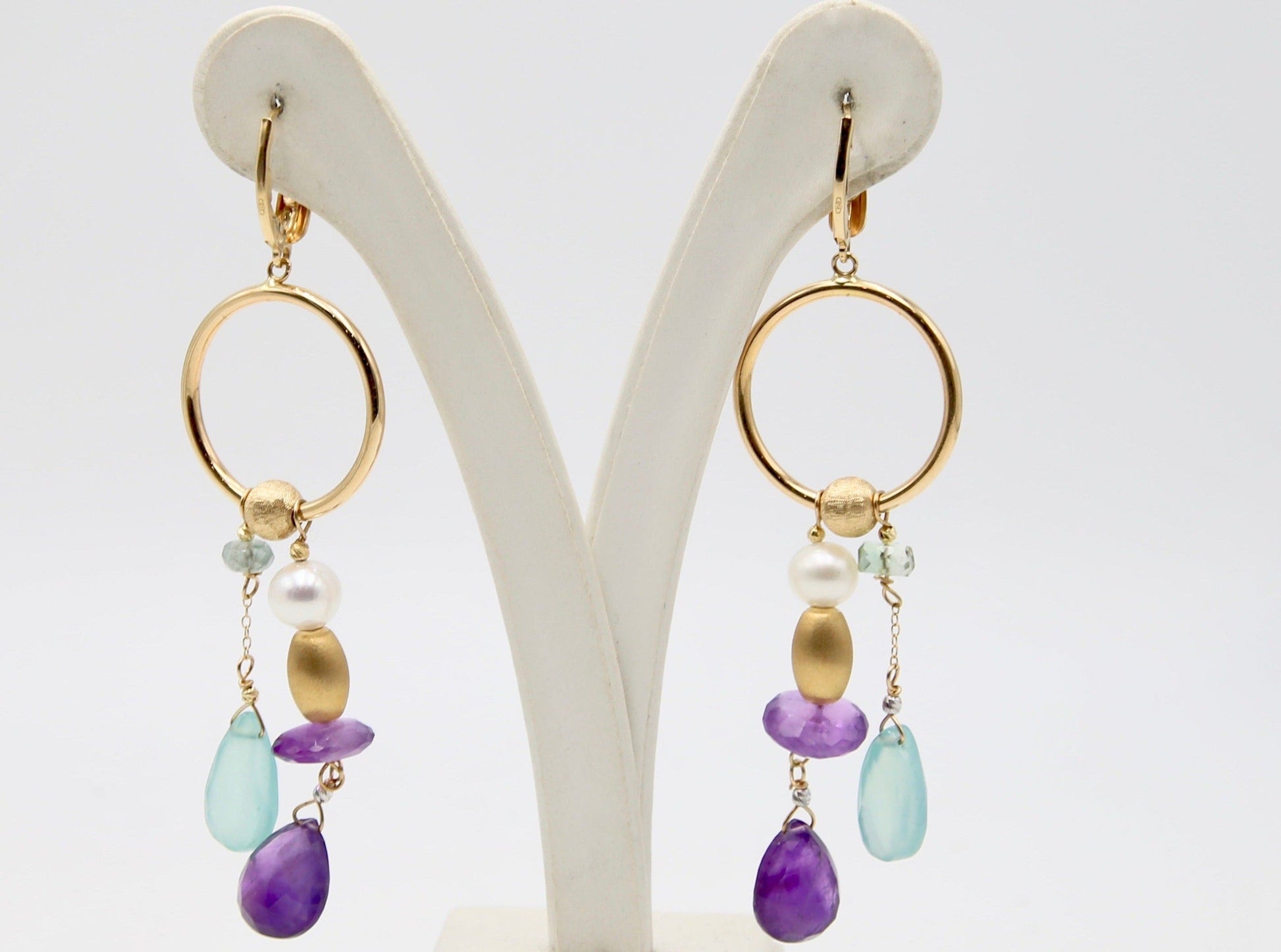 Orecchini cerchi in oro giallo 18kt con due file pendenti di ametista, tormalina, perle e calcedonio.