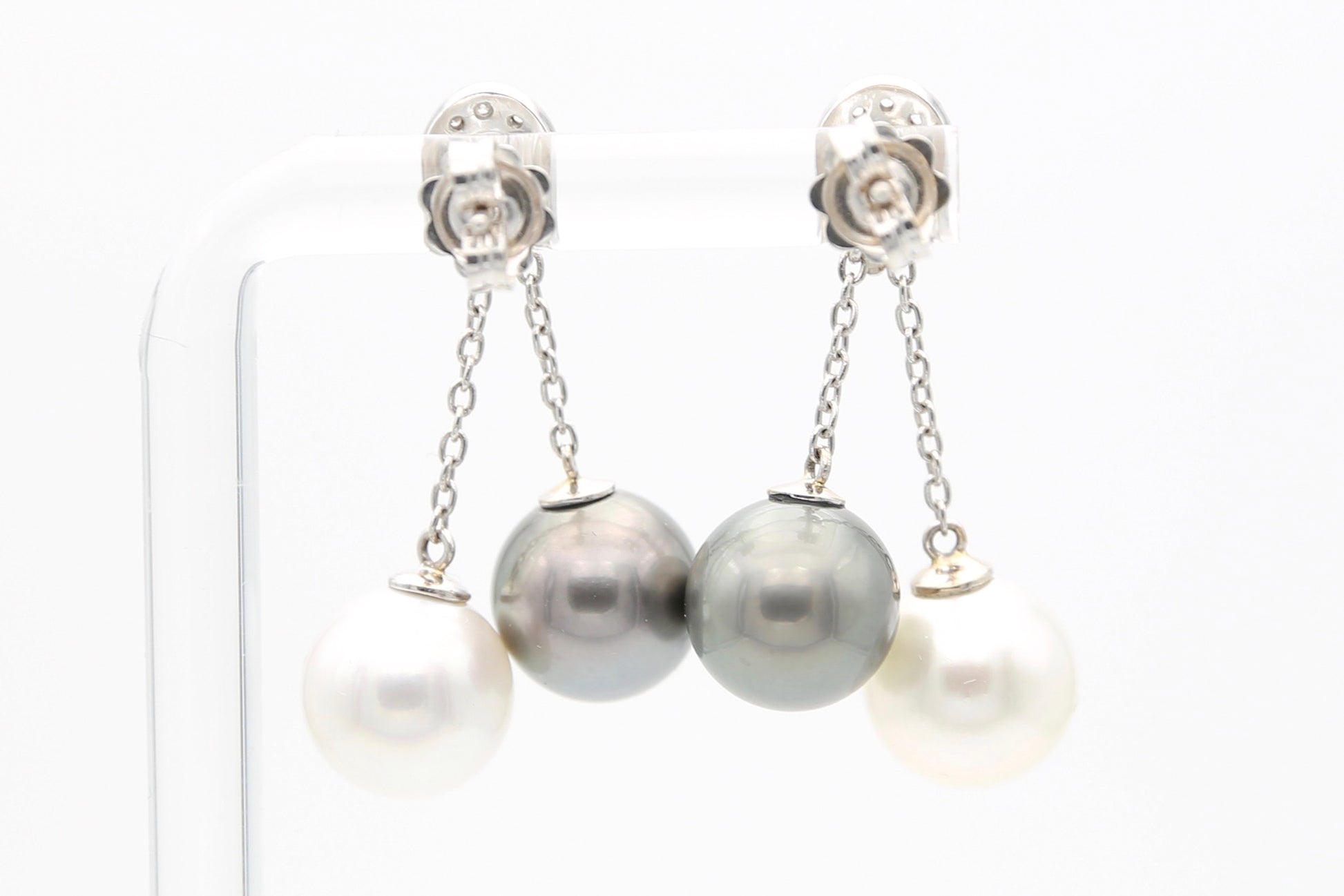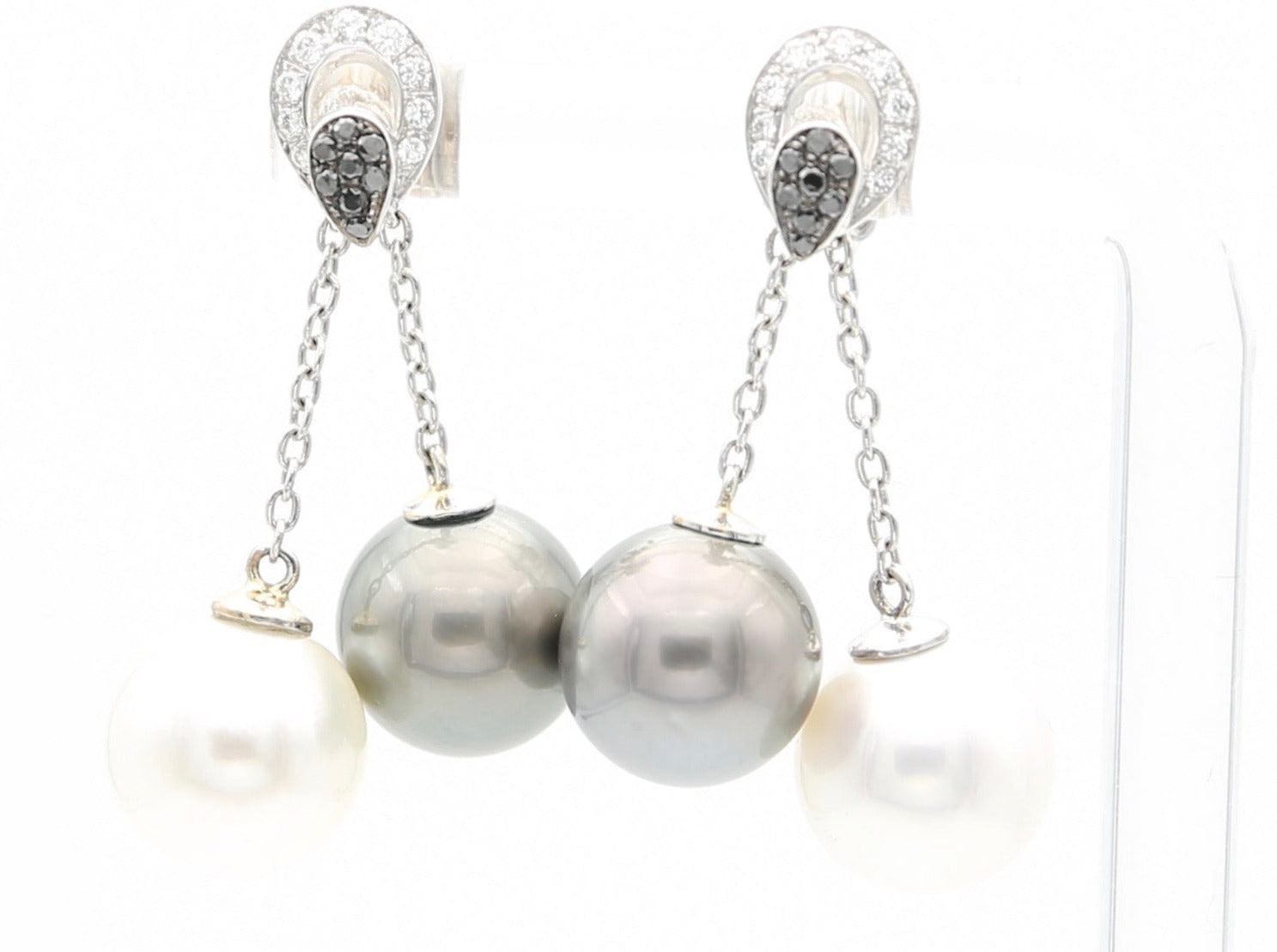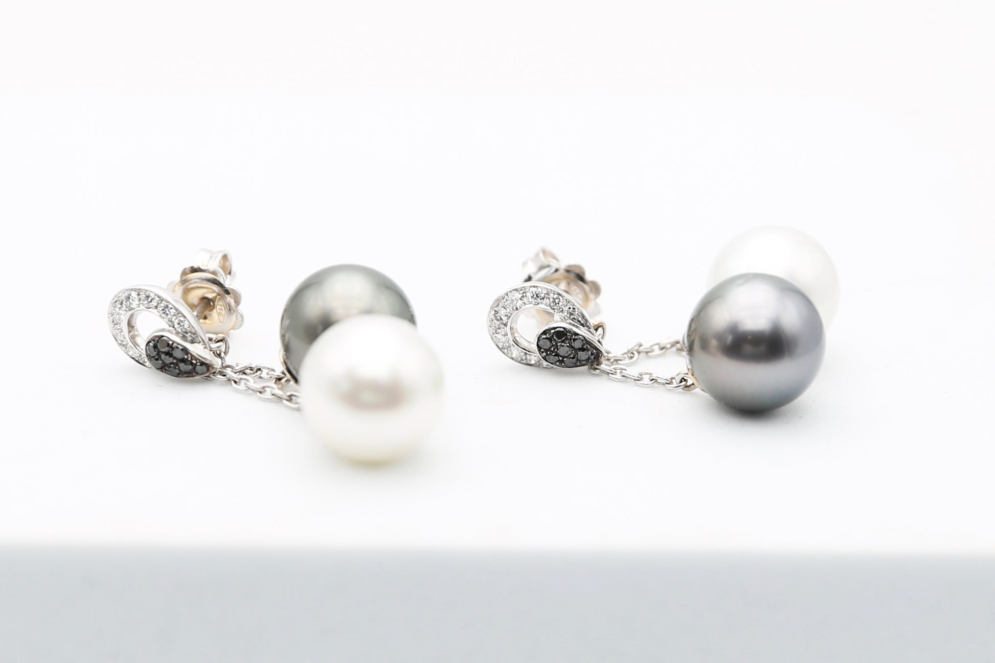 Orecchini in oro bianco 18kt perno e farfalla al lobo una goccia realizzata da un bellissimo contrasto tra diamanti bianchi e neri dalla quale pende una doppia catenella saliscendi che accoglie due perle esaltando un luminoso contrasto di bianco e nero.