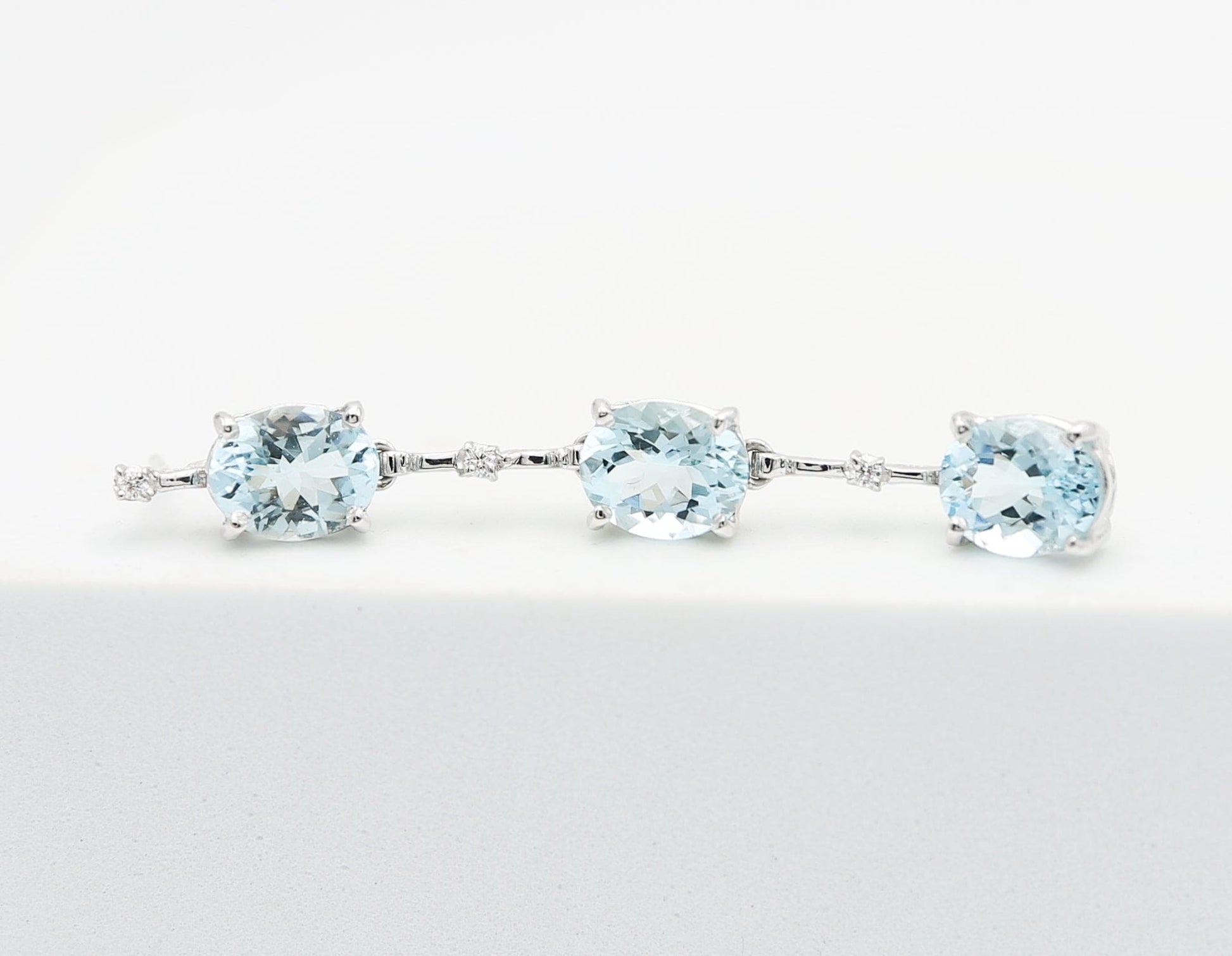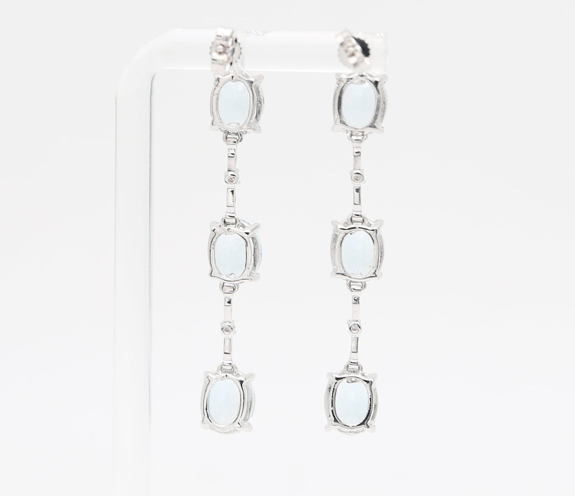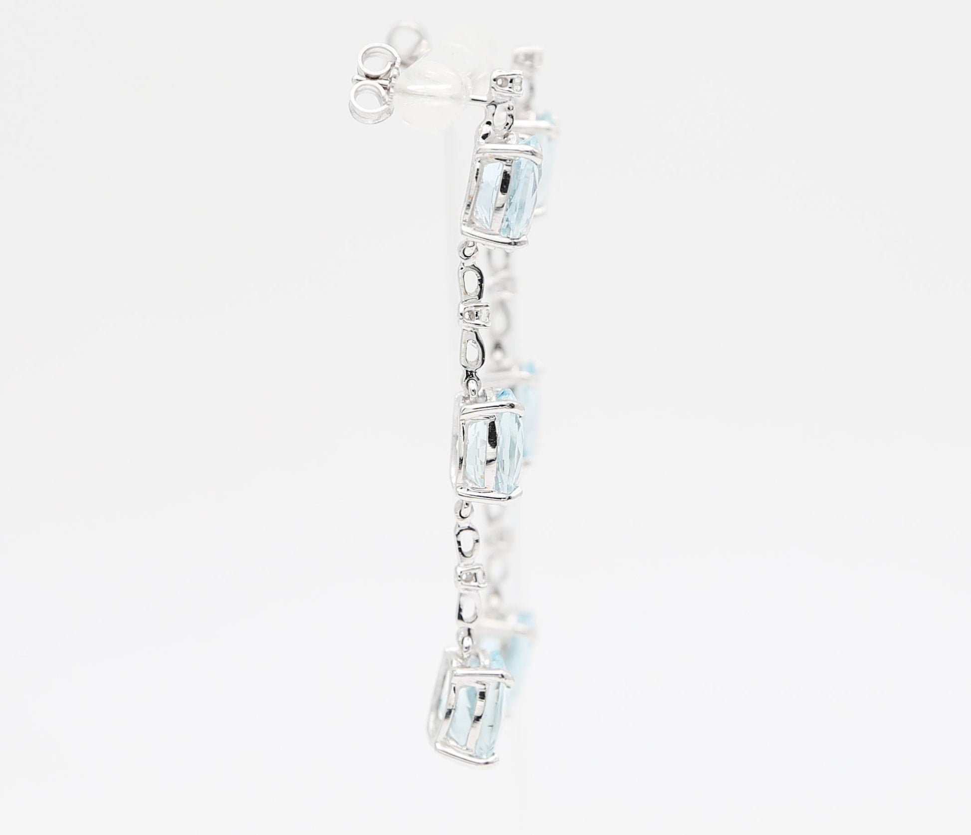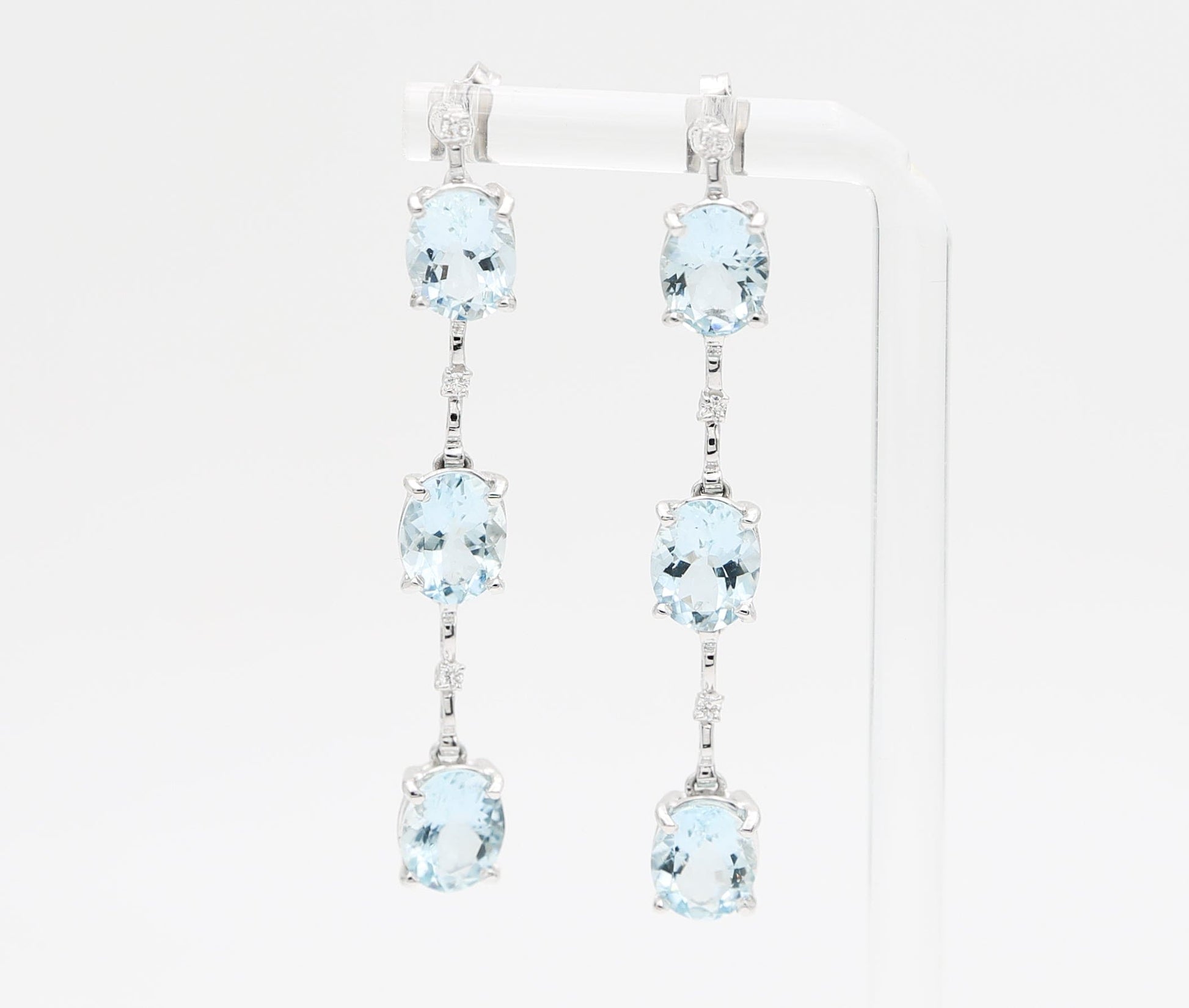 Orecchini pendenti in oro bianco 18 kt con sei acquamarine delicate alternate a sei diamanti brillanti.