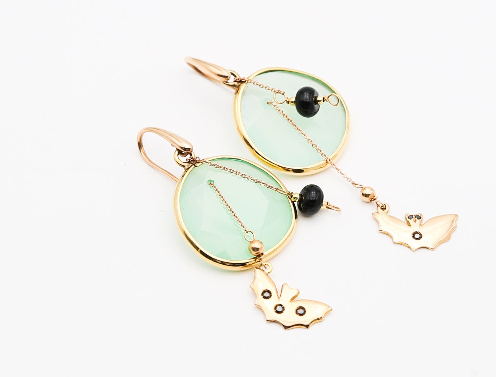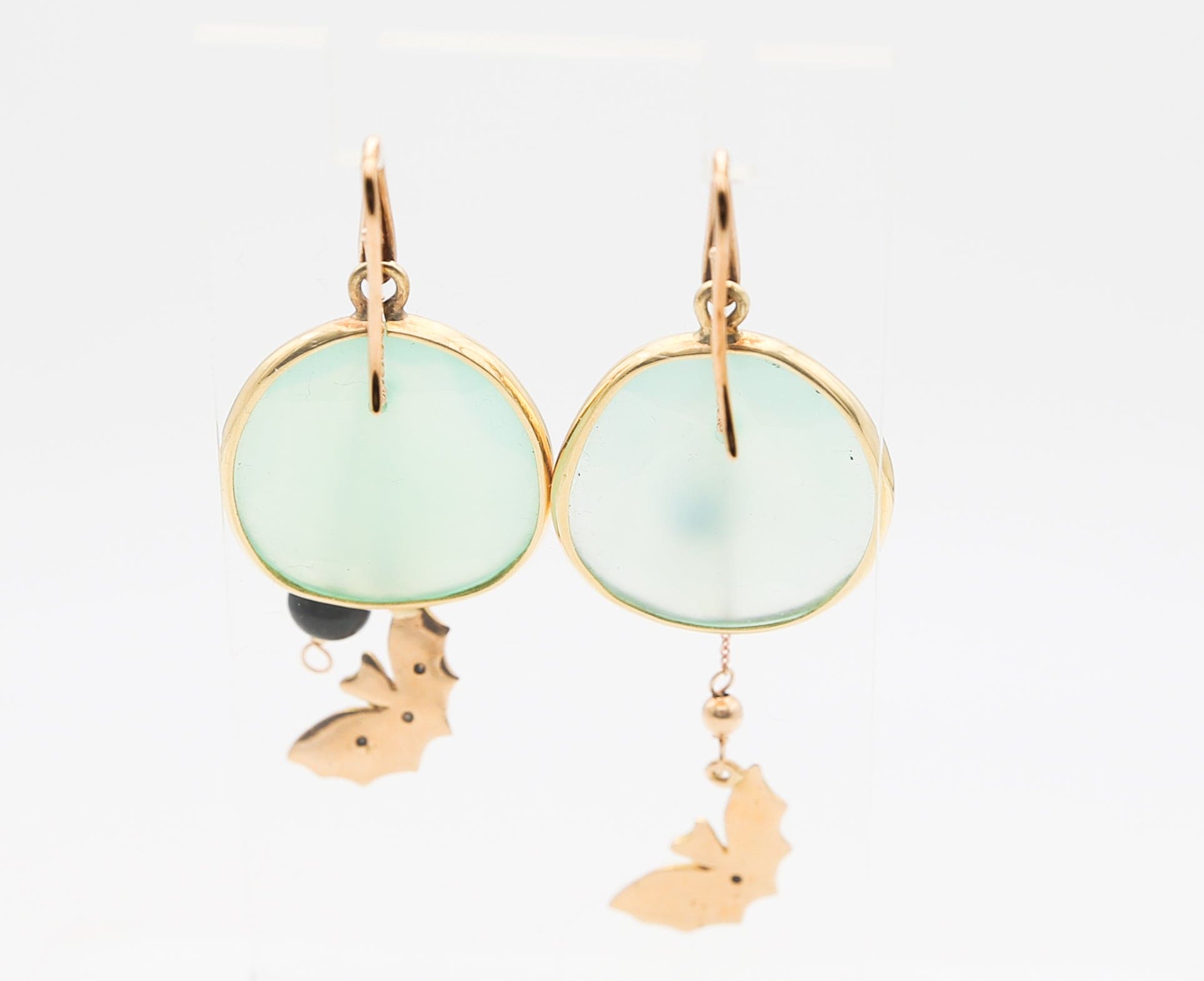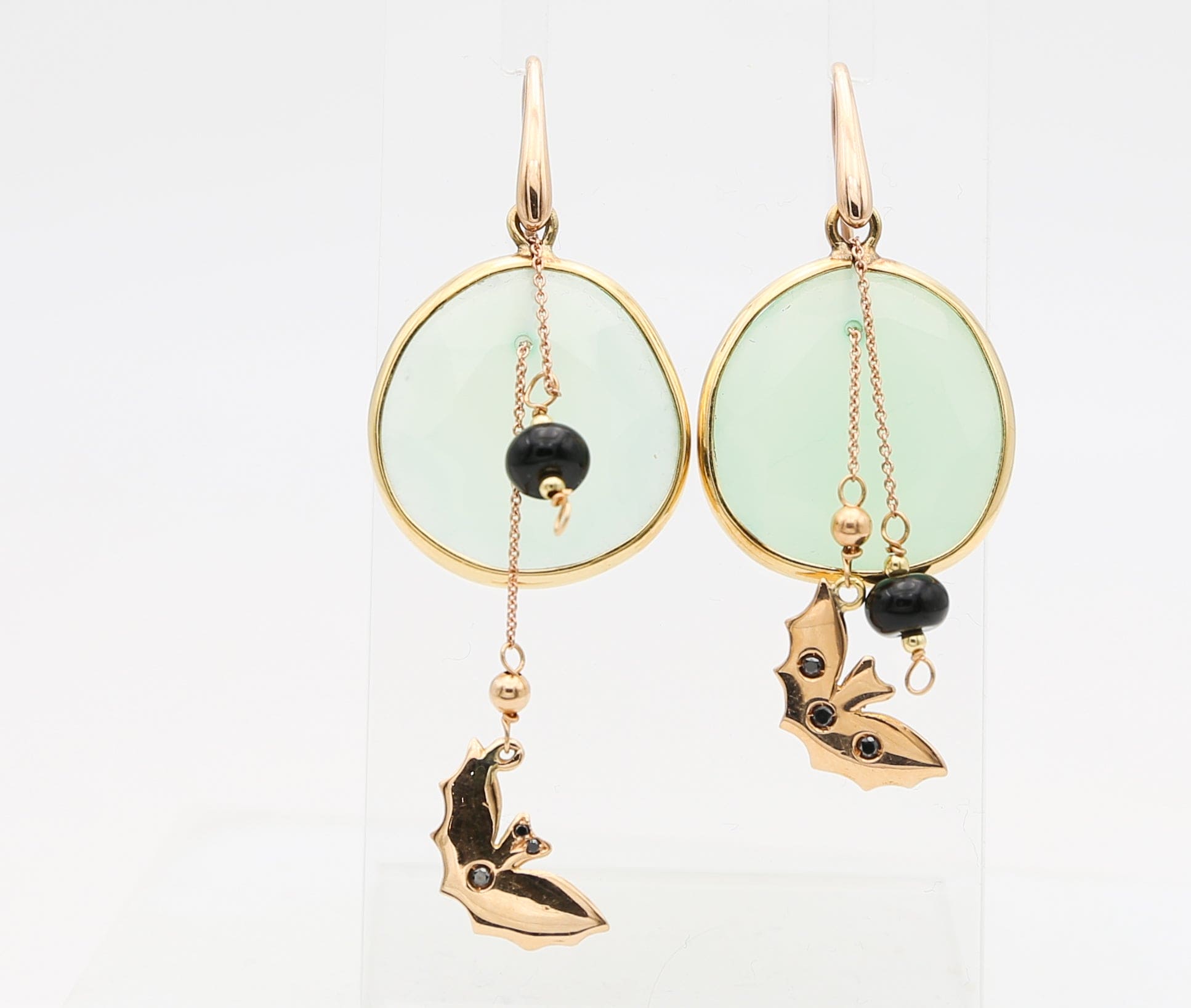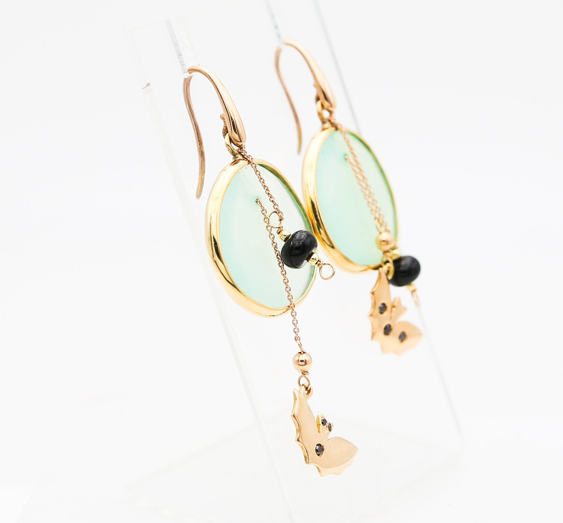Orecchini in oro giallo e rosa 18 kt con pendenti a forma di animali impreziositi da zaffiri e calcedonio che uniscono l'eleganza del design con la brillantezza delle pietre preziose, creando un gioiello sofisticato e originale.