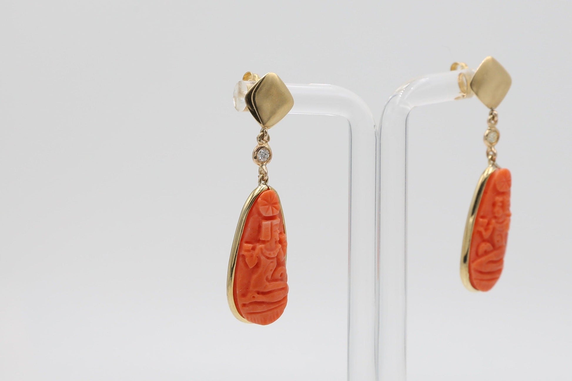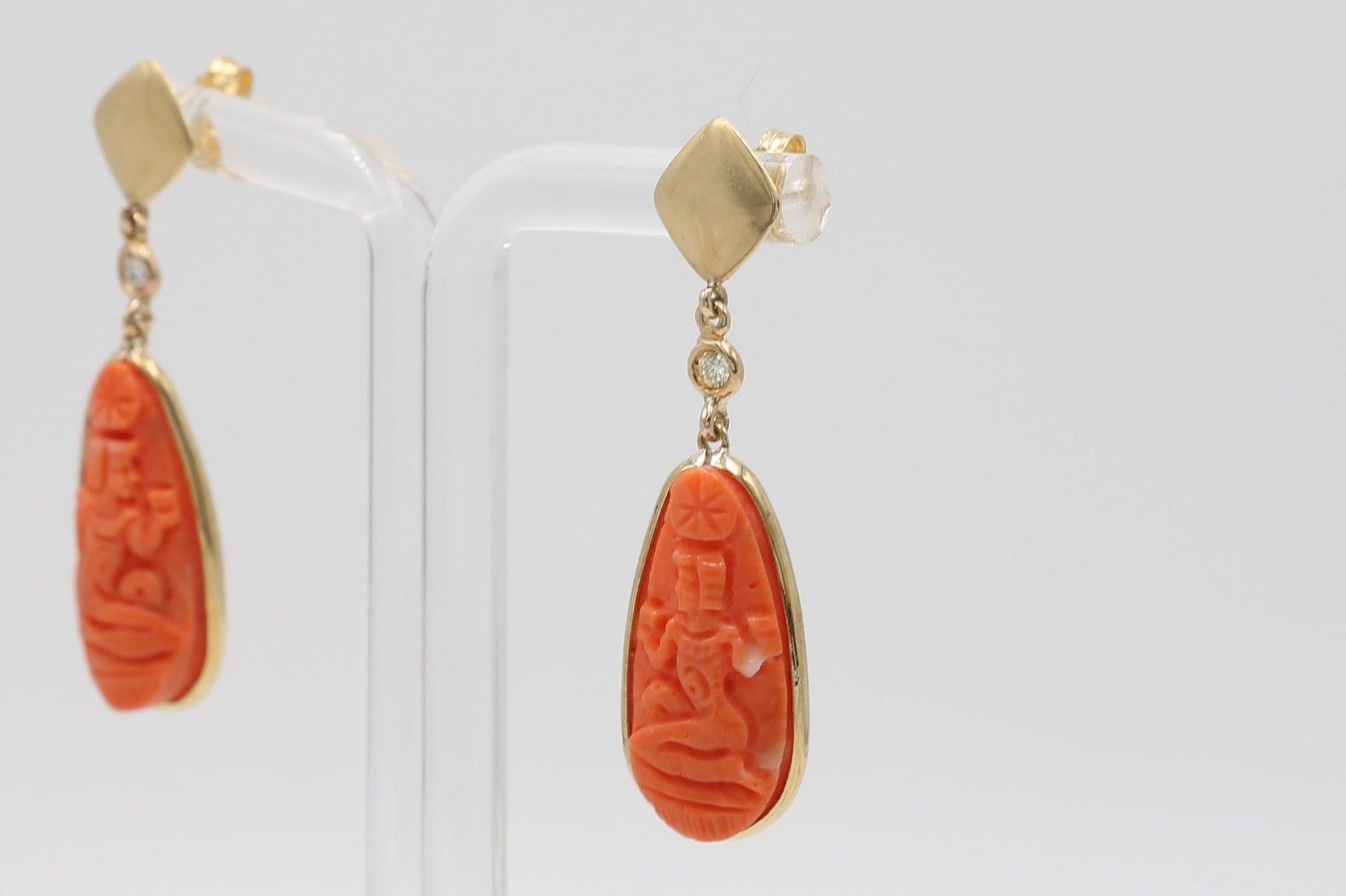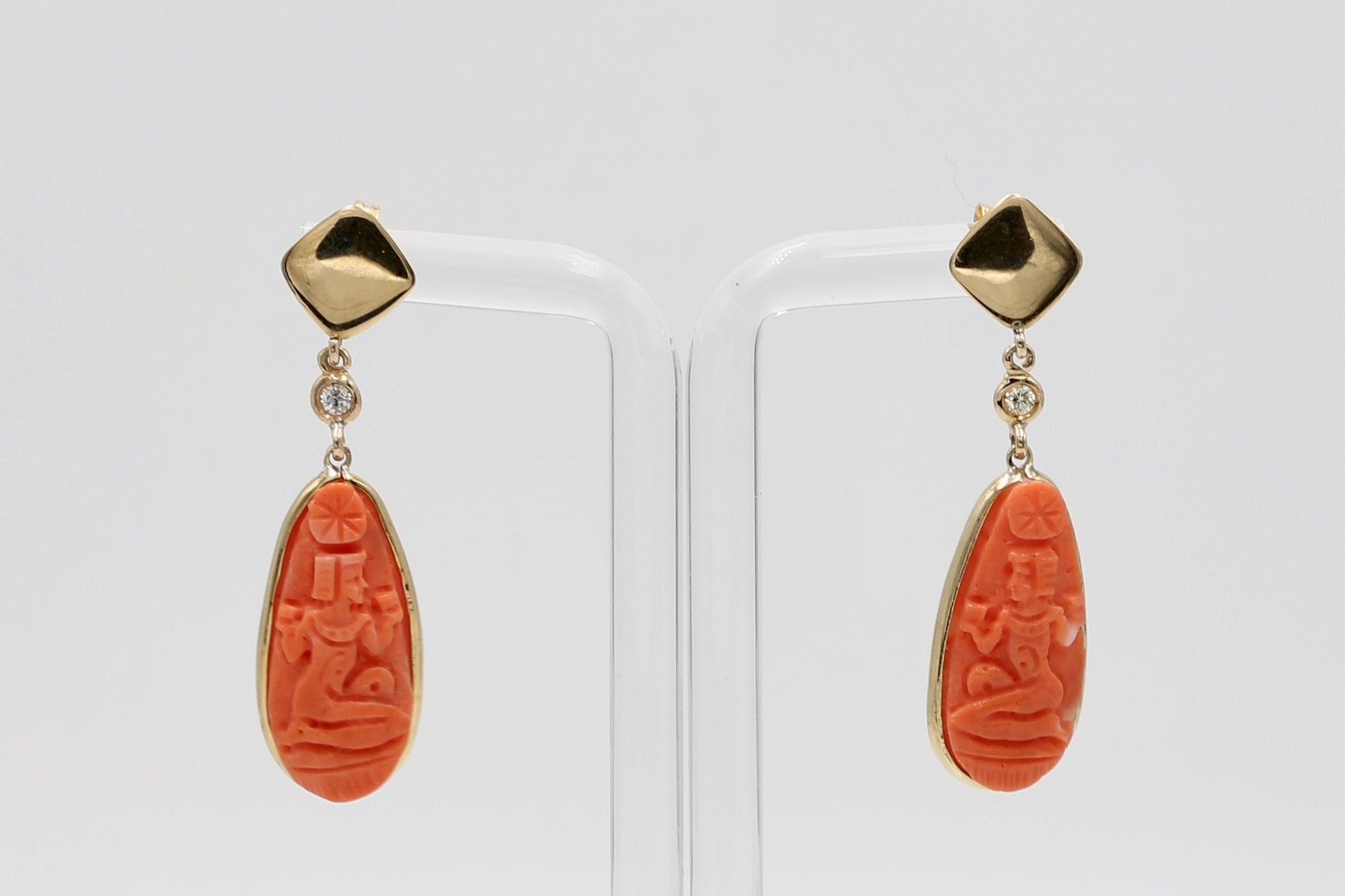 Bellissimi orecchini pendenti con 2 coralli giapponesi incisi raffiguranti il corpo di donna impreziositi da 2 brillanti e castoni oro realizzati a mano.