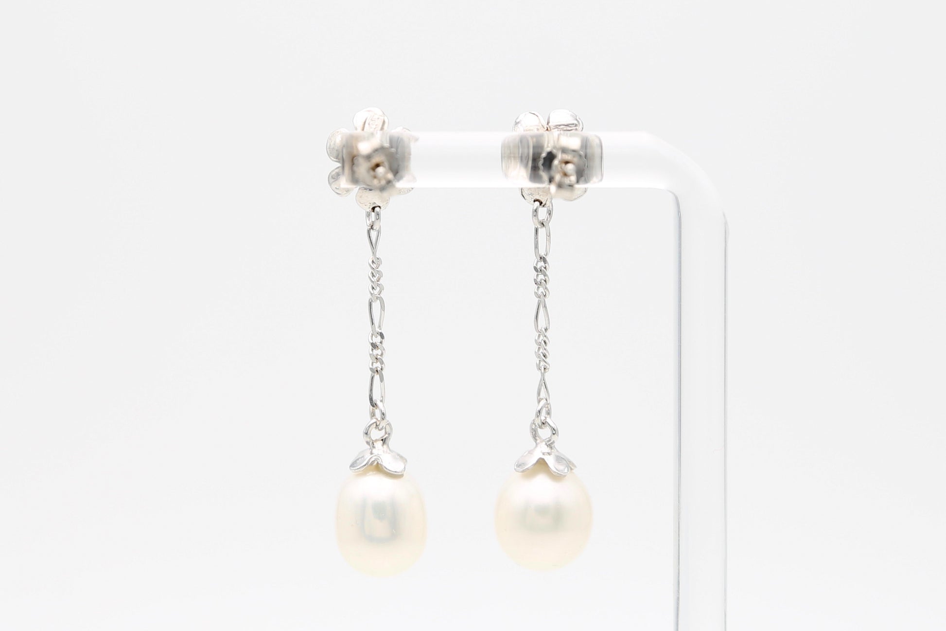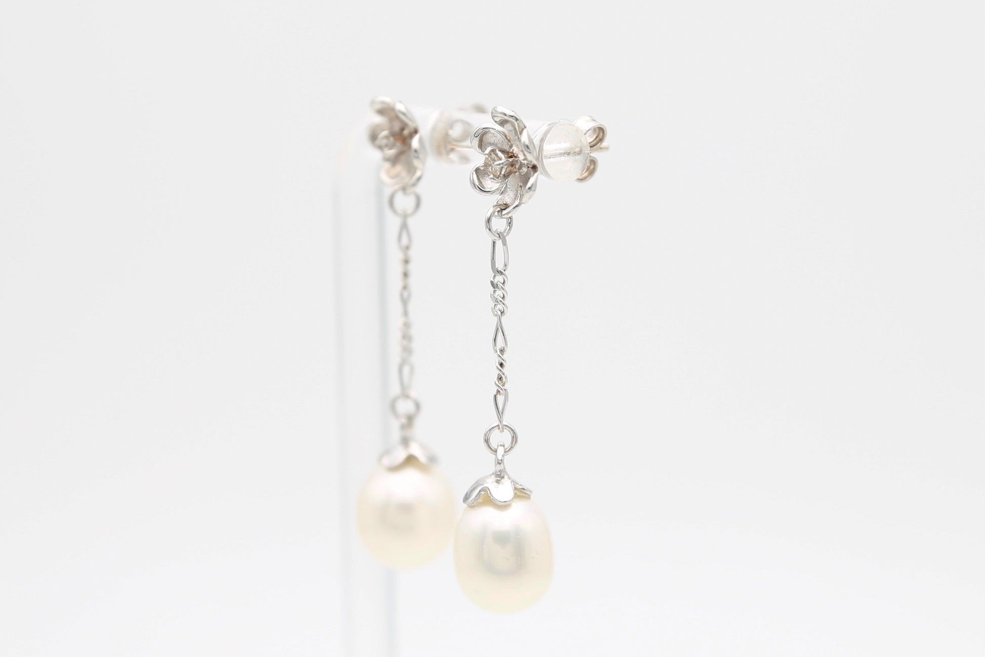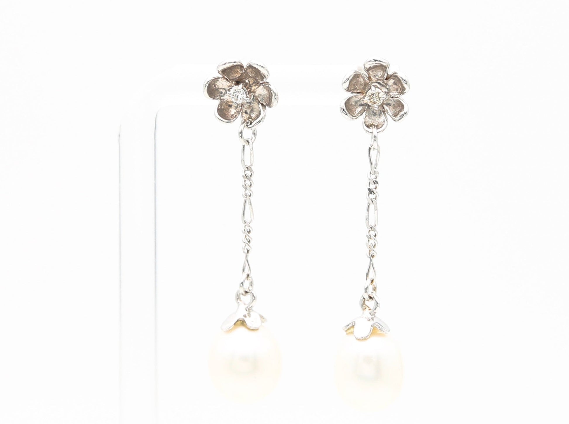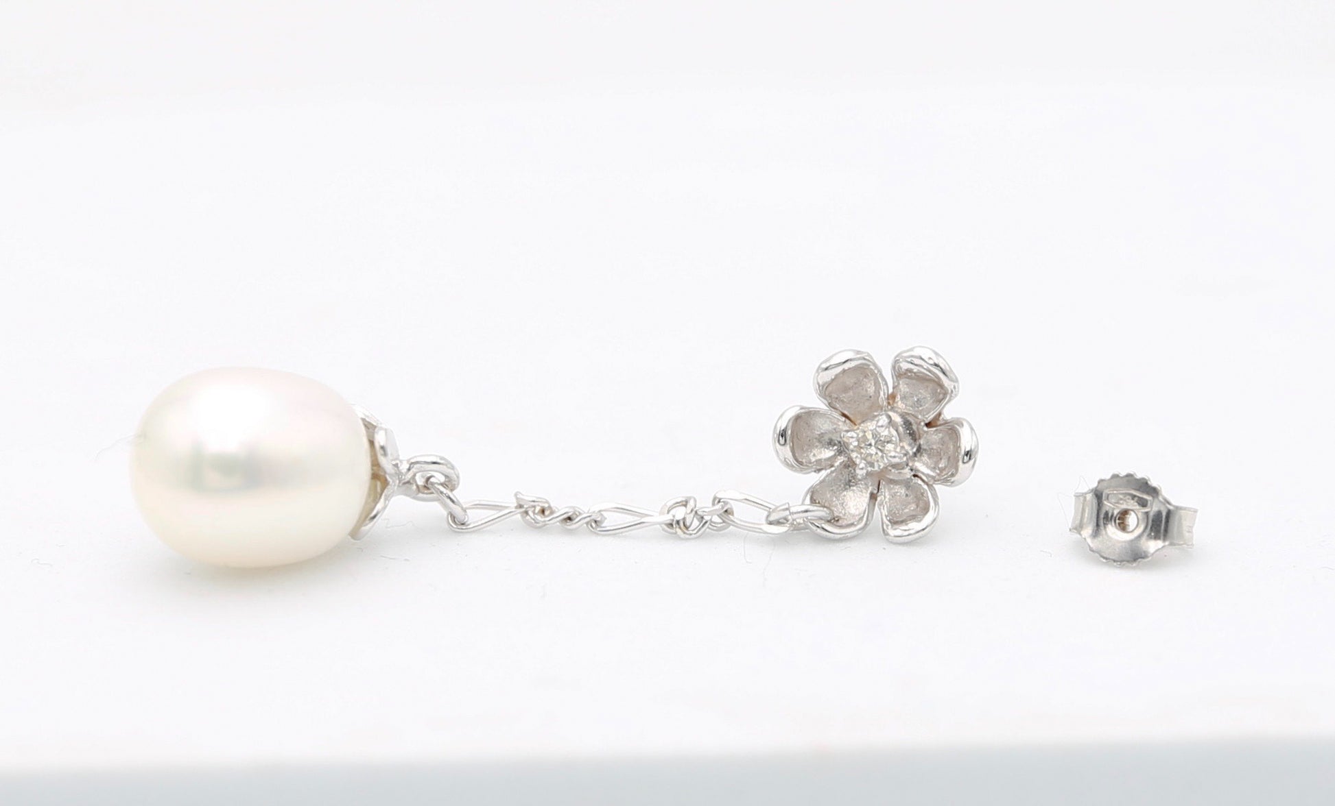 Orecchini in oro bianco 18kt farfalla e perno fiorellini incastonati con diamanti e catenella pendente con perle bianche e luminose.
