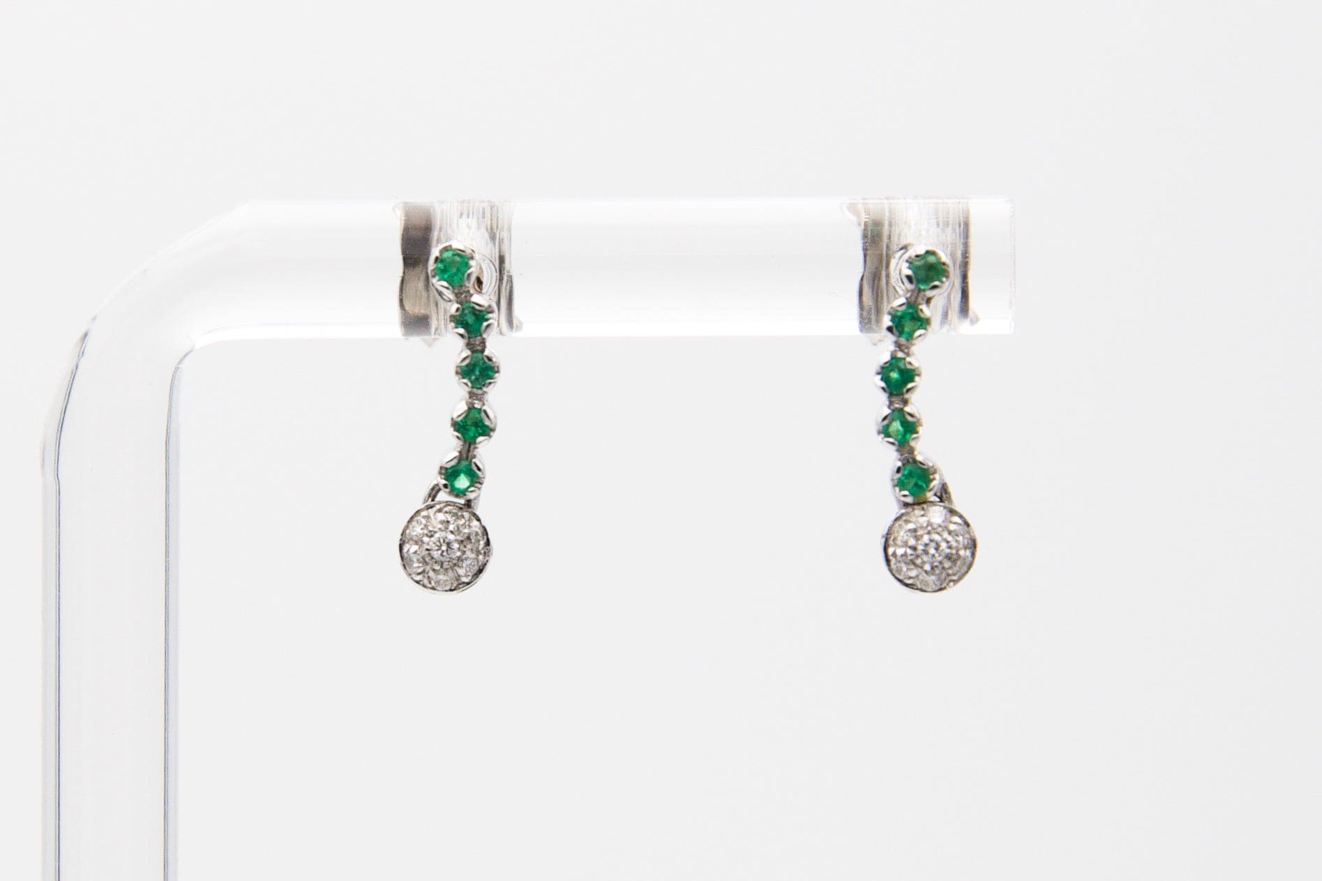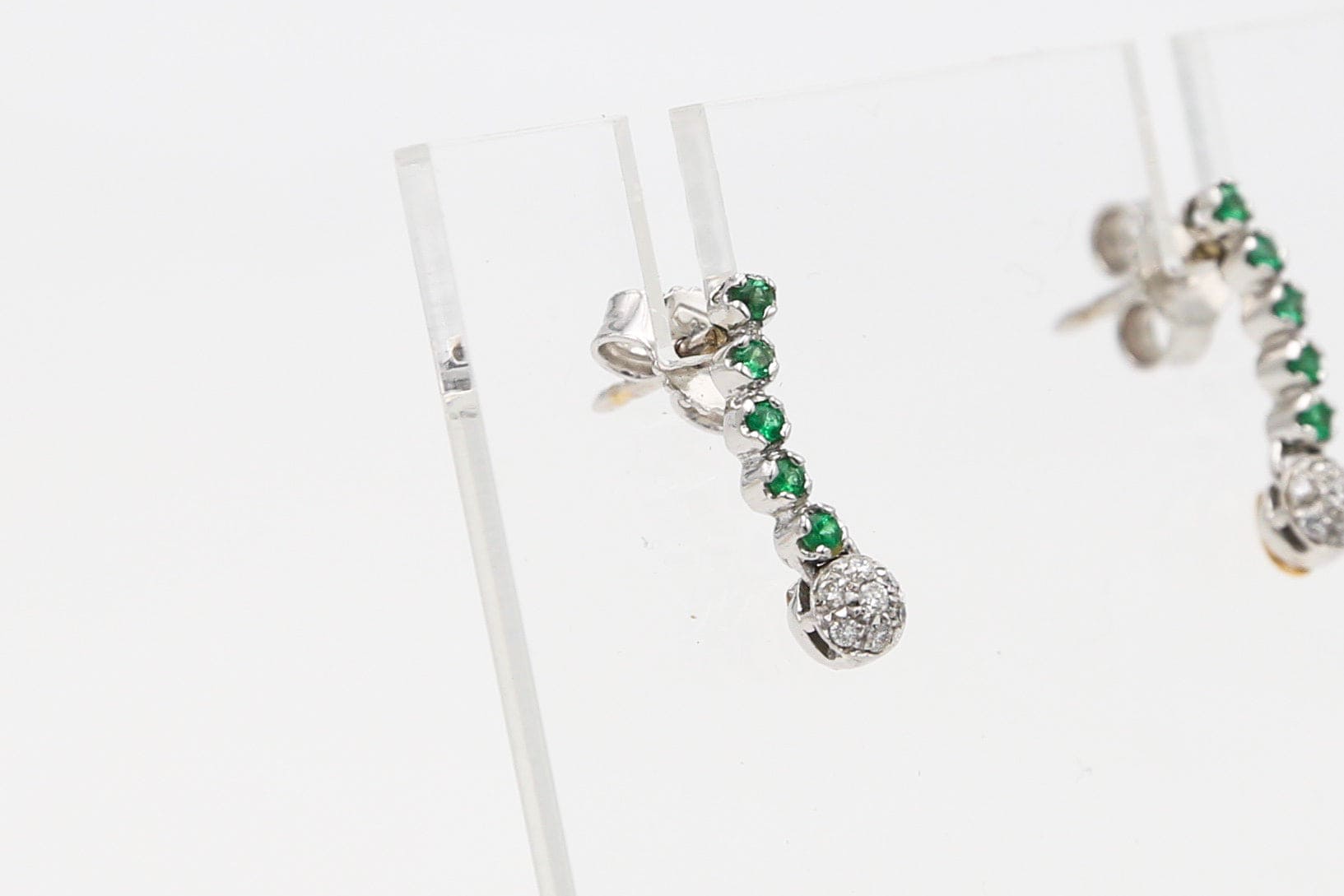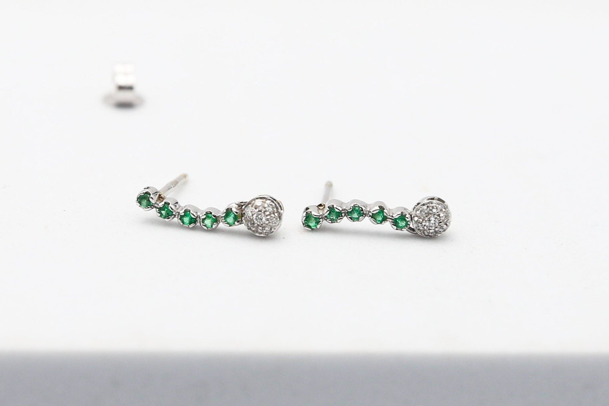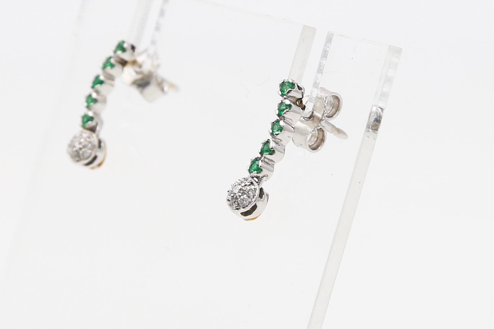 Delicato orecchino semirigido con diamanti e smeraldi verde intenso incastonati in oro bianco 18kt con pavè di diamanti.
