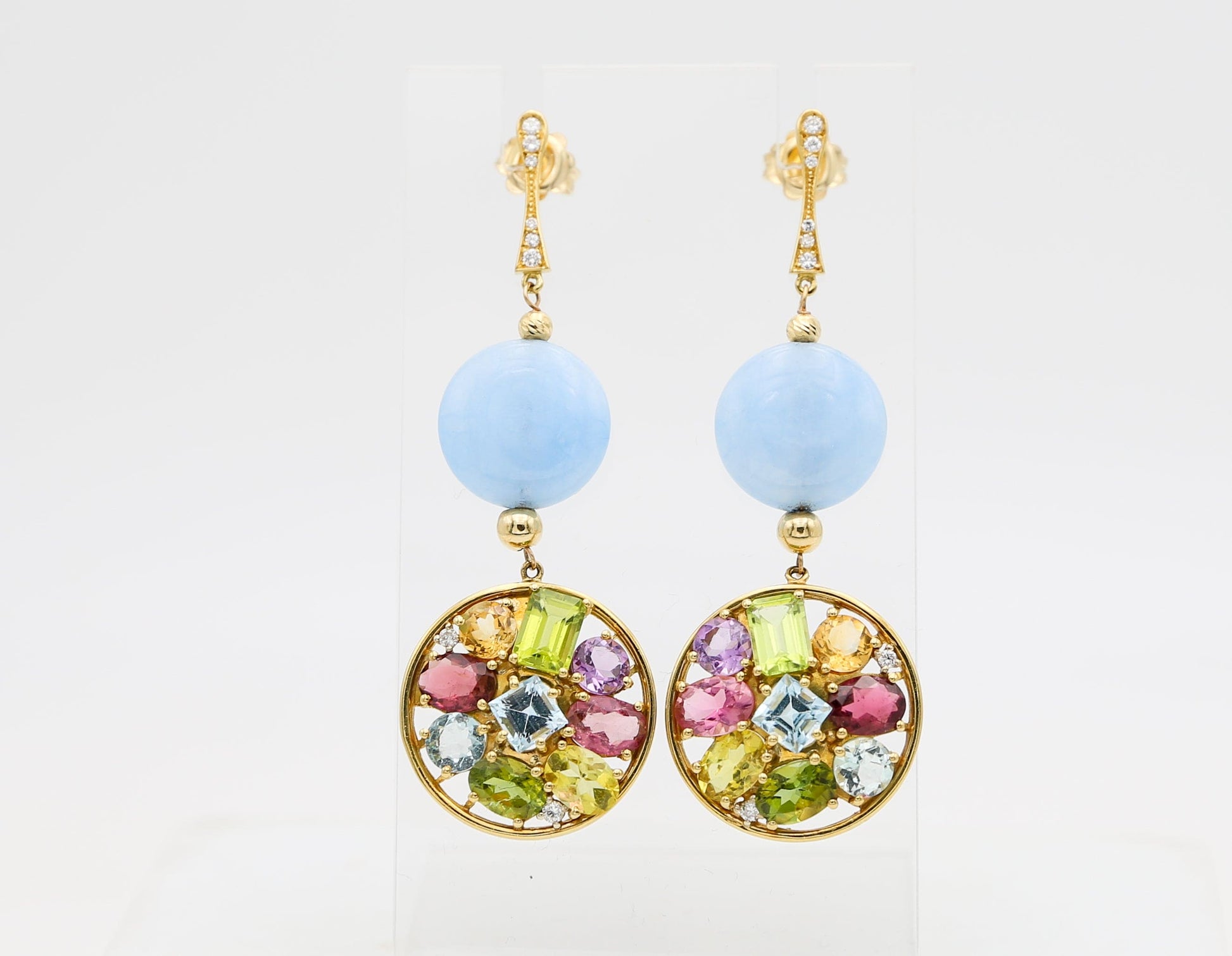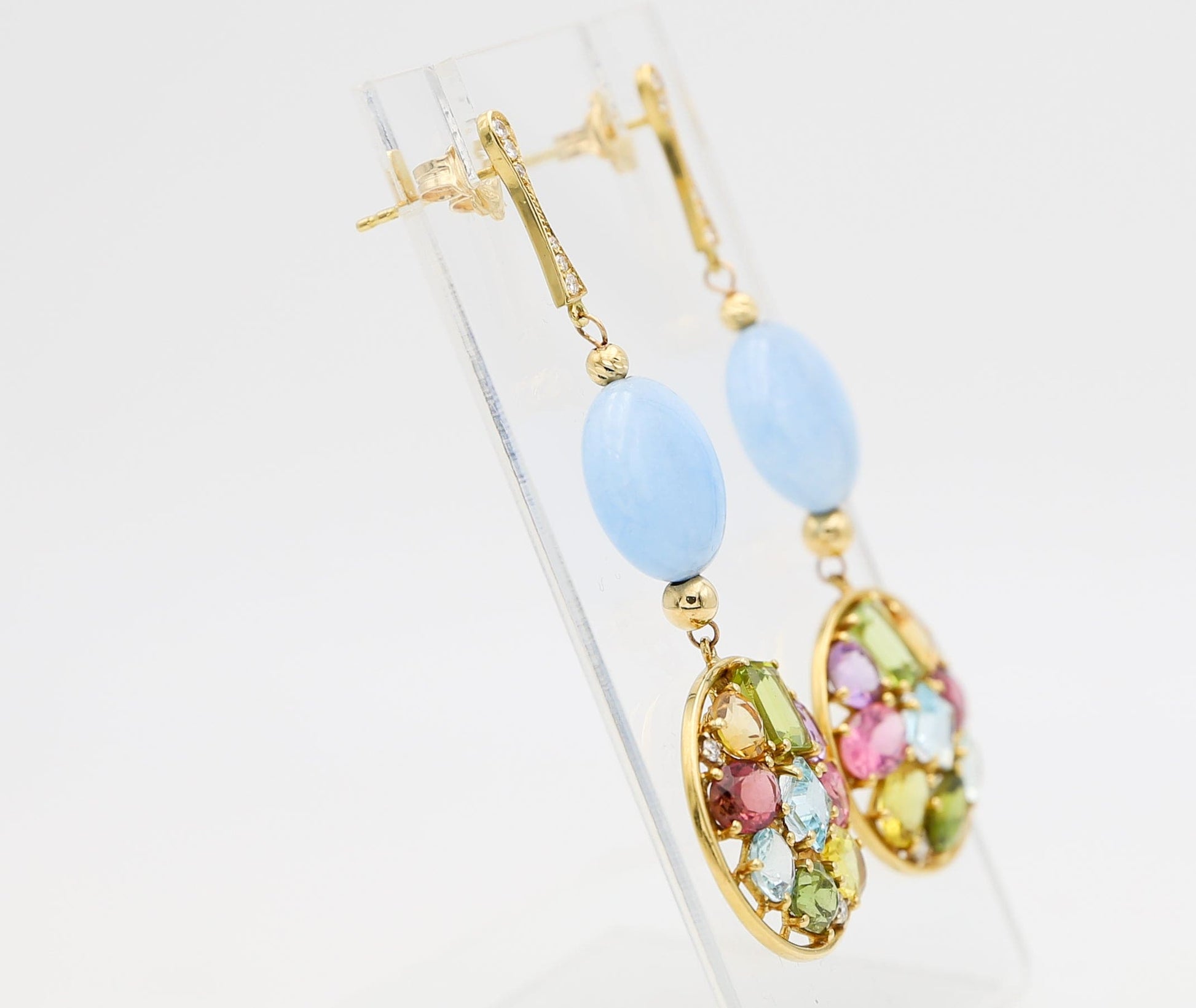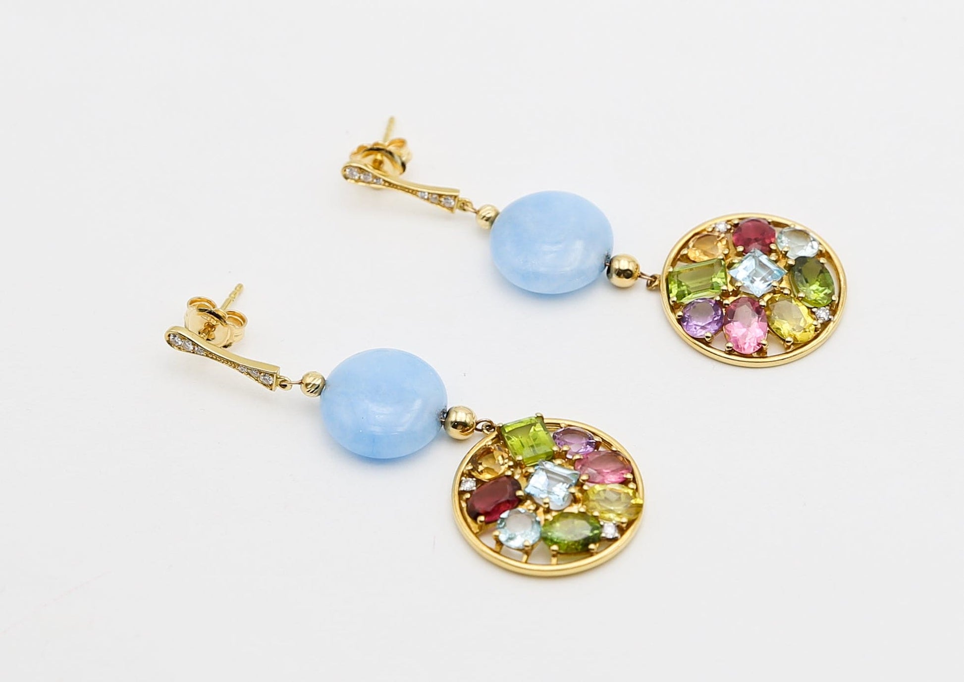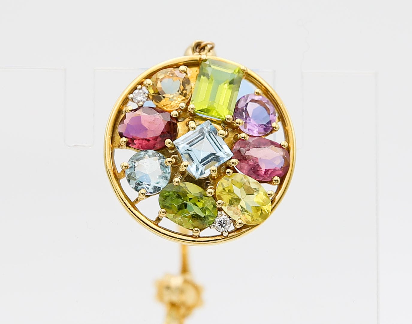 Orecchini in oro giallo 18 kt con barrette di diamanti al lobo e pendenti a cerchio impreziositi da una selezione di pietre preziose, tra cui peridoti, citrini, tormaline, ametiste e acquamarine che offrono un design elegante e brillante, perfetto per ogni occasione speciale.