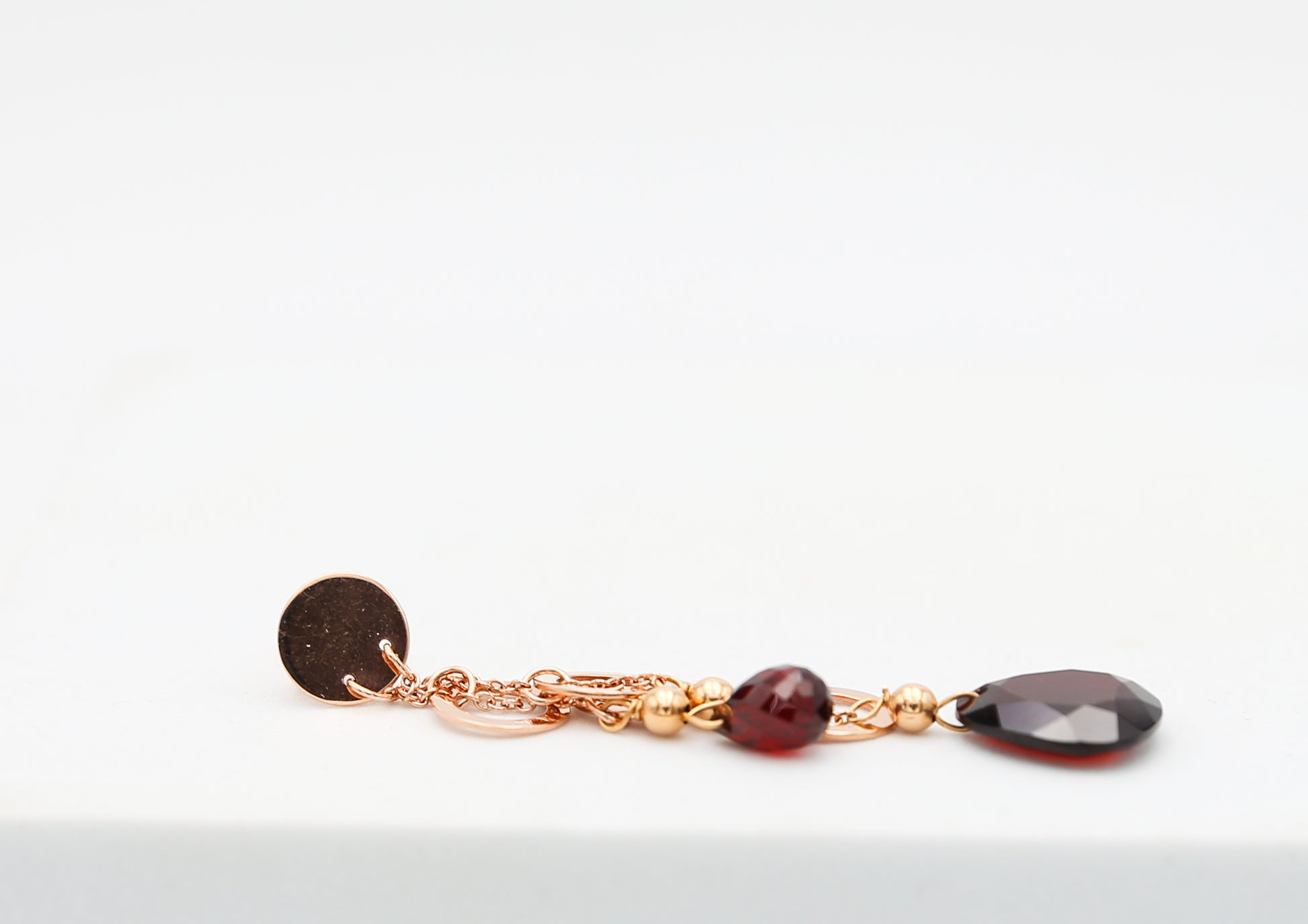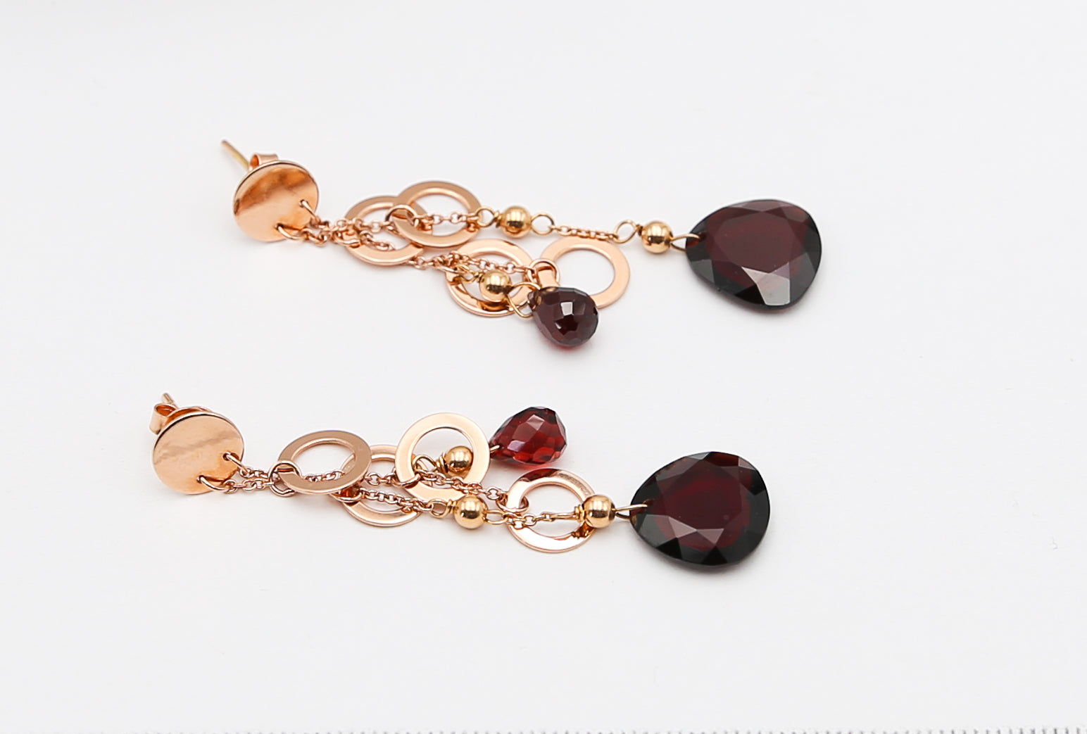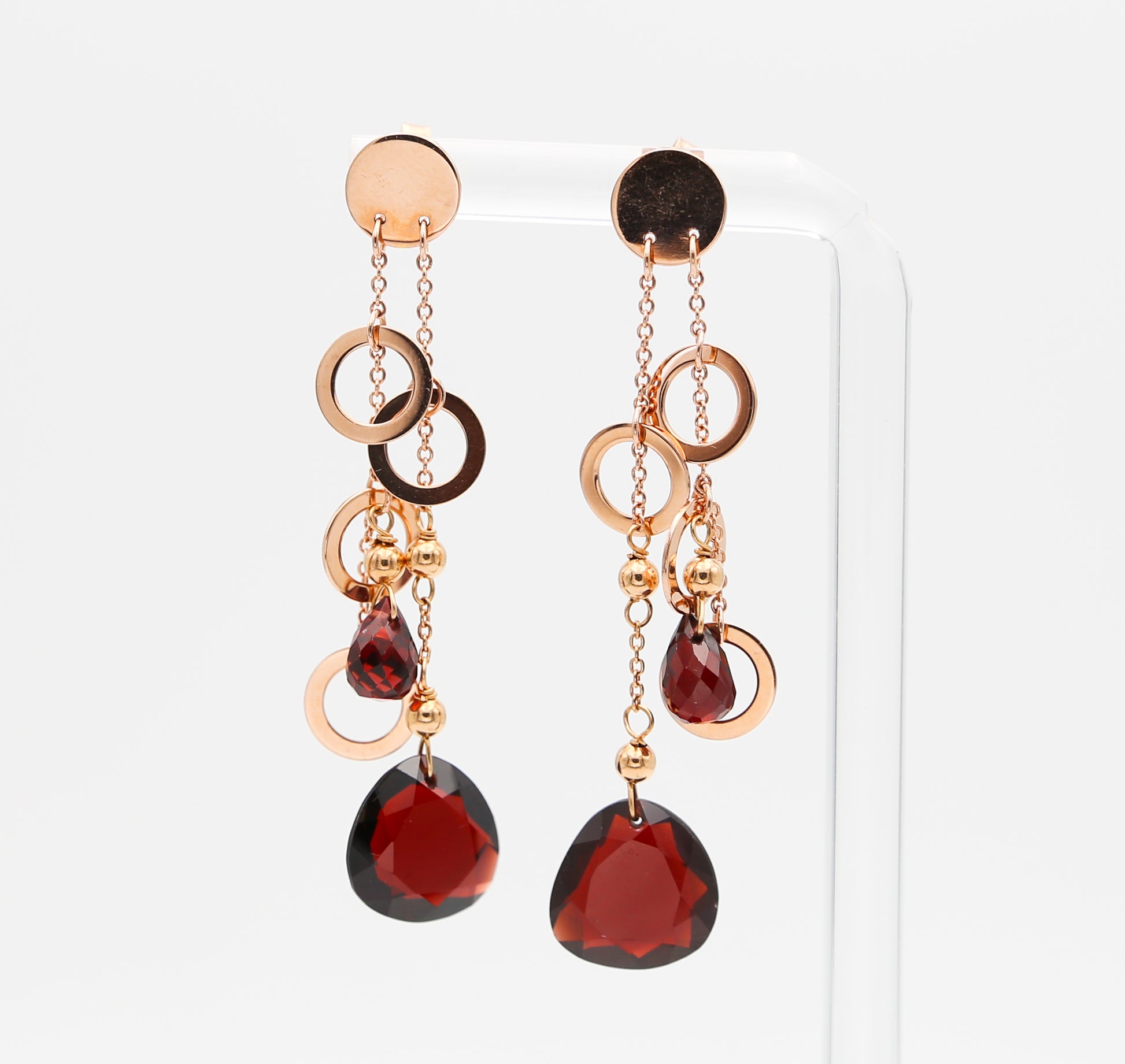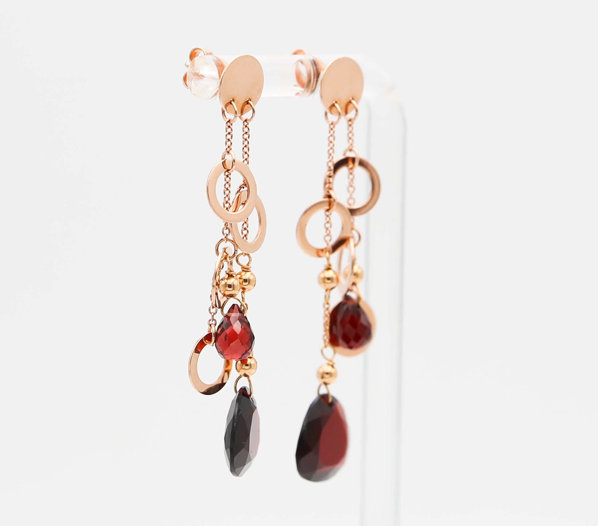 Orecchini in oro rosa con perno e farfalla, caratterizzati da pendenti in cerchietti raccordati con catenelle rollò e gocce di granato.