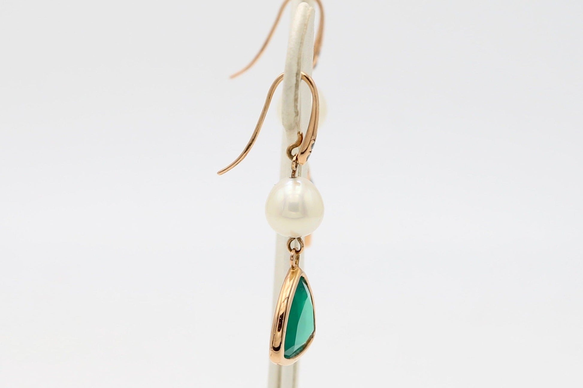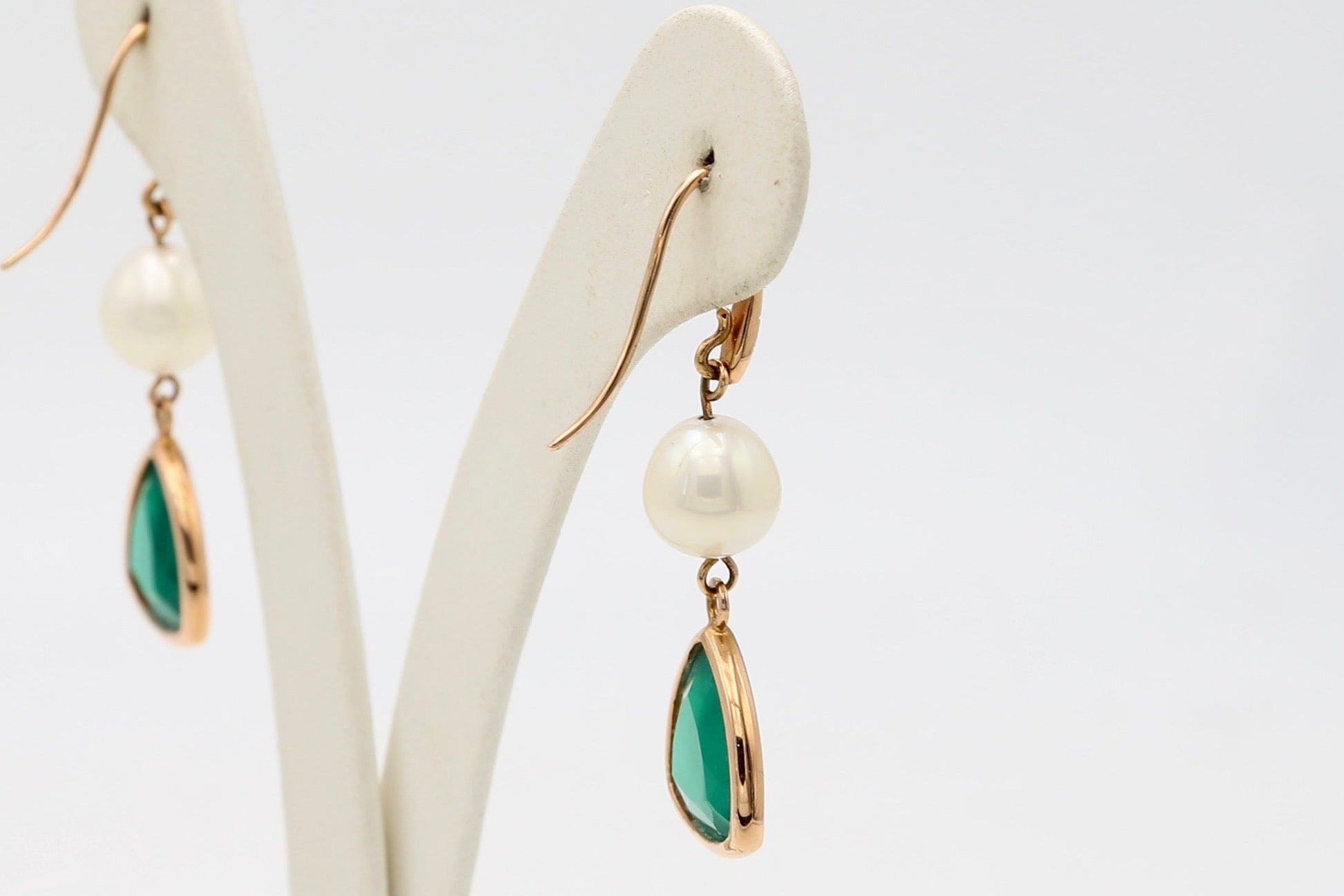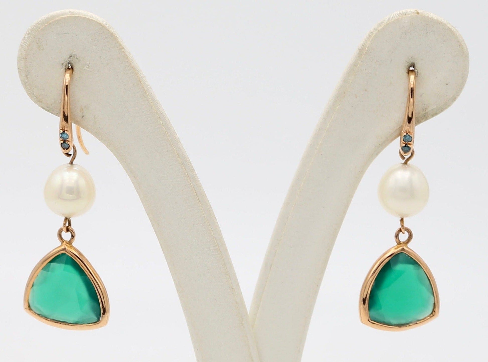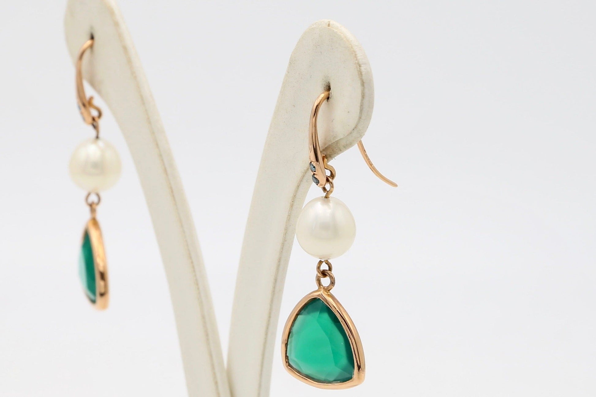 I pendenti sono stati realizzati con perle e calcedonio verde, il tutto disposto armonicamente dai nostri designer