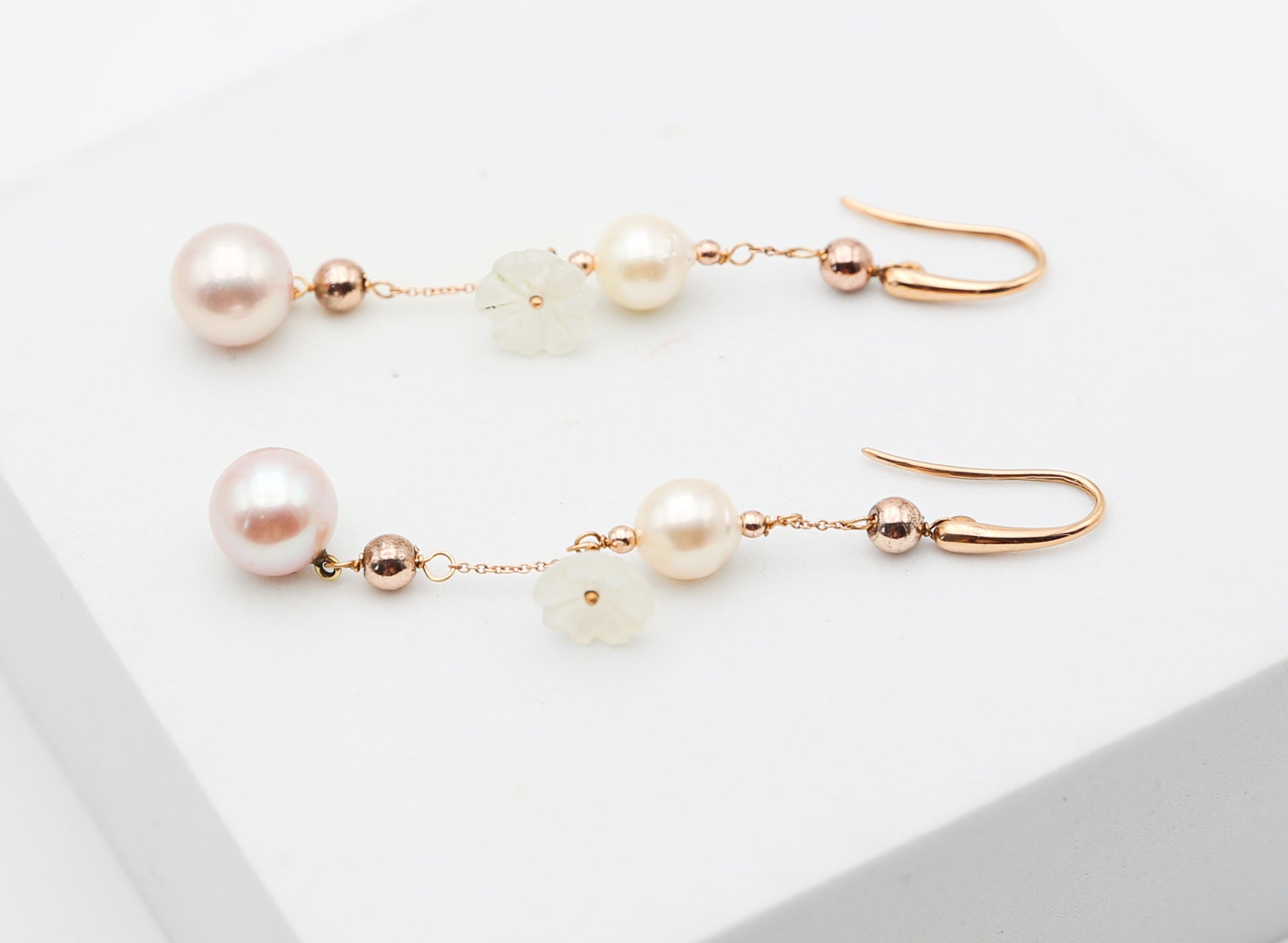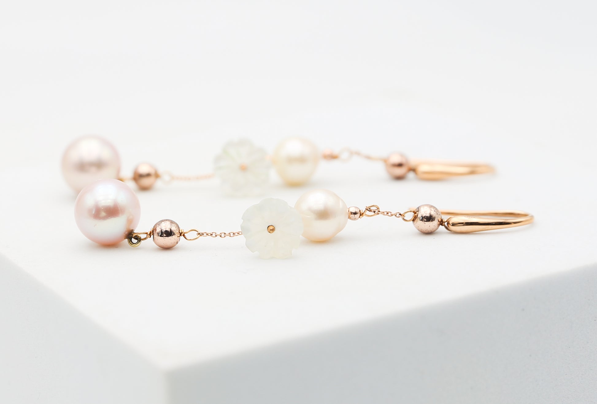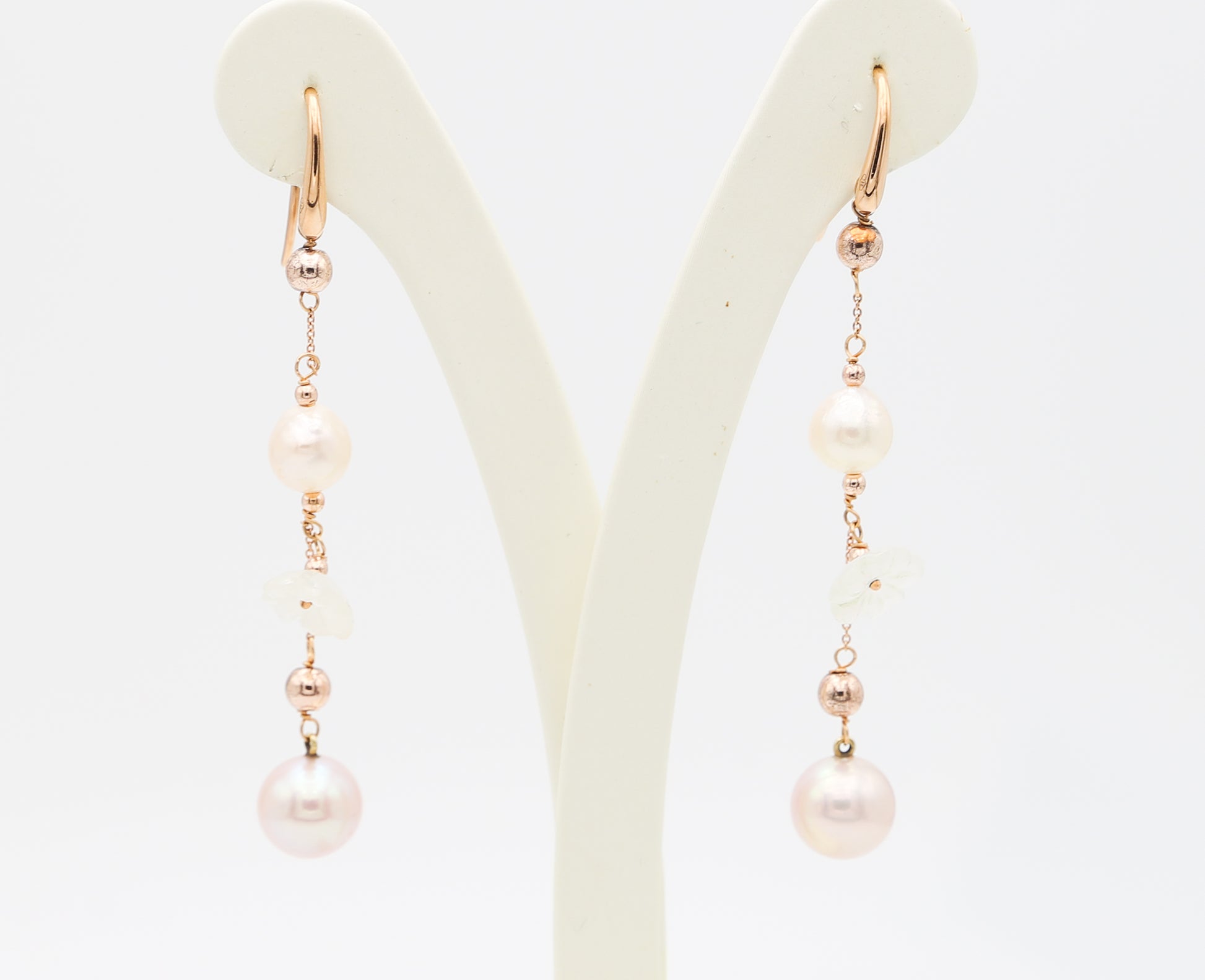 Orecchini in oro rosa 18 kt con eleganti perle pendenti: due raffinate perle Akoya e due perle di acqua dolce, impreziositi da calcedonio.