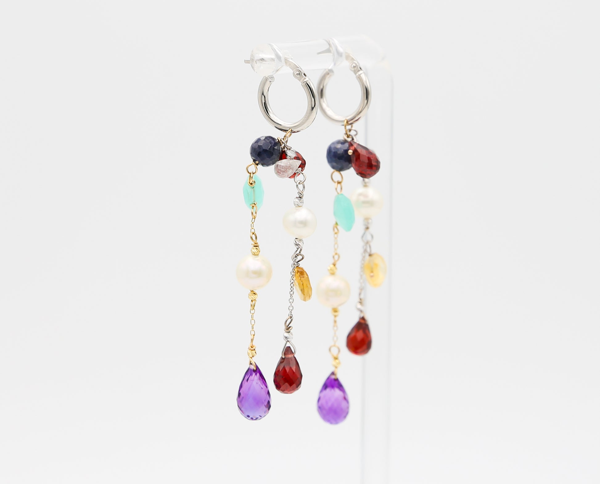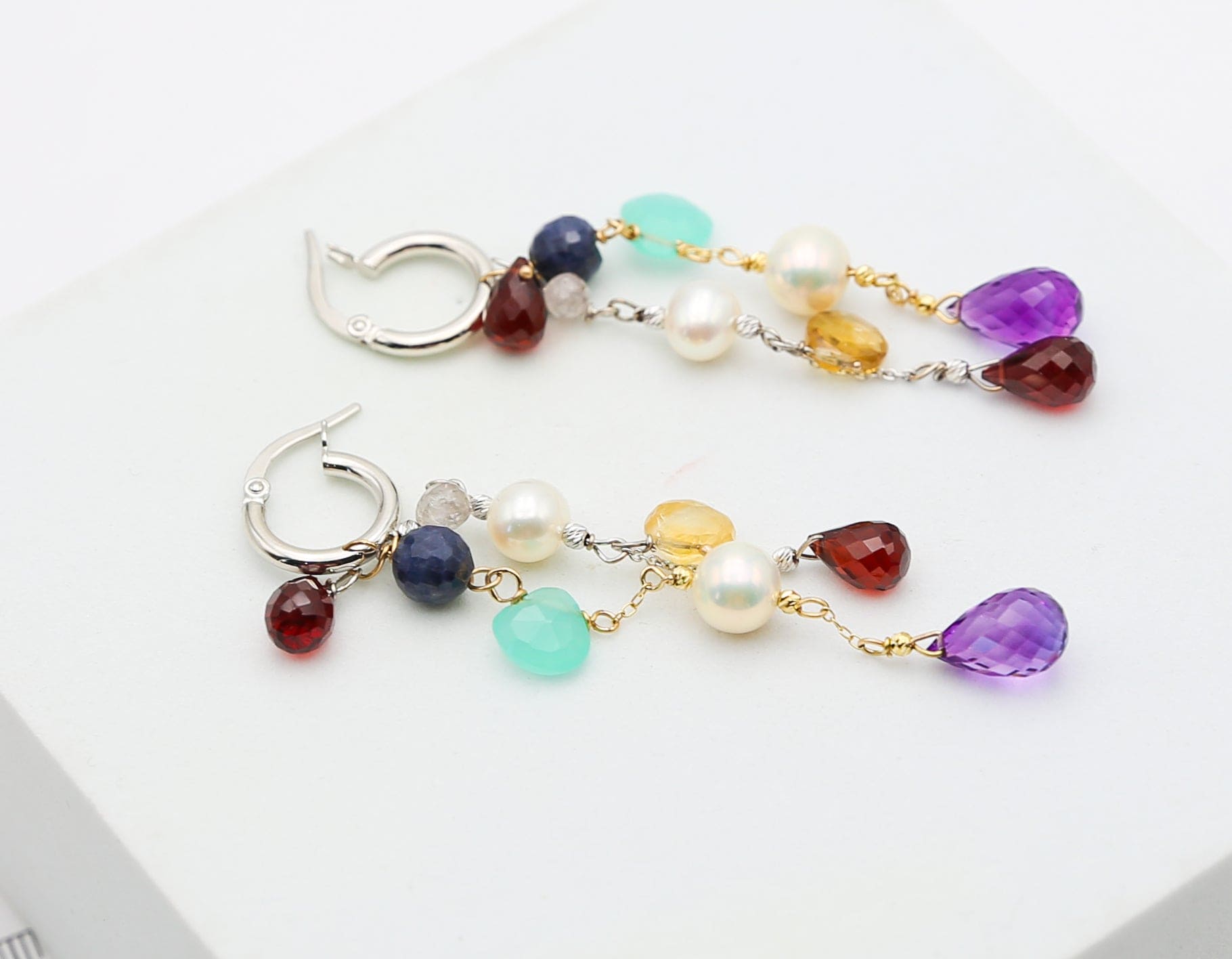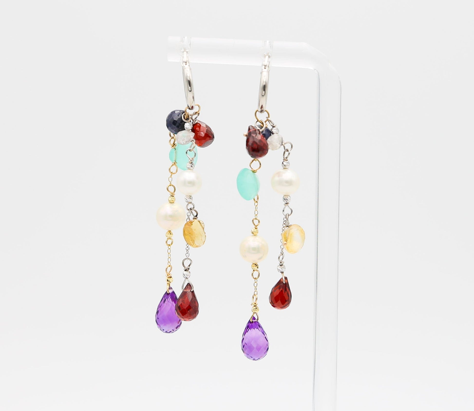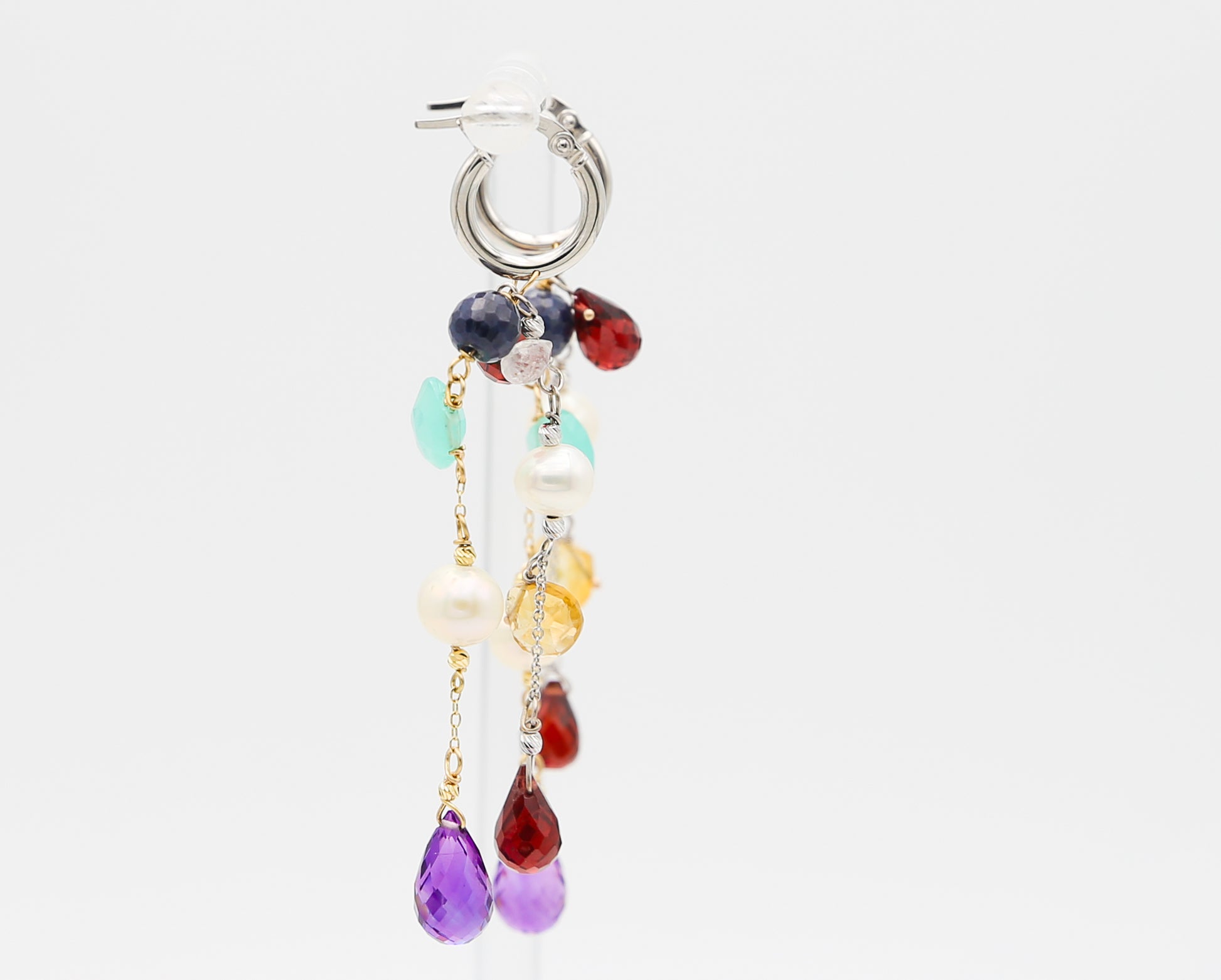 Orecchini in oro bianco e giallo 18 kt con cerchietti e pendenti saliscendi decorati con pietre multicolor,offrono un'esplosione di colori e raffinatezza. perfetti per illuminare ogni occasione.