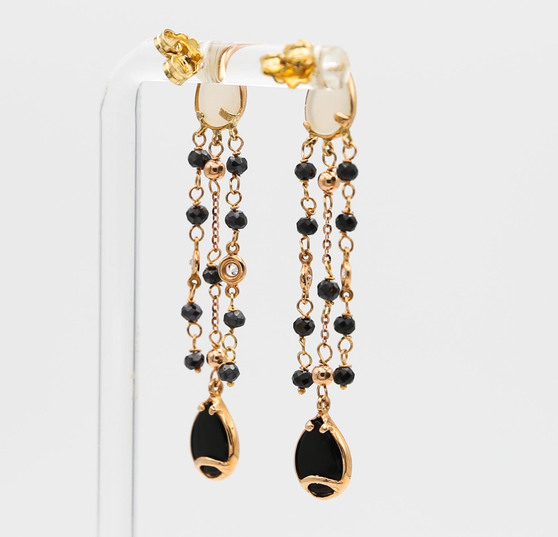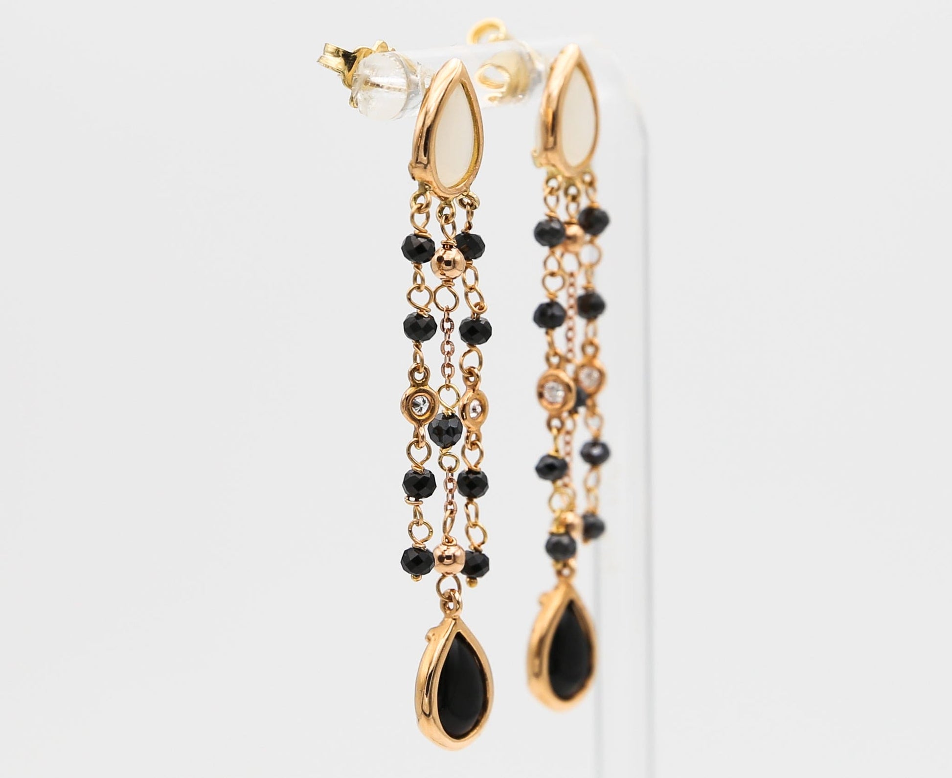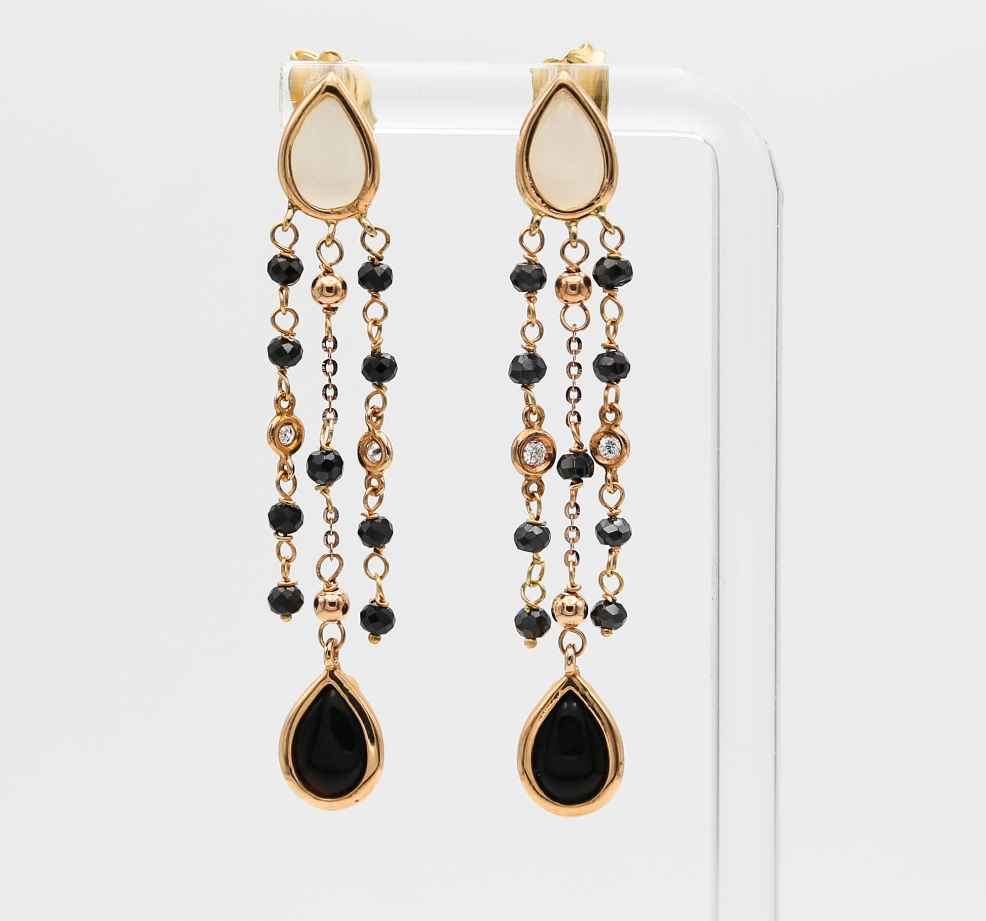 Orecchini in oro rosa 18 kt con gocce di madreperla e onice, collegati da eleganti catenelle in oro impreziositi da 4 diamanti e 18 spinelli.