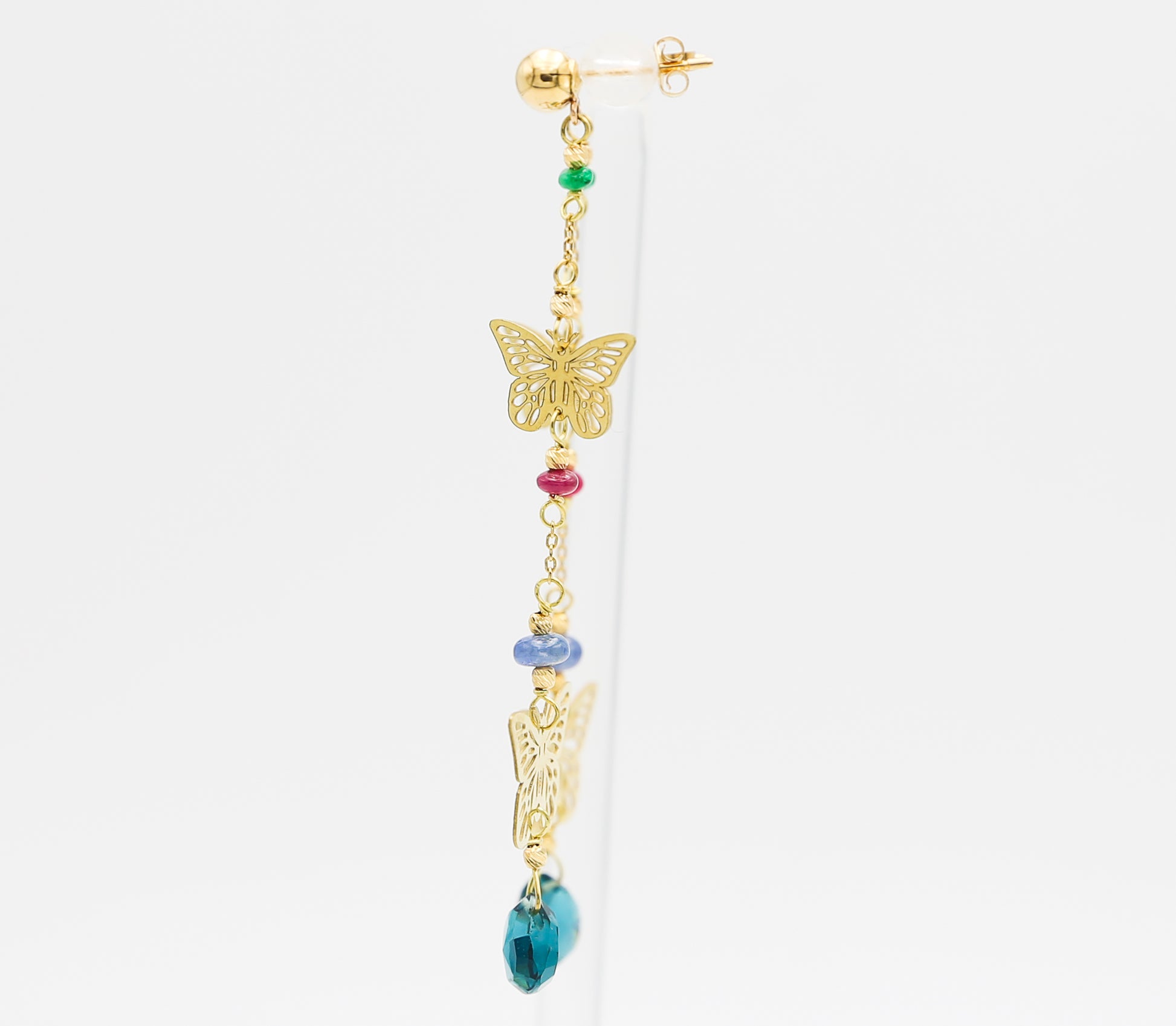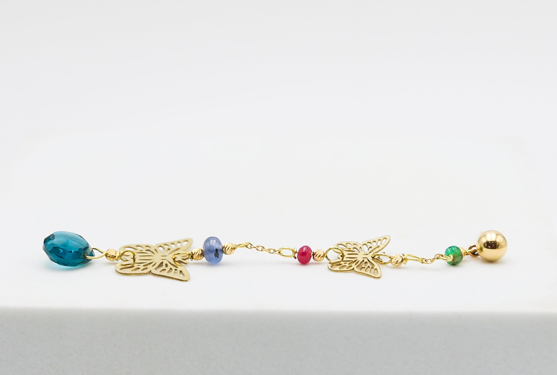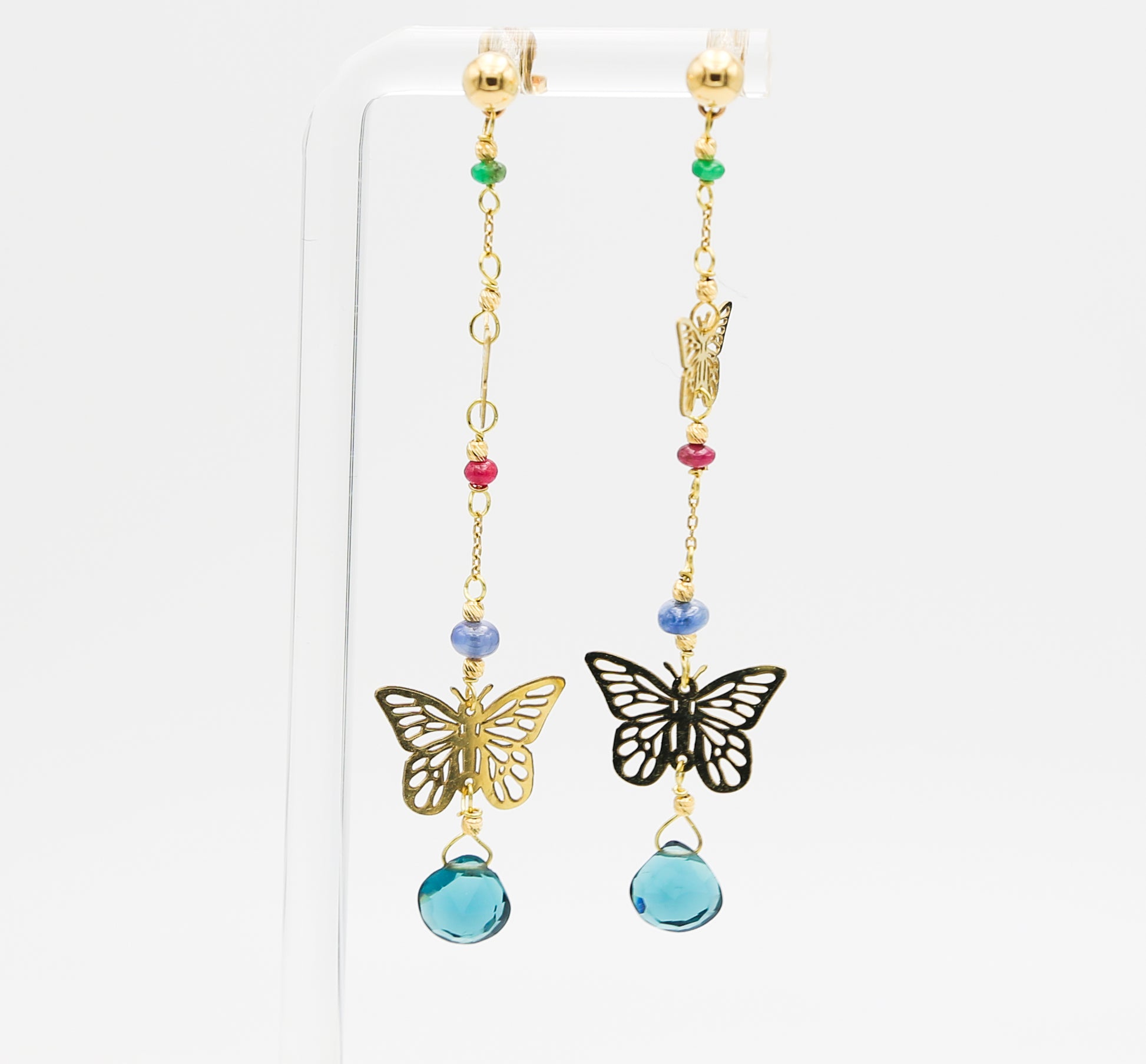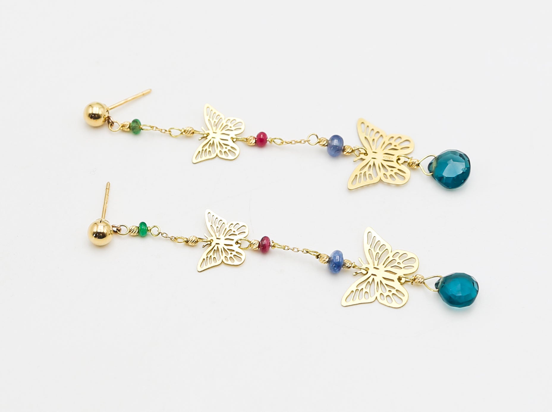Orecchini in oro giallo 18 kt con elementi pendenti in oro traforato a farfalla, intervallato con pietre naturali un gioiello raffinato che unisce eleganza e vivacità, perfetto per chi cerca un tocco di lusso distintivo.