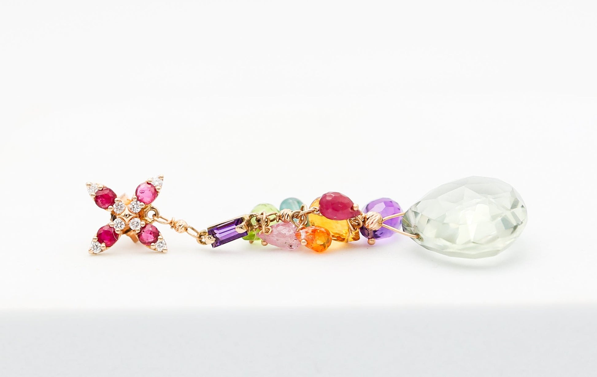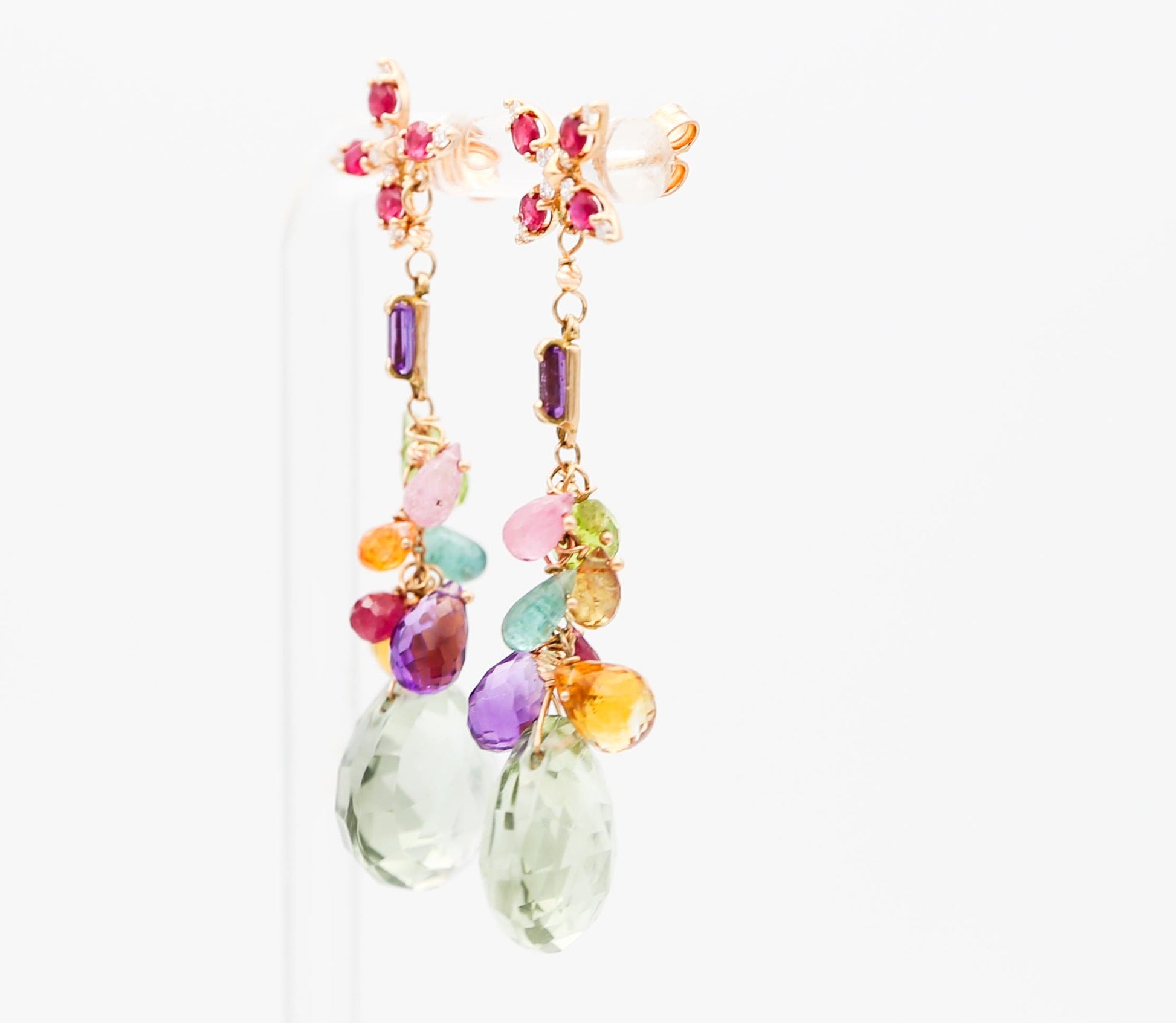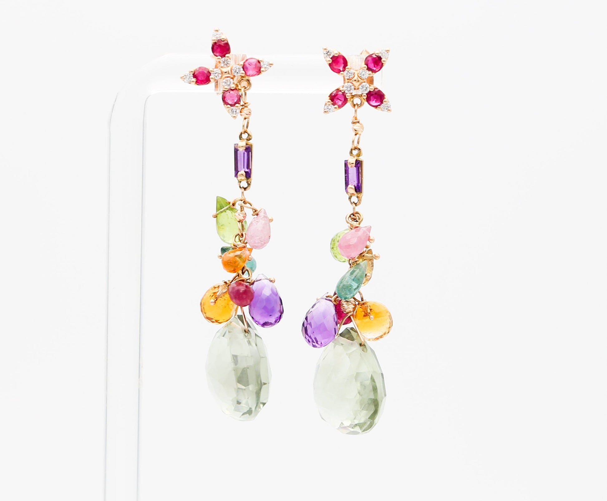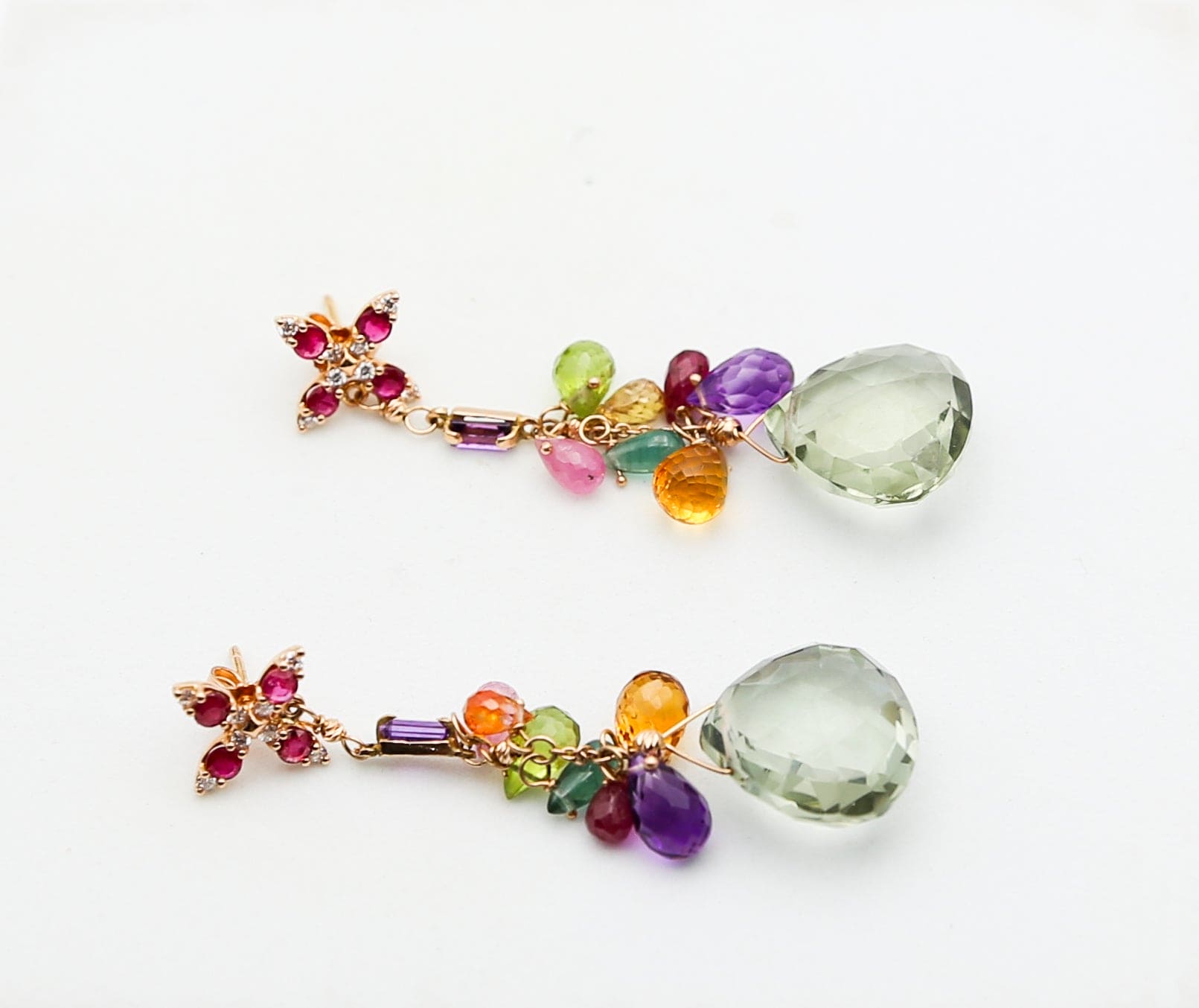 Orecchini in oro rosa 18 kt con perno e farfalla. stella al lobo ornata da rubini e diamanti. Pendenti multicolor per un look elegante e raffinato.
