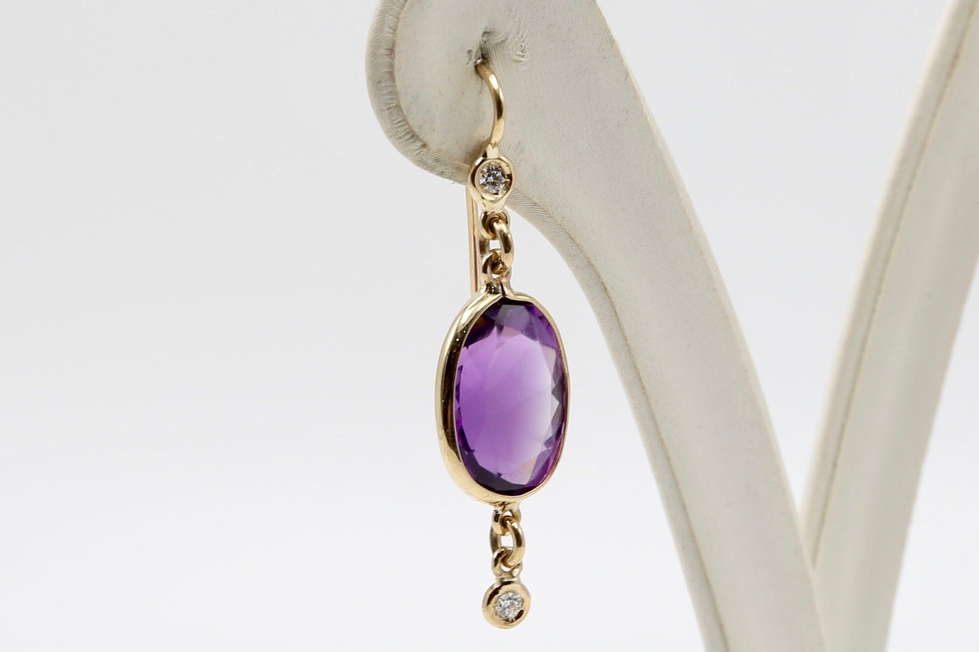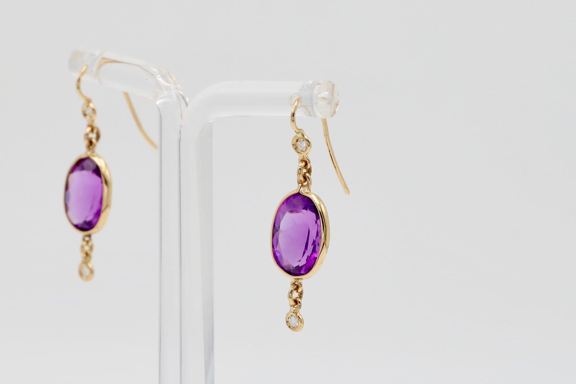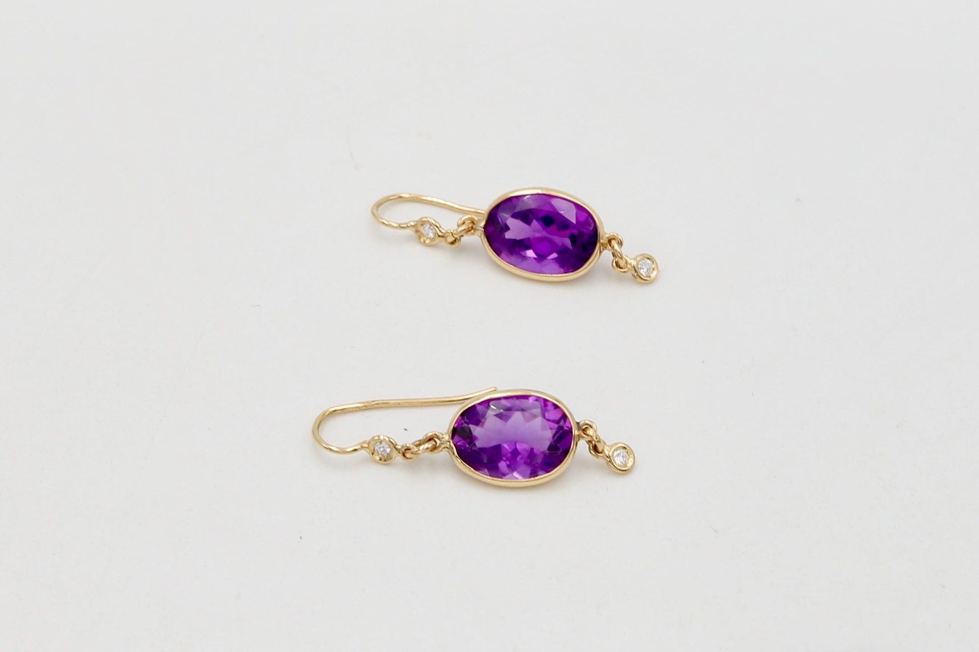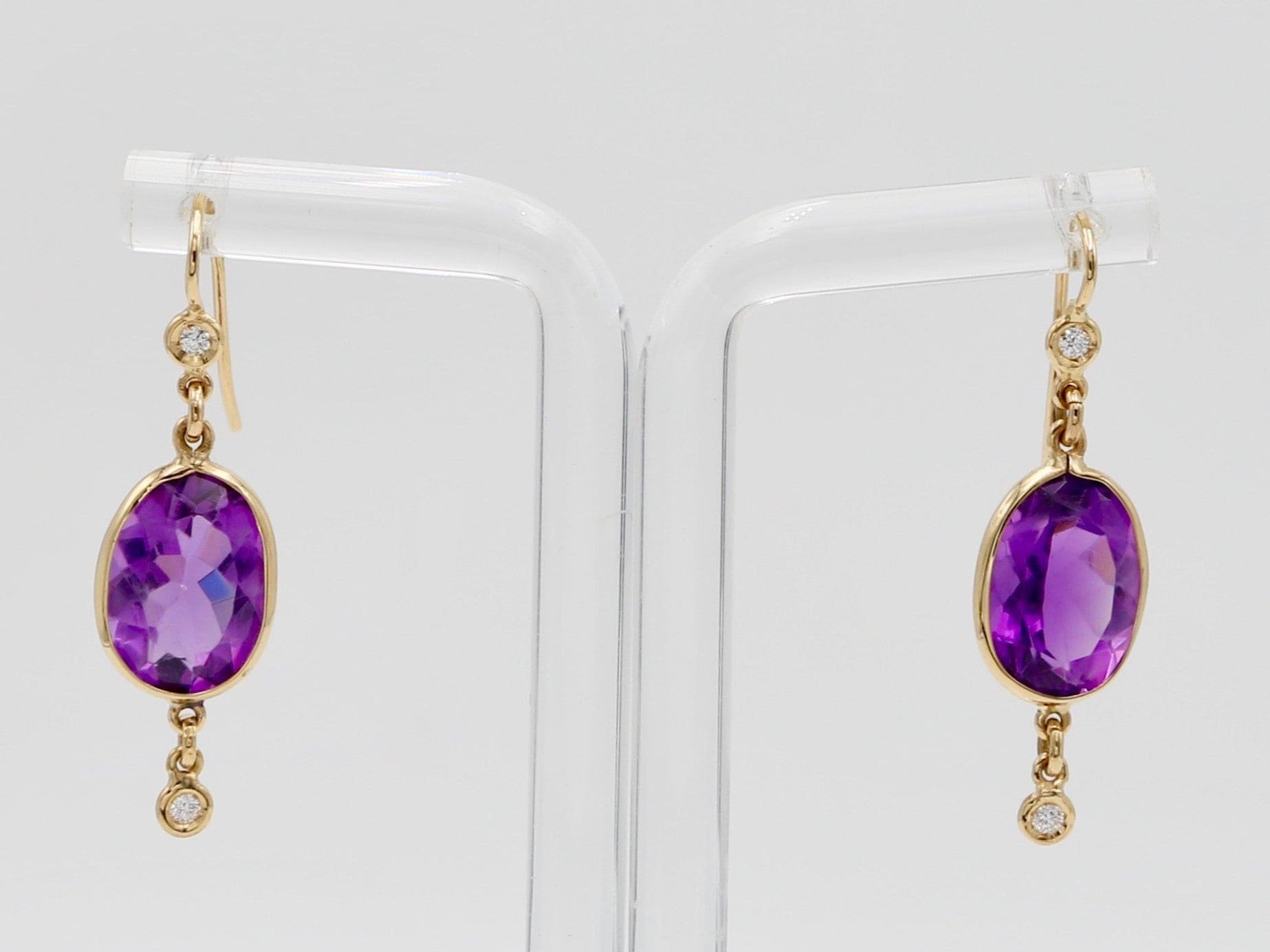 Orecchini pendenti in oro giallo con ametiste sfaccettate ovali e brillanti posti sul gancio e ciondolanti.
