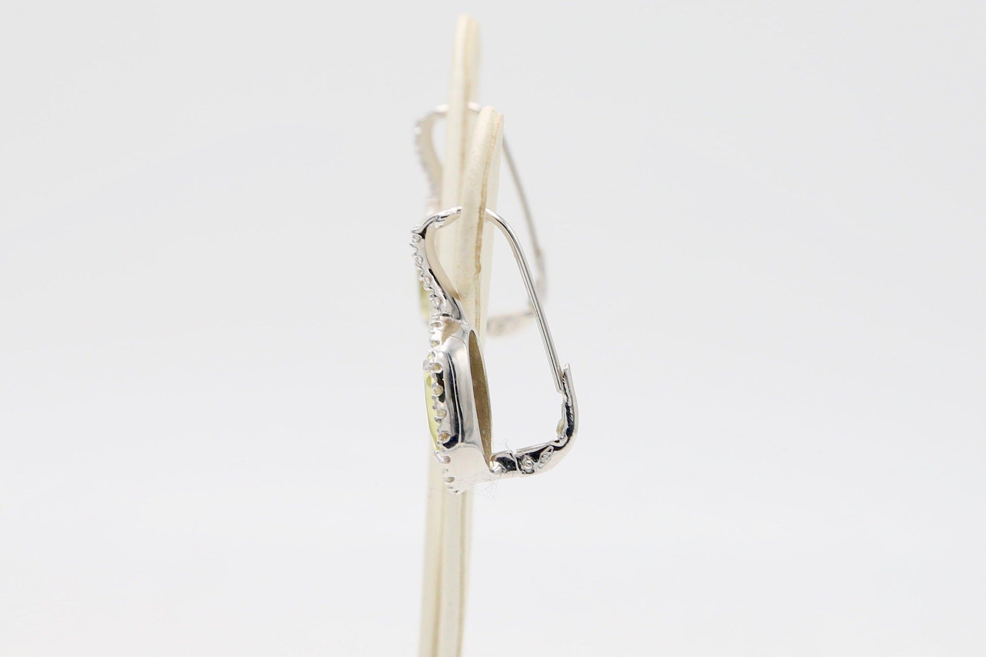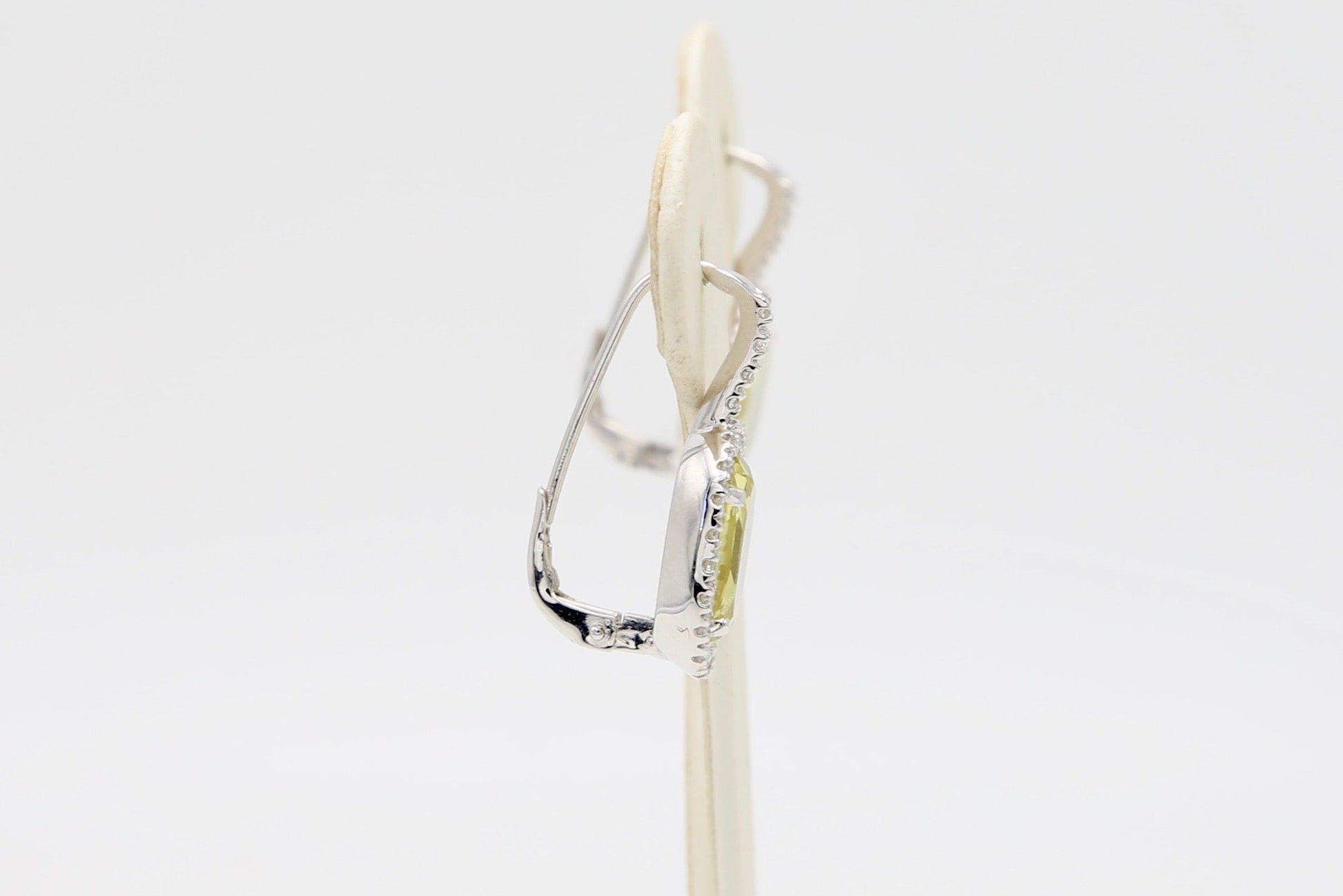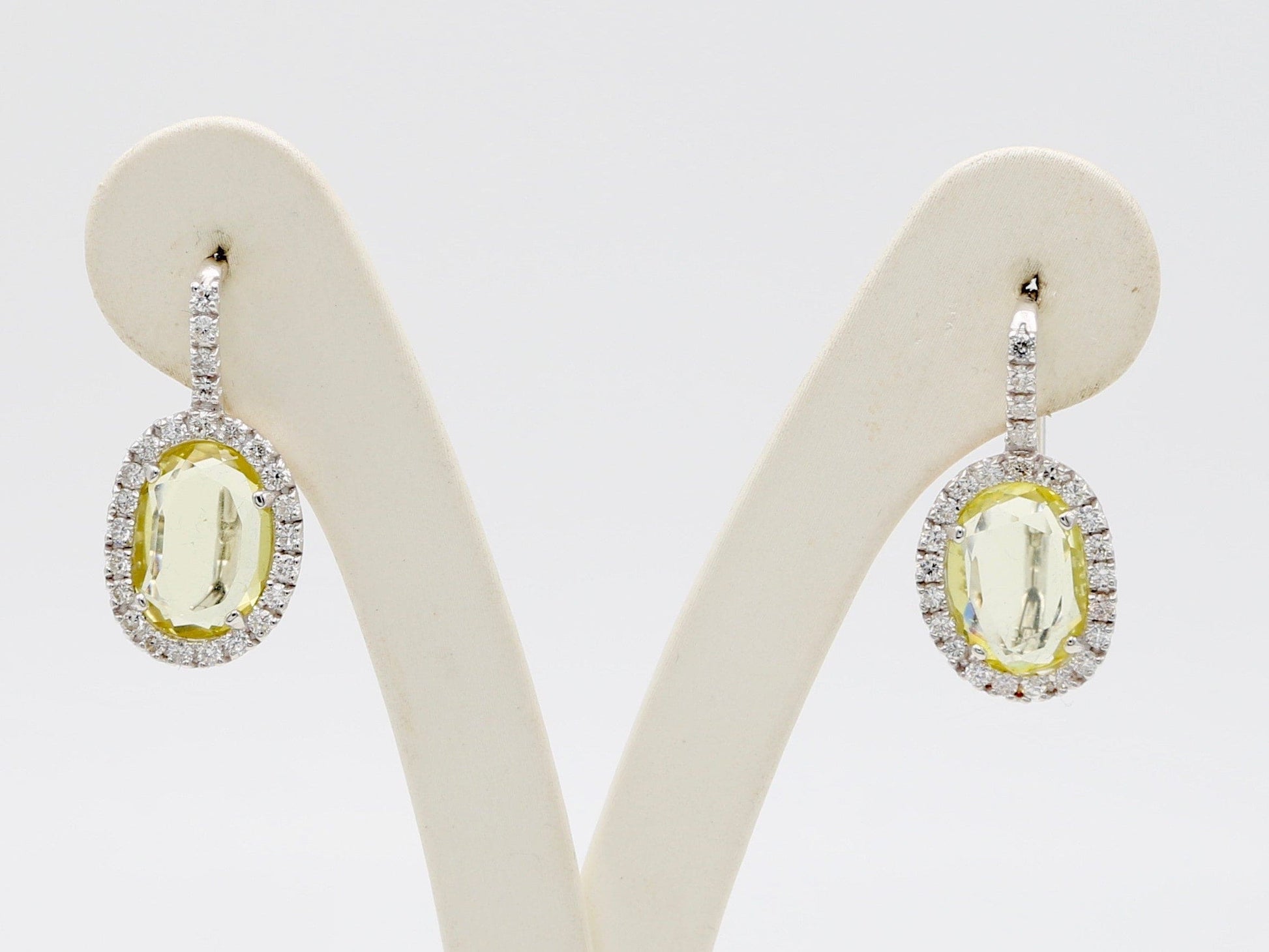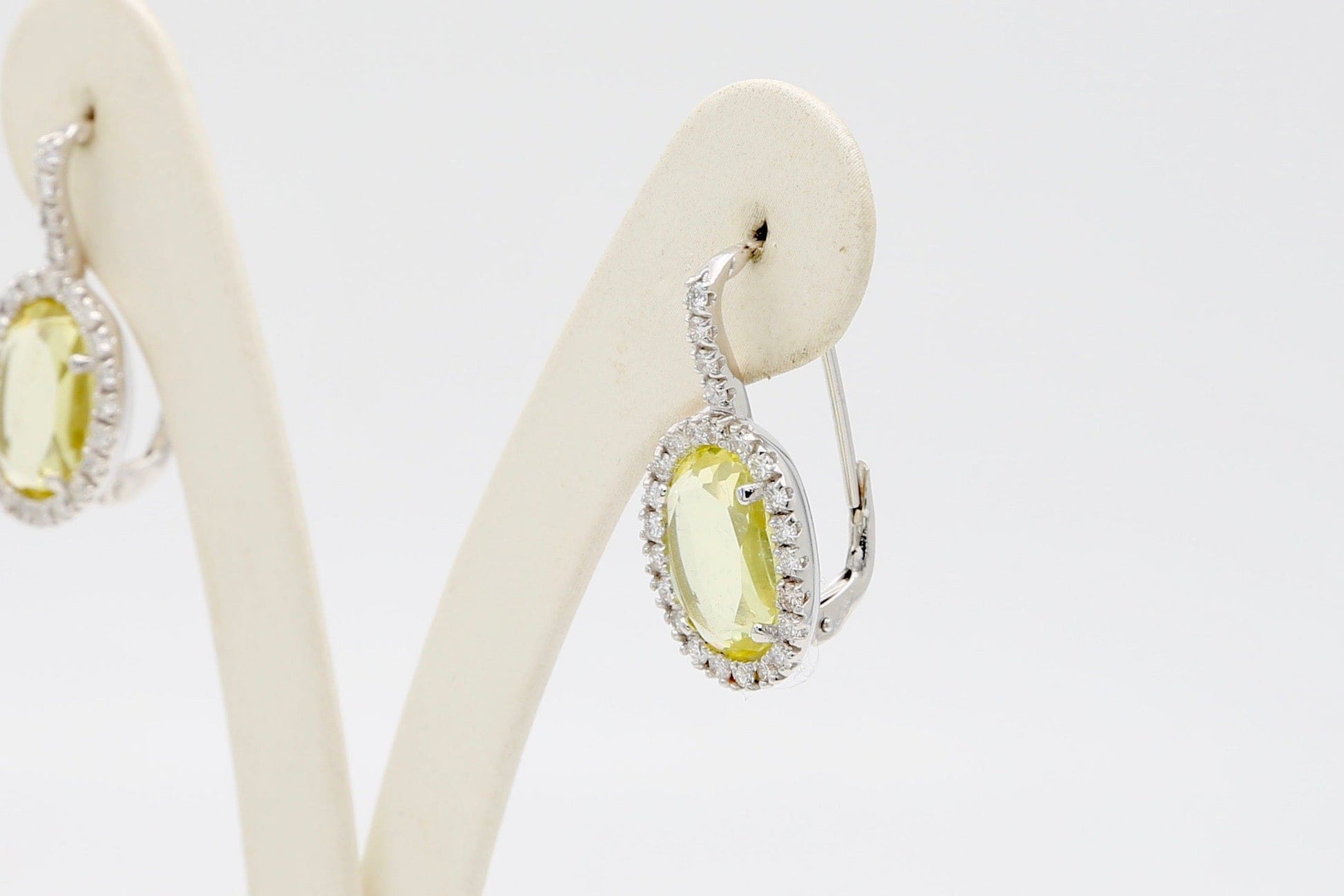 Prezioso orecchino pendente modello monachina con due brillanti quarzi lemon completamente contornati da diamanti naturali.
