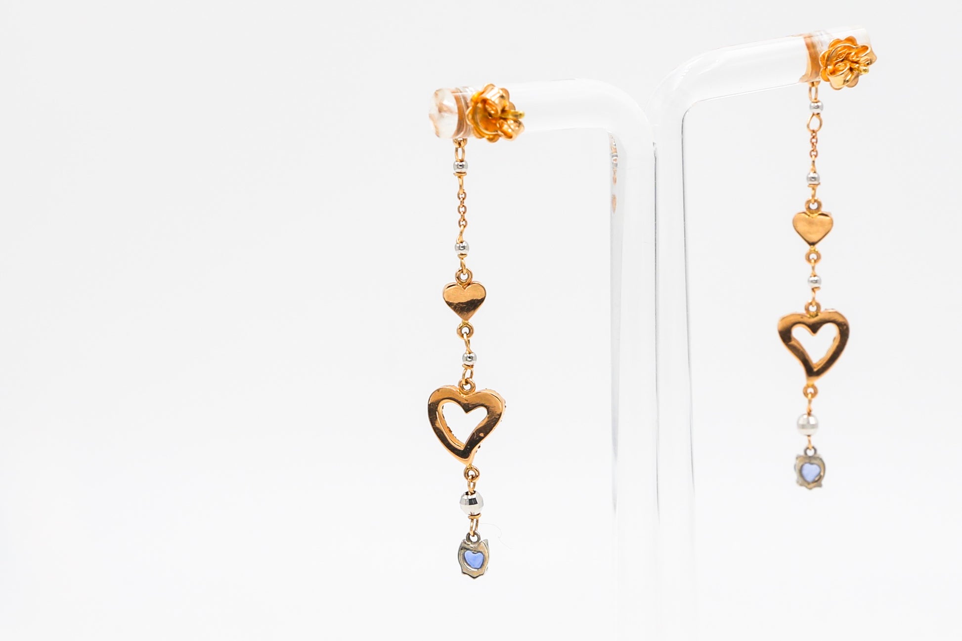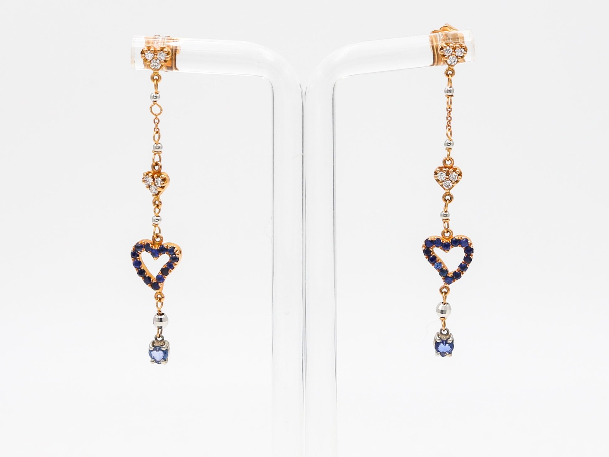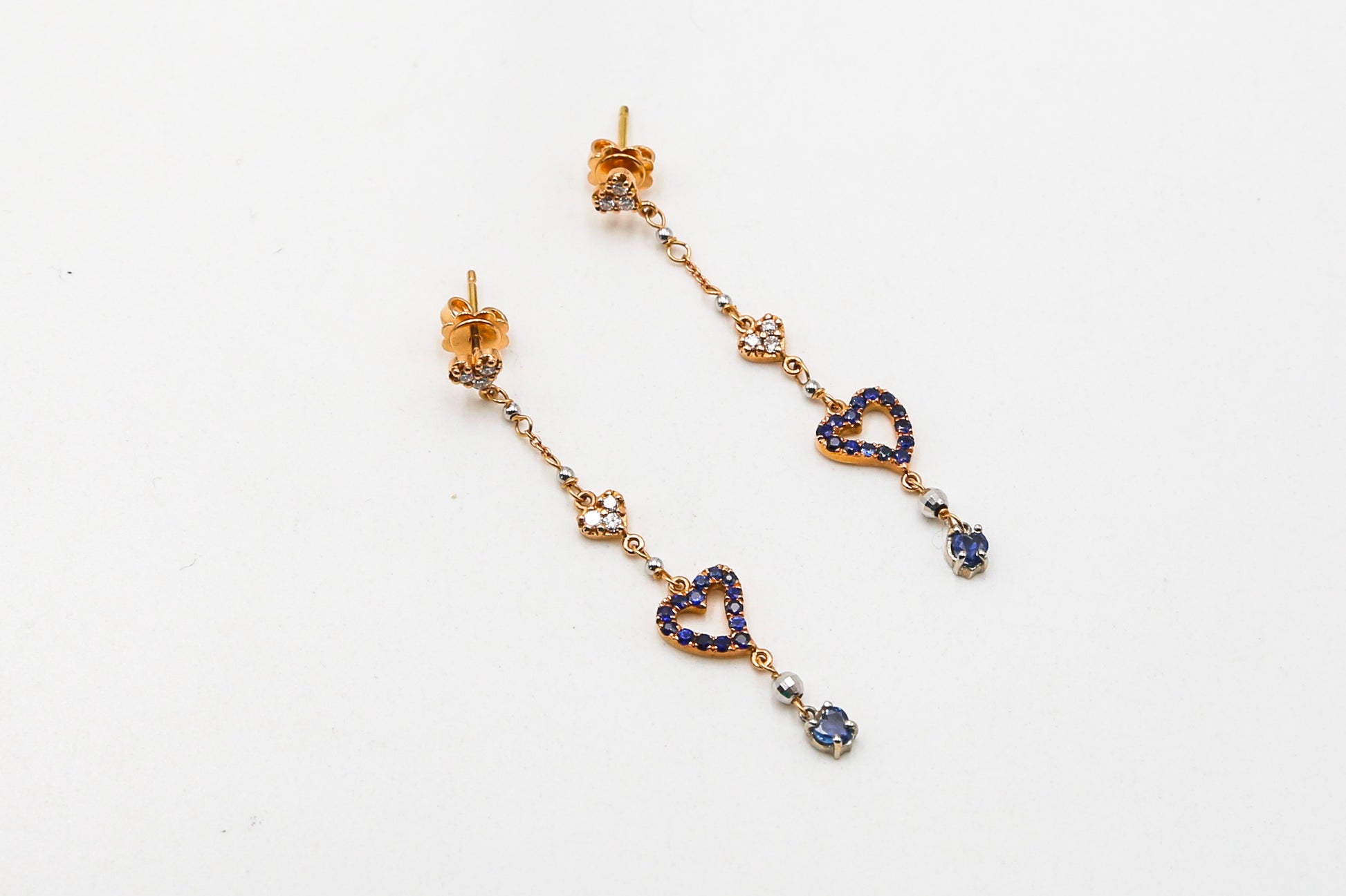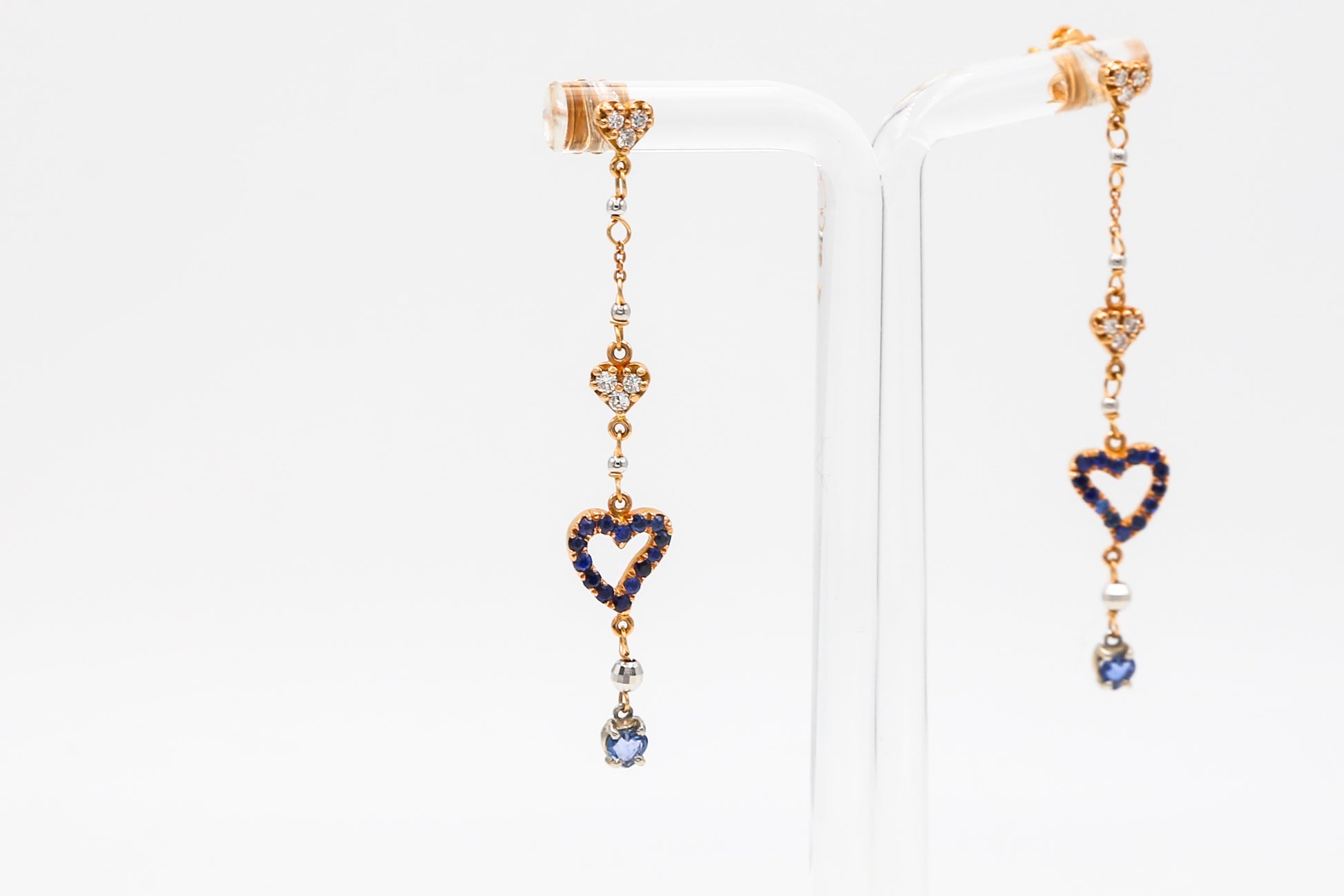 Orecchini in oro pendenti con 2 splendidi cuoricini di diamanti al lobo, catenella maglia rollò raccordata e alternata con altri cuori di zaffiri e diamanti disposti con cura dalla nostra designer.