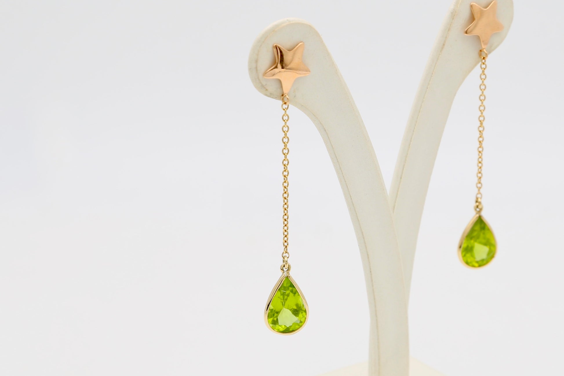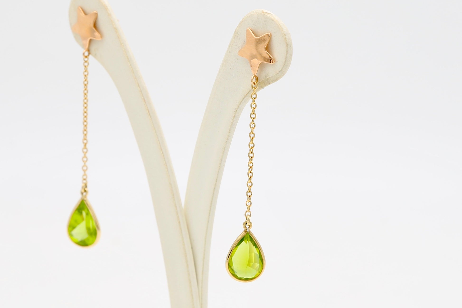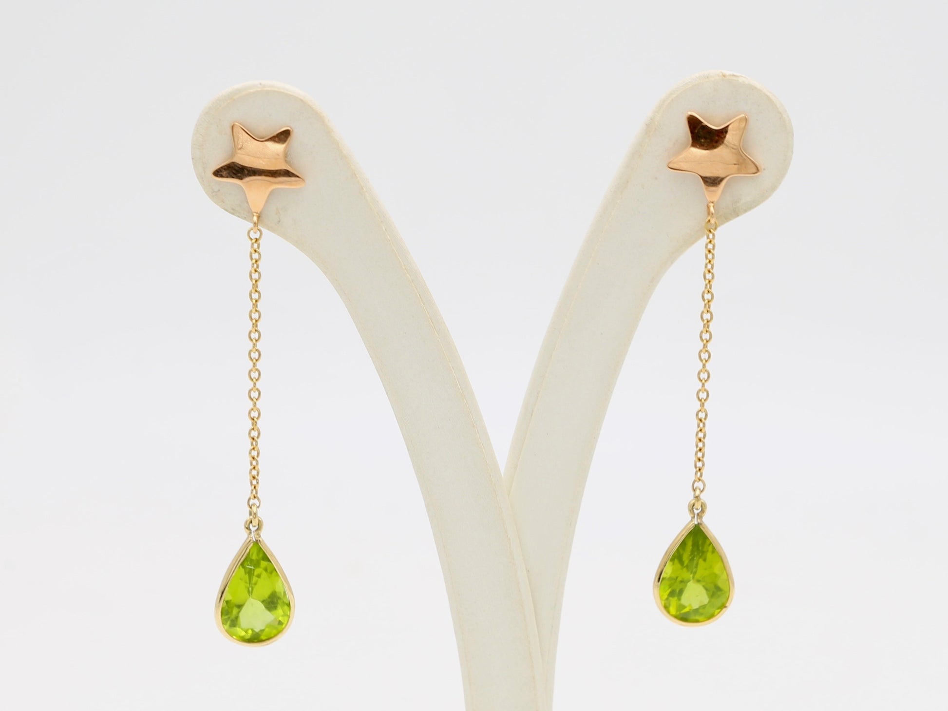 Orecchini in oro rosa 18kt pendenti con stella al lobo realizzati con catenella maglia rollò e 2 peridoti a goccia sfaccettati.