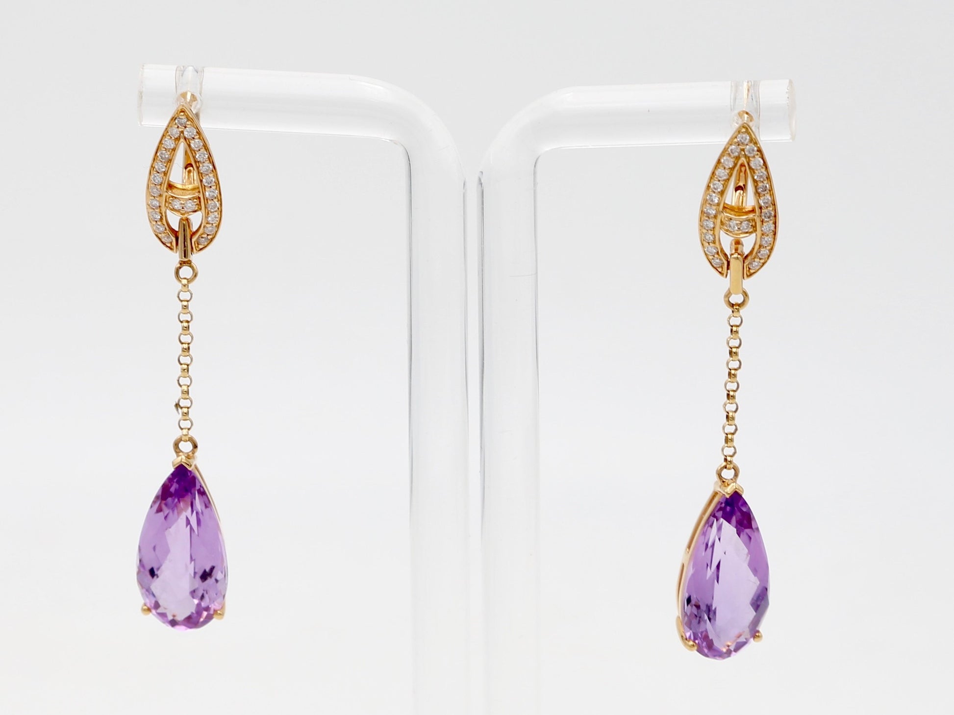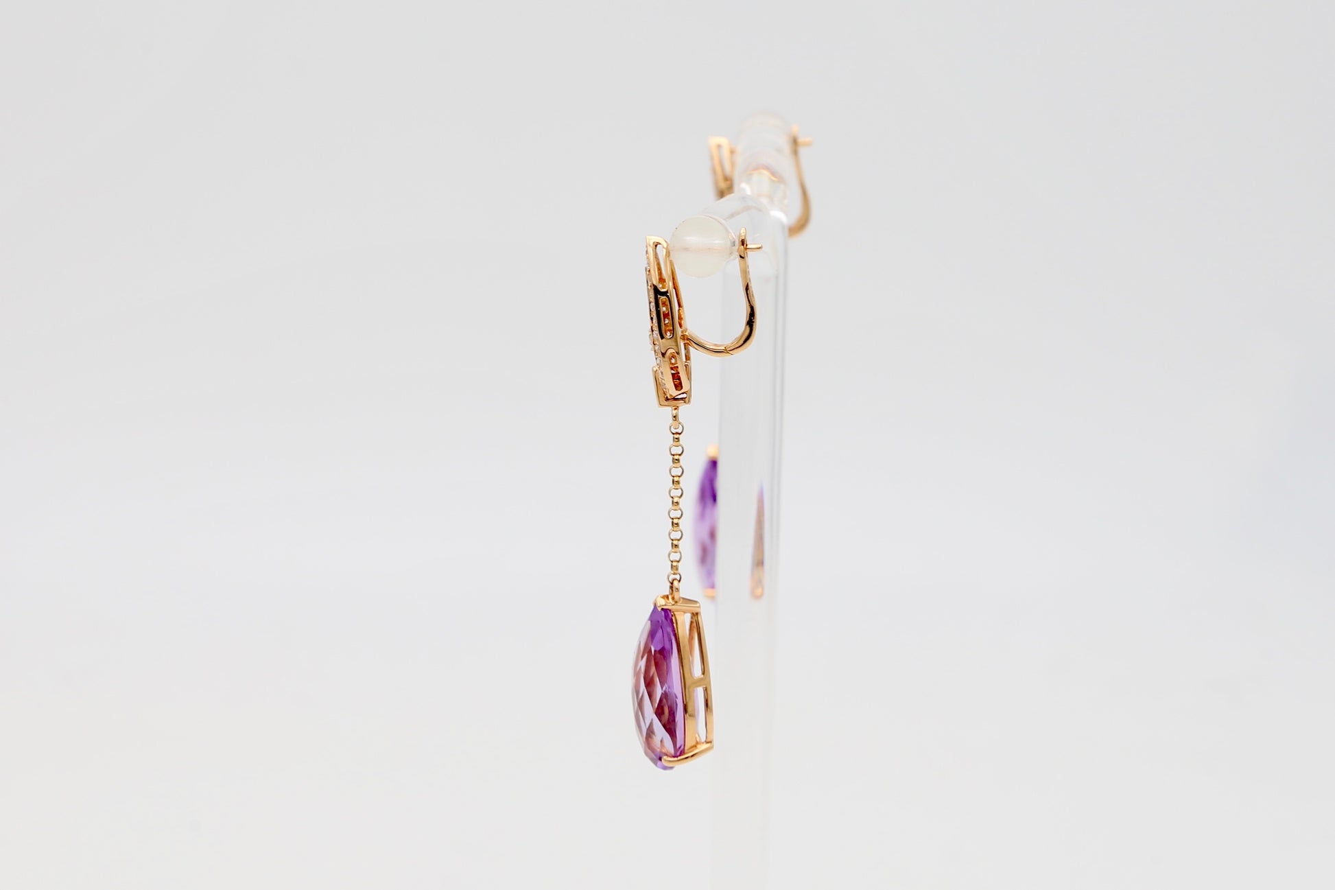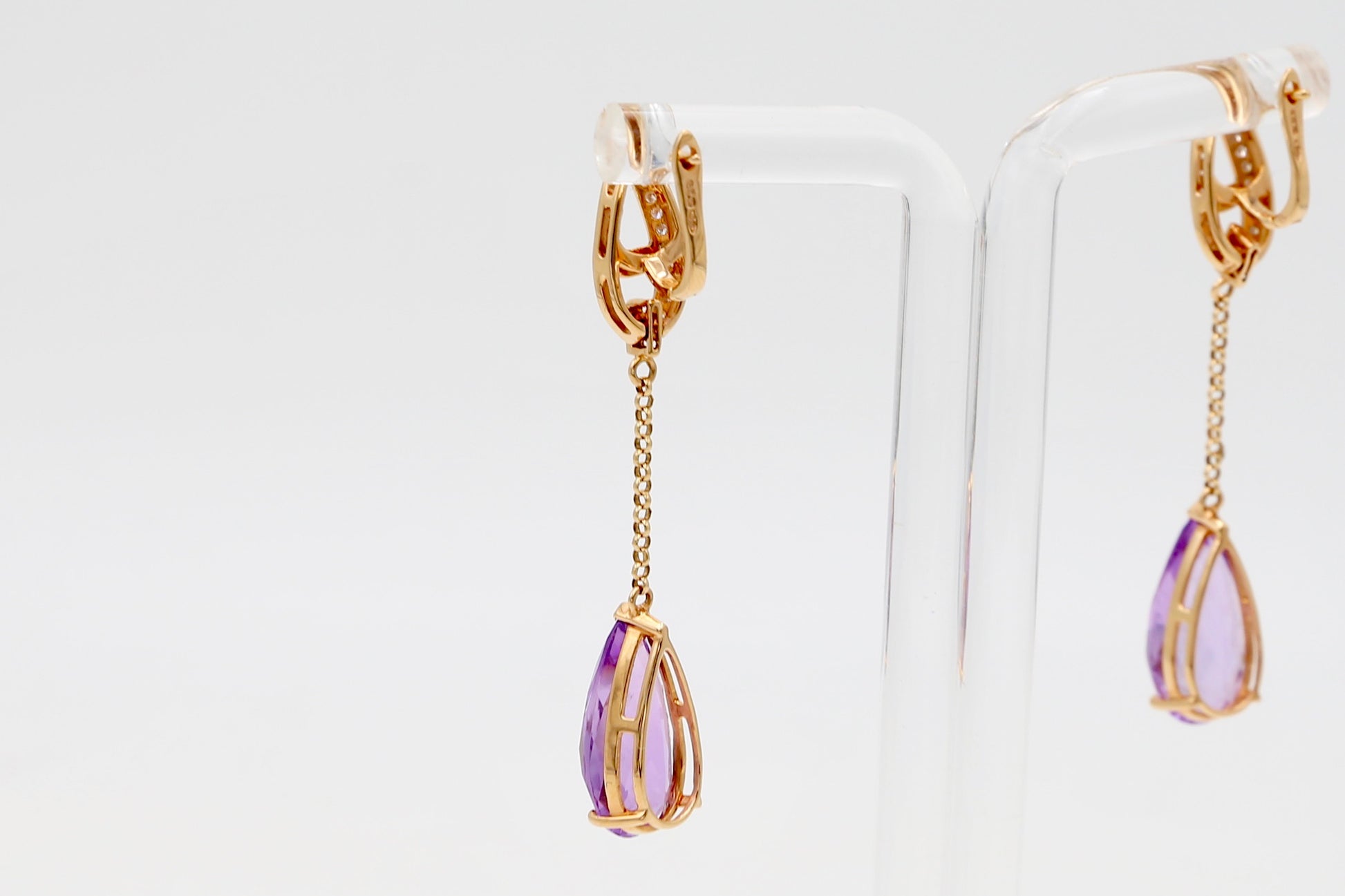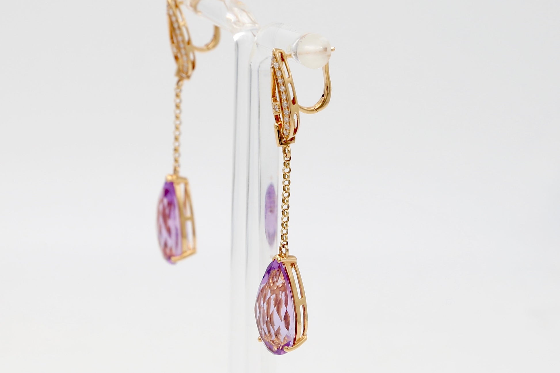 Elegante e prezioso orecchino in oro rosa 18 carati con due grandi ametiste goccia taglio "briolette" pendenti da un elemento con diamanti.