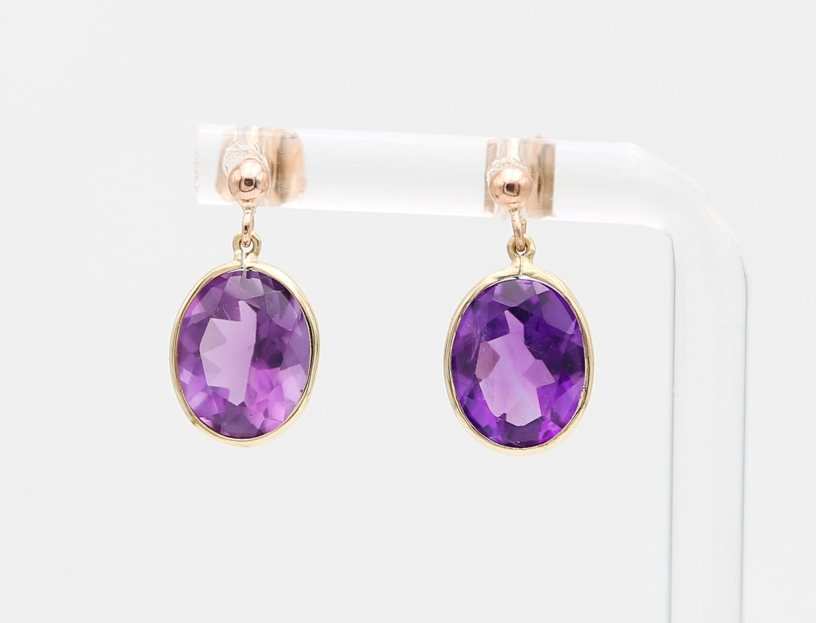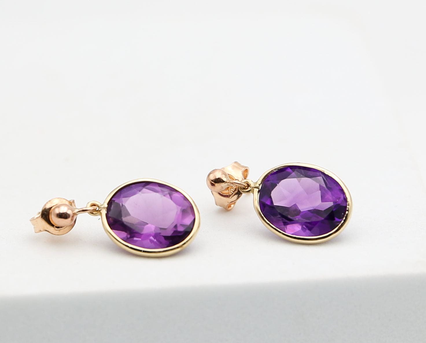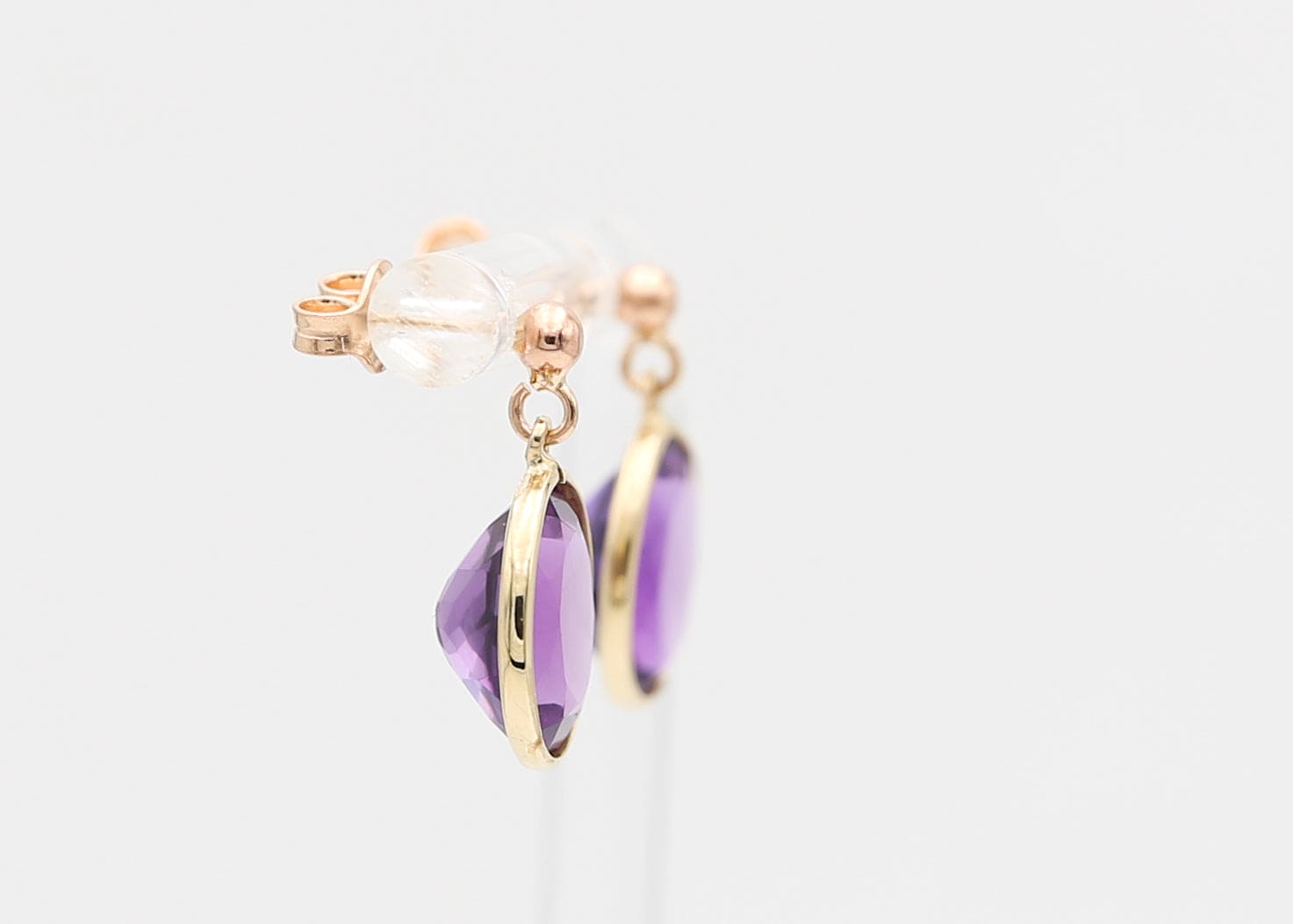 Graziosa coppia di orecchini realizzata in oro rosa e giallo 18 karati e ametiste, tutte di un bel colore viola vellutato.