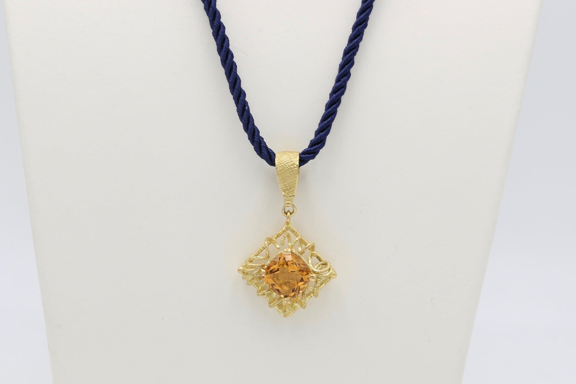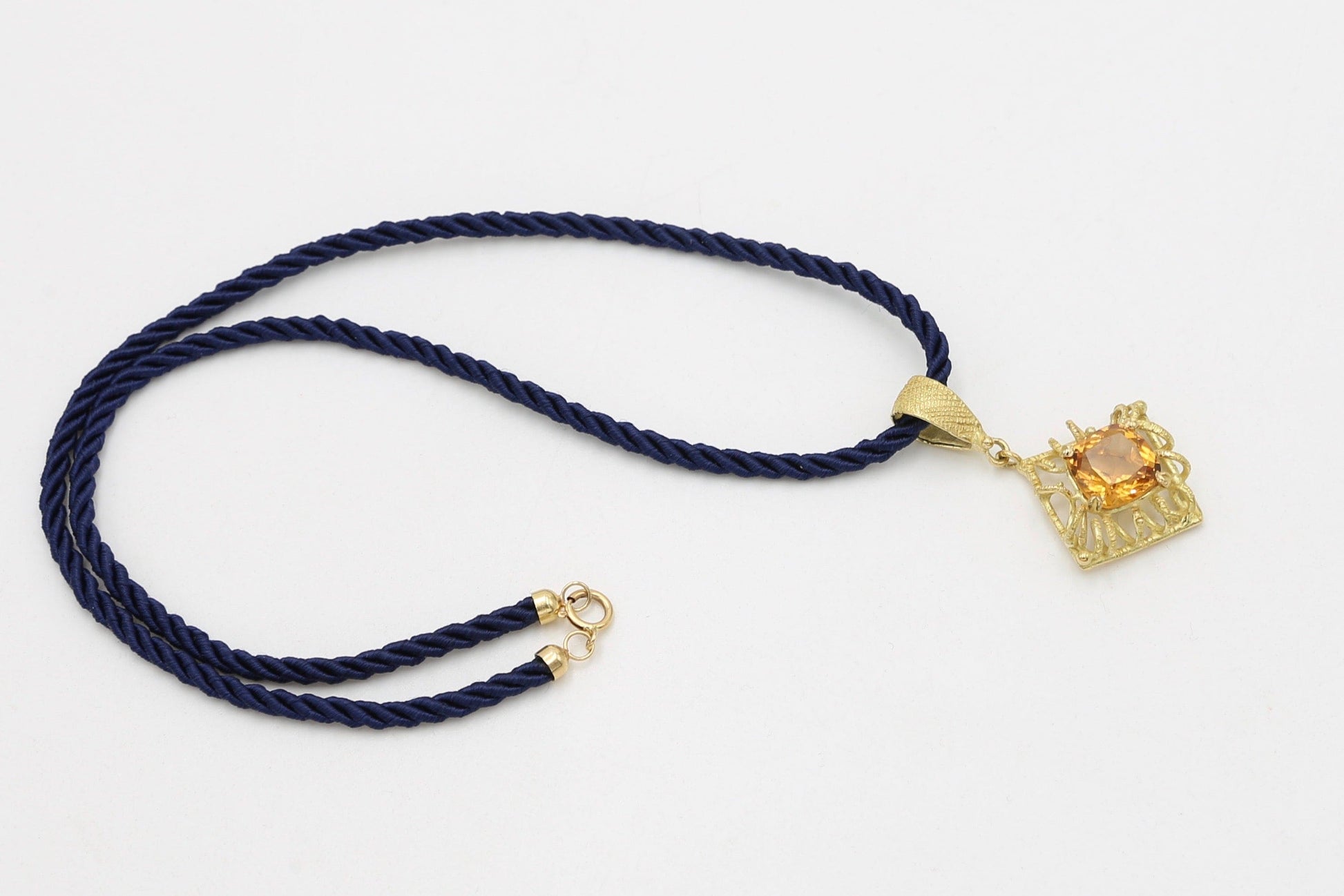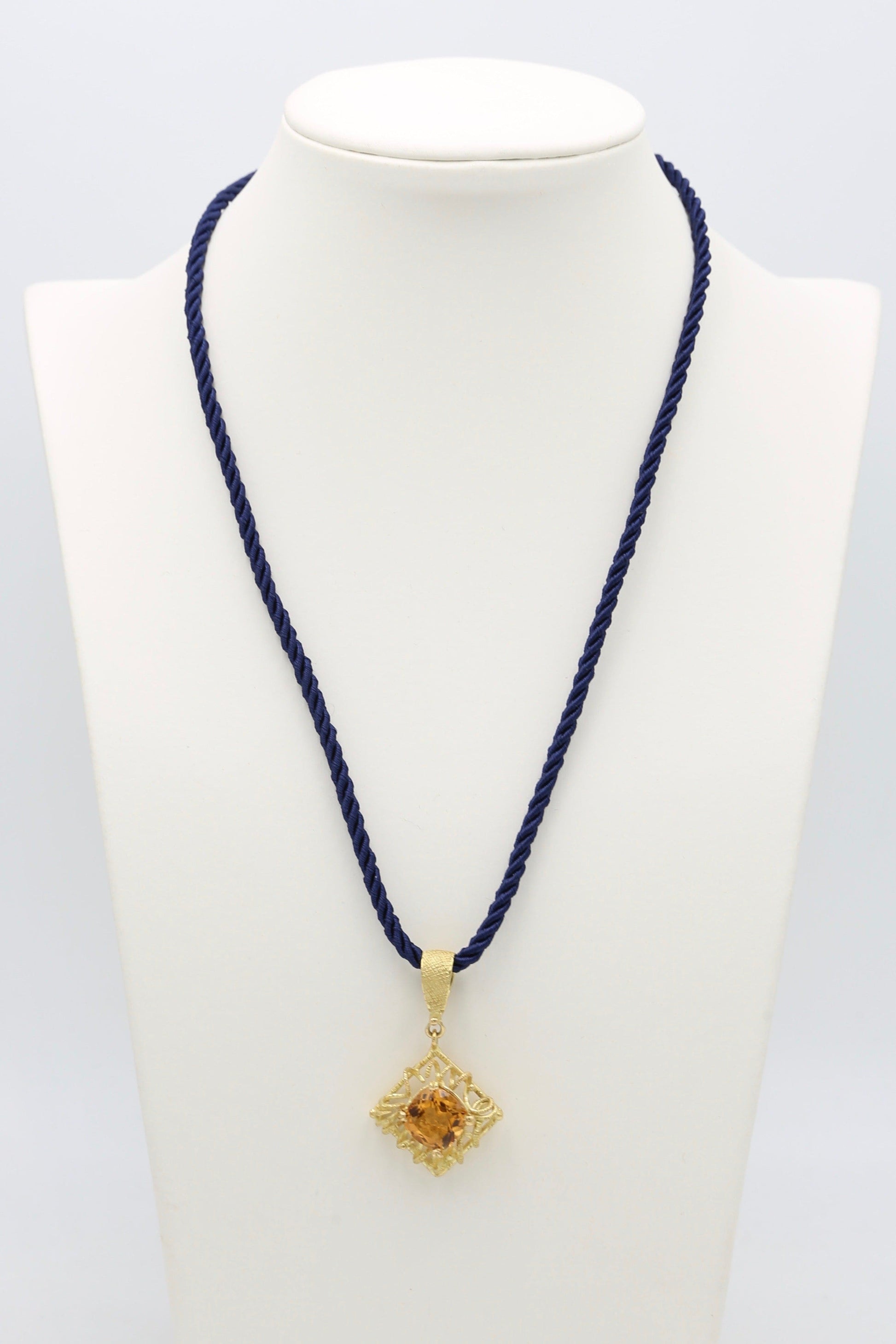 Pendente in oro giallo 18kt lavorato con tecnica della cera persa con splendente citrino centrale e un delicato cordone in seta con chiusura in oro.