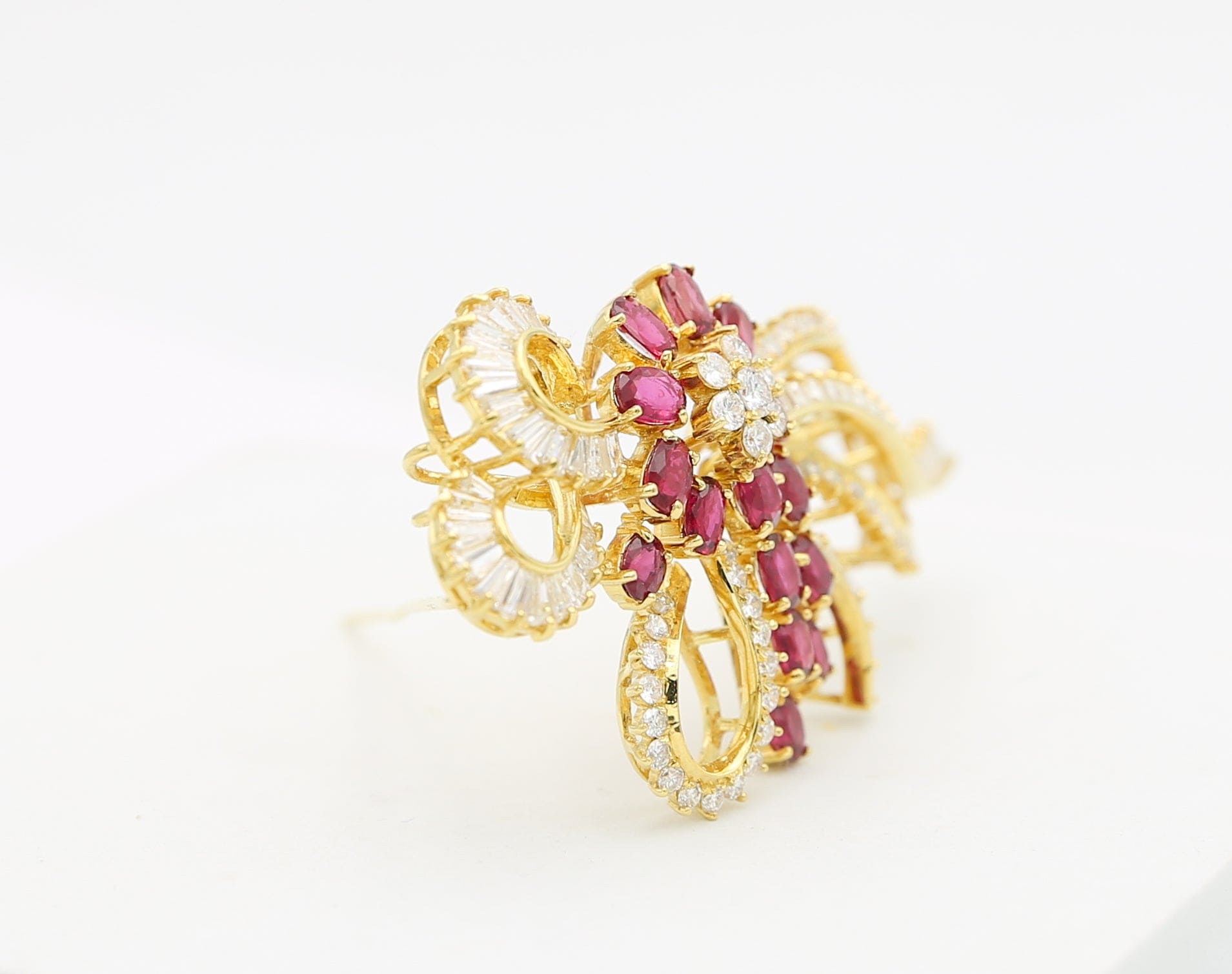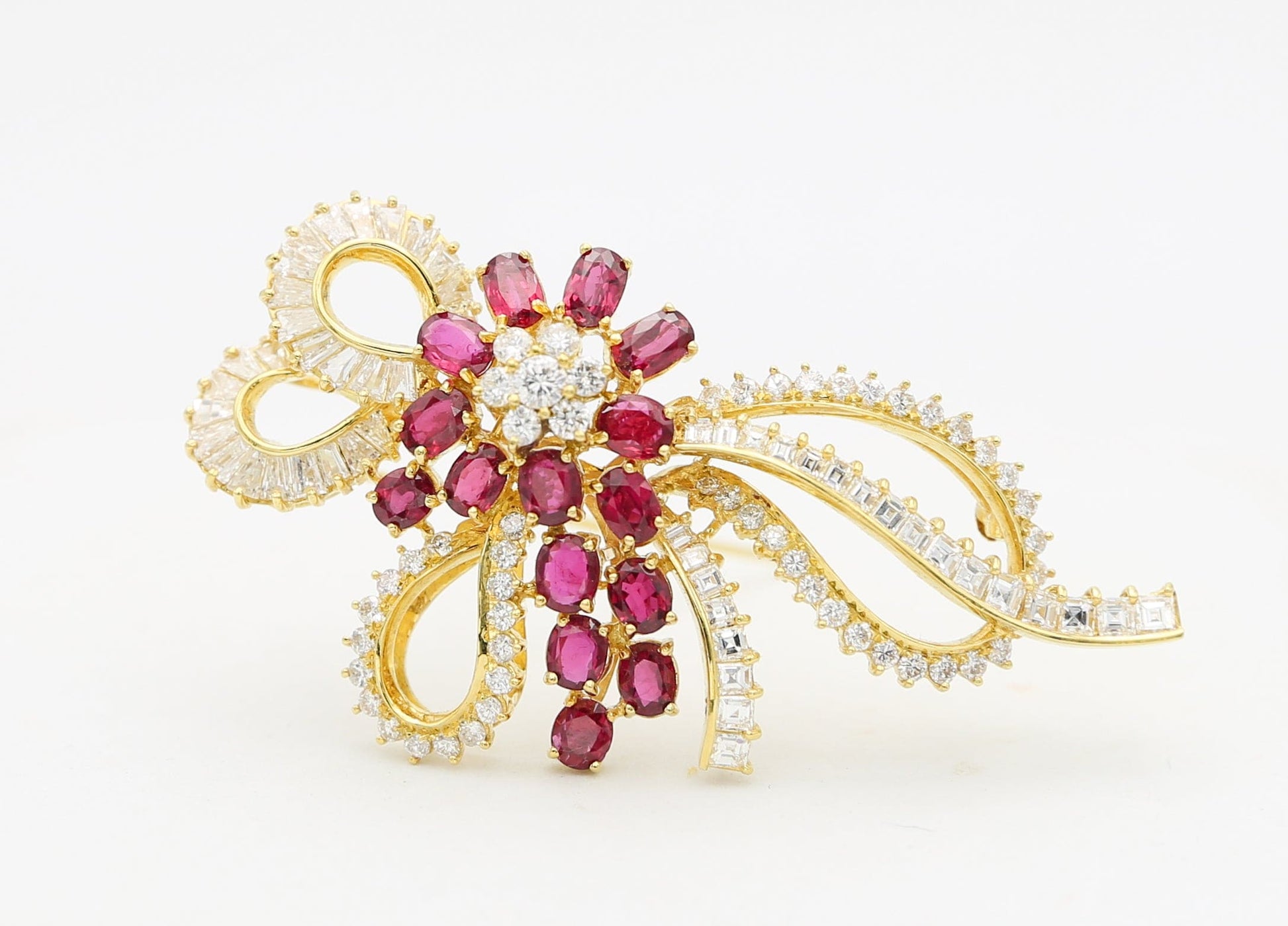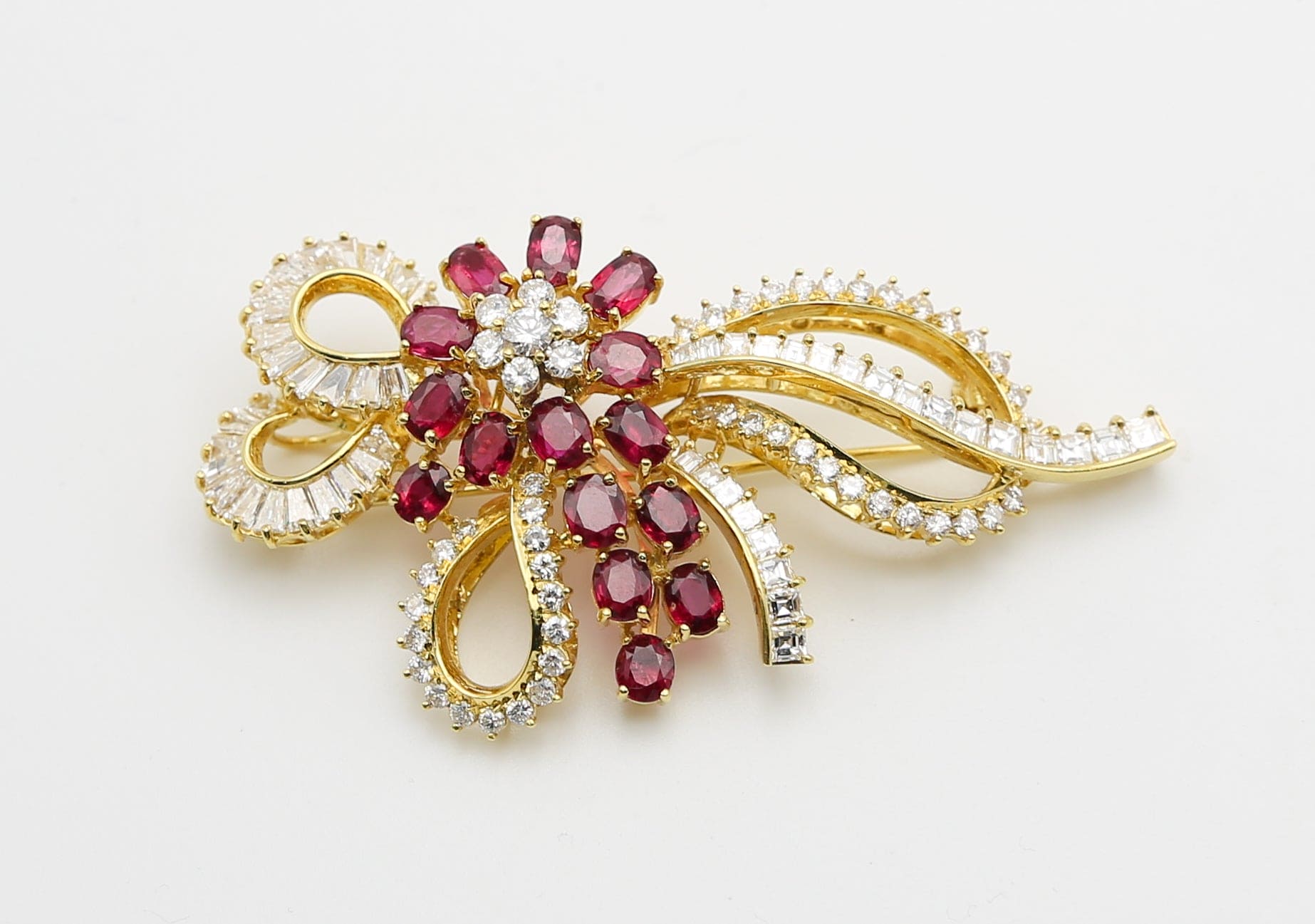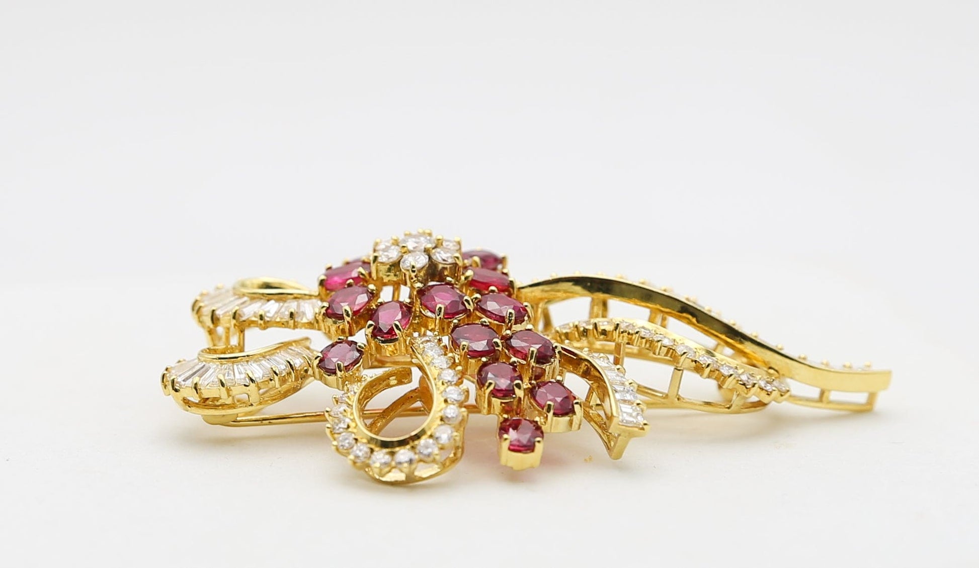 Meravigliosa spilla anni "80" di grandi dimensioni in oro giallo 18carati con gemme naturali di elevata qualità, rubini rosso "sangue di piccione" e diamanti.