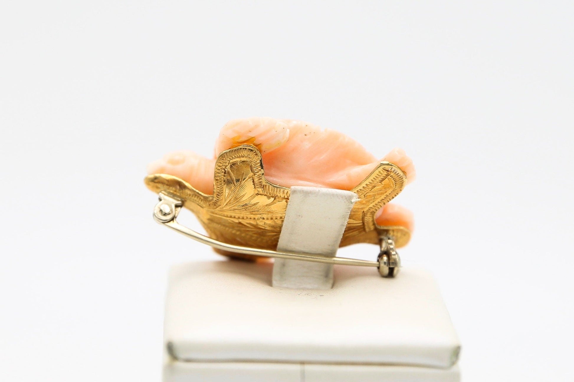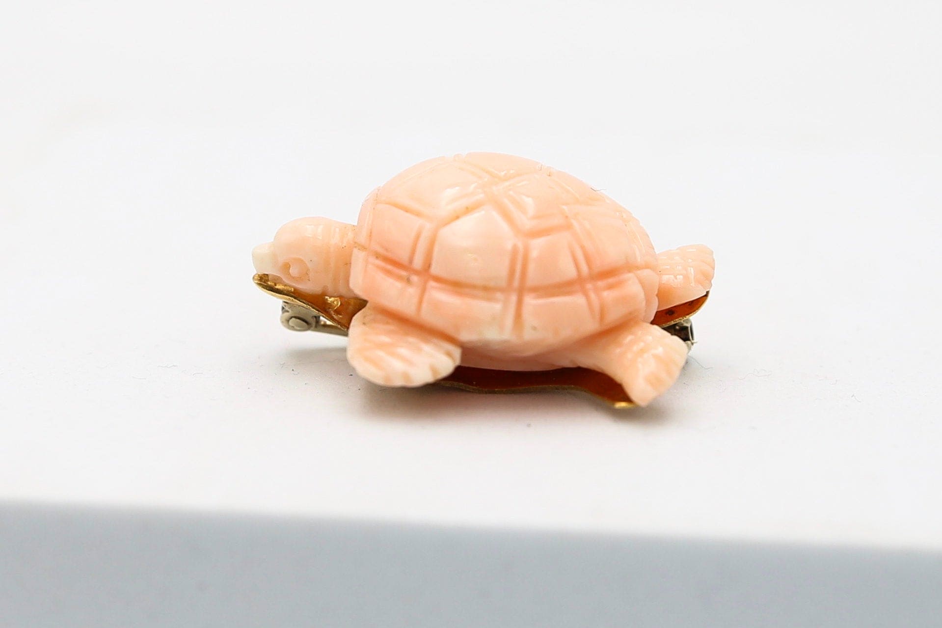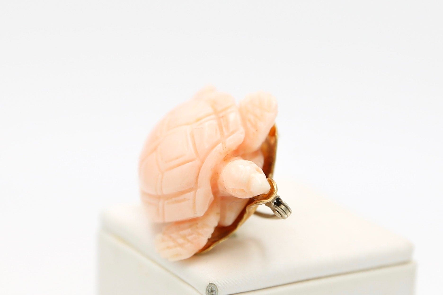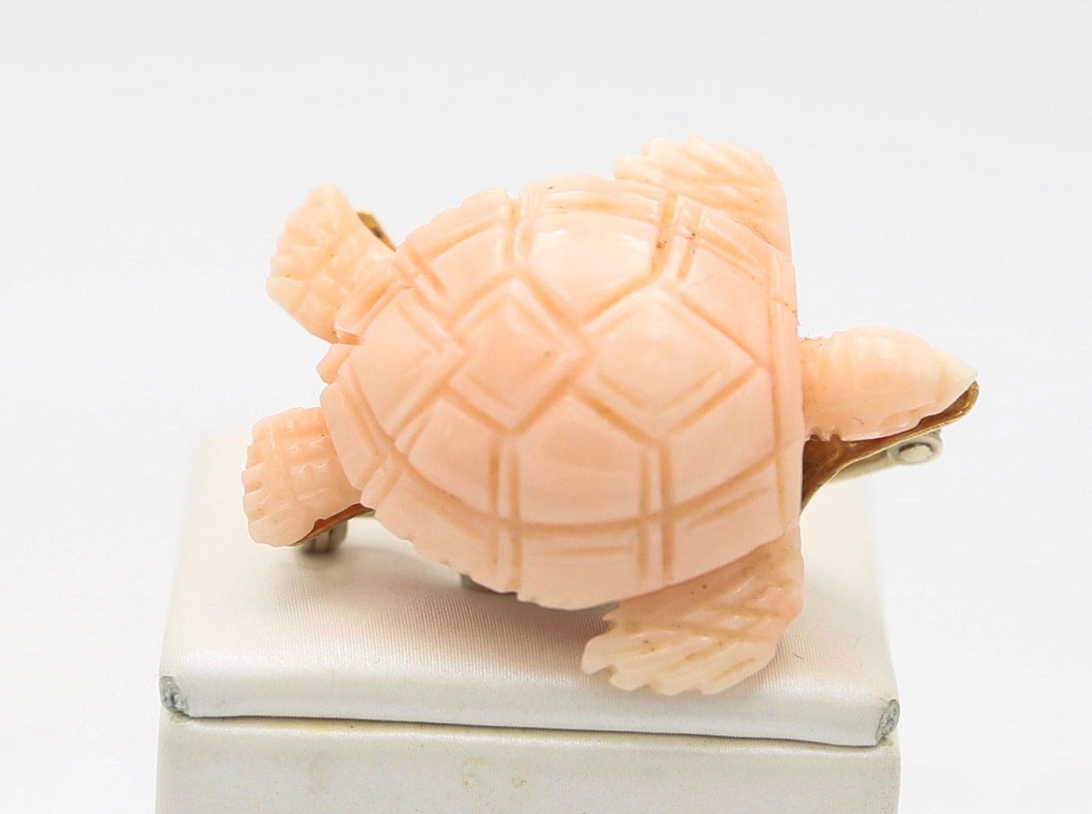 Spilla in oro giallo/bianco a 18kt vintage a forma di tartaruga con corallo intagliato rosa giapponese .