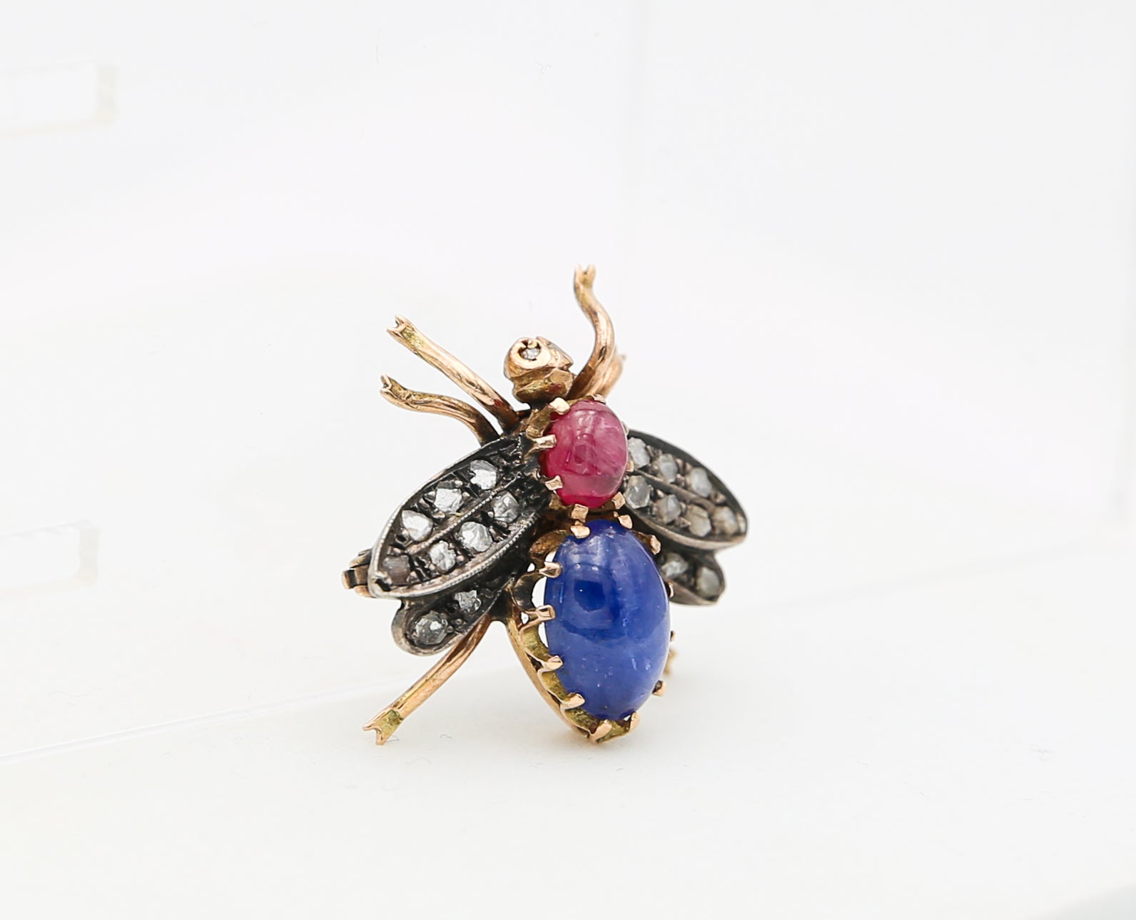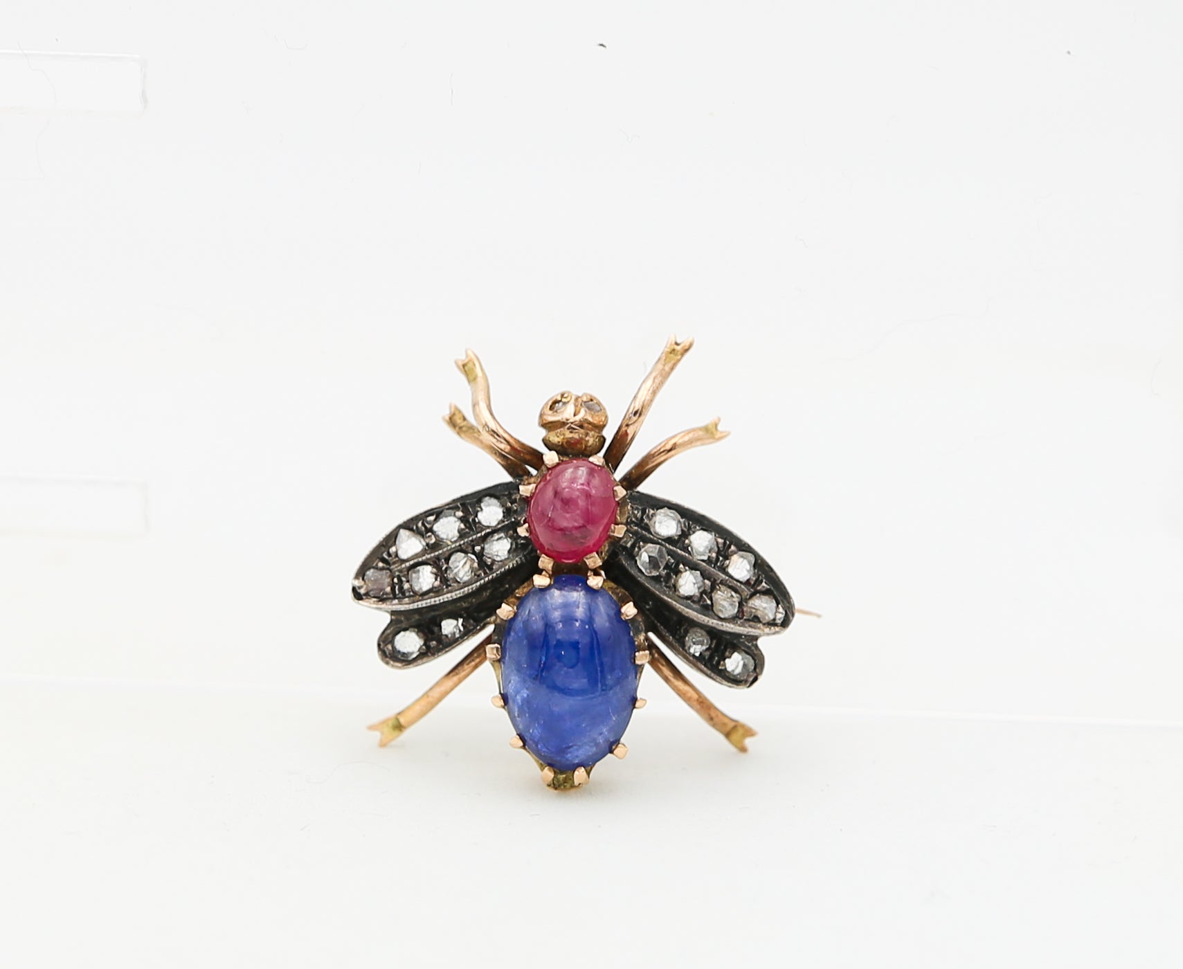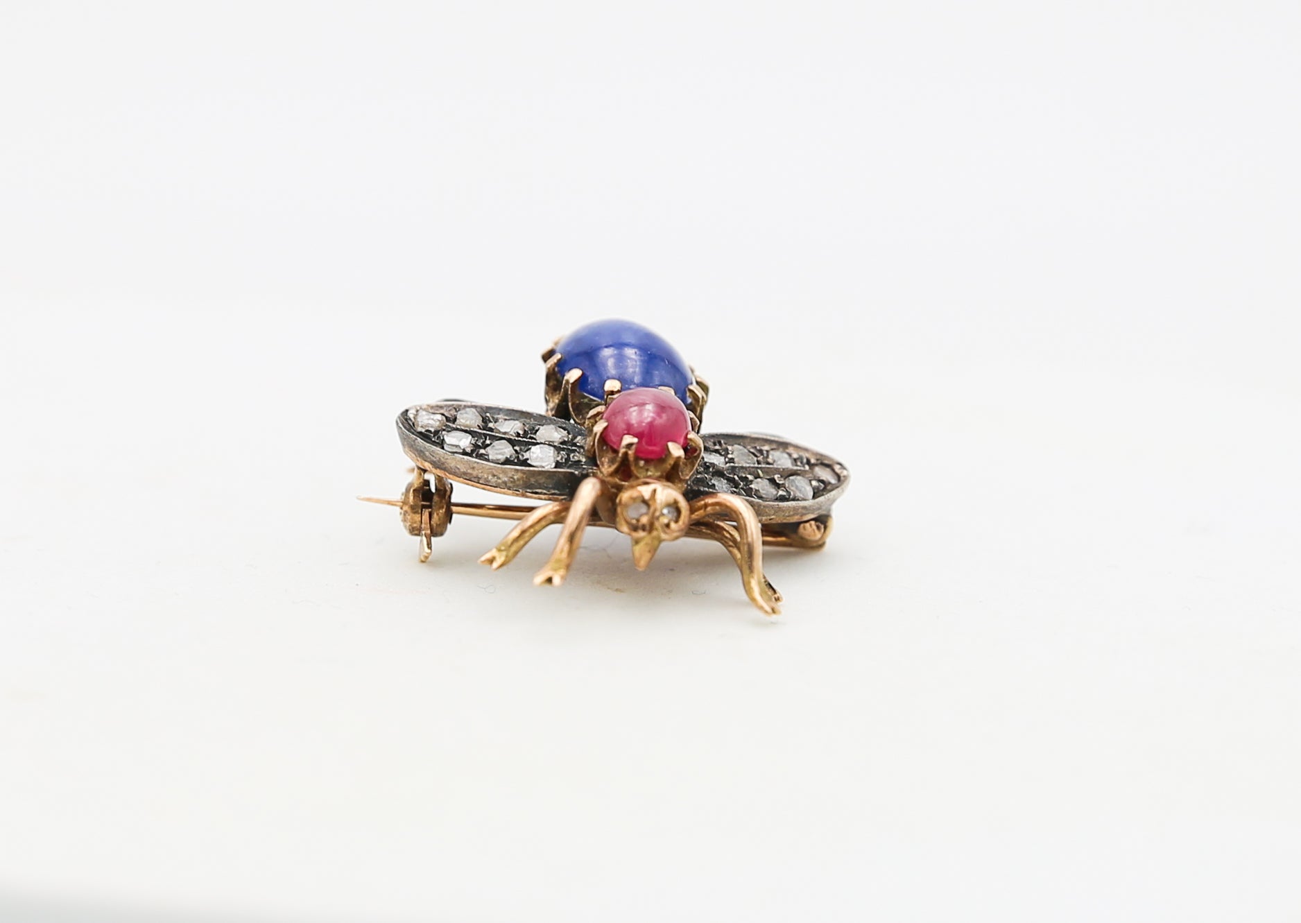 Qui il corpo e la testa della nostra mosca sono uno zaffiro e un rubino rispettivamente di taglio rotondo e di taglio ovale, caratterizzati da un blu intenso e un rosso profondo; le ali sono invece decorate da dei diamanti di taglio rosetta.
