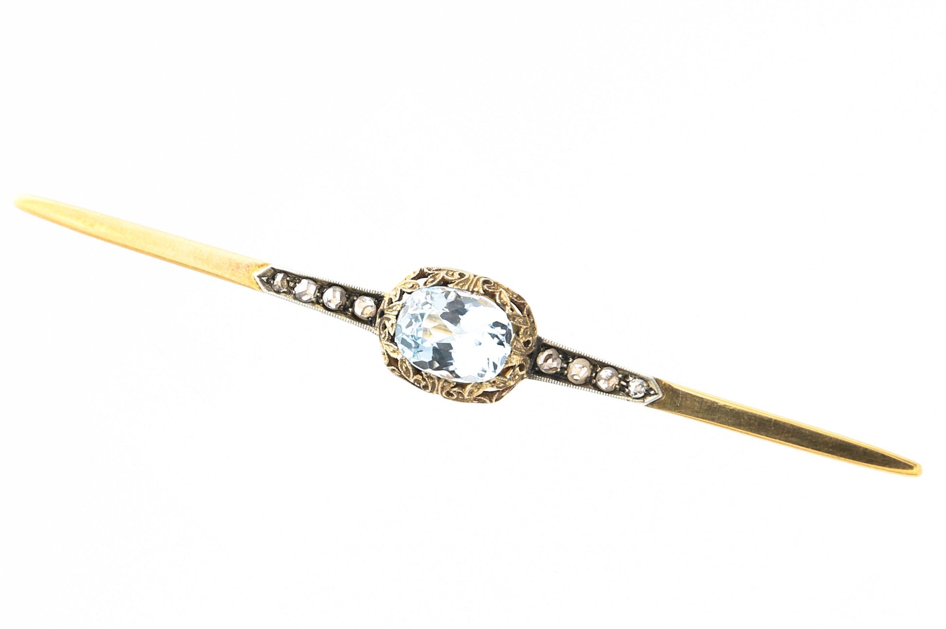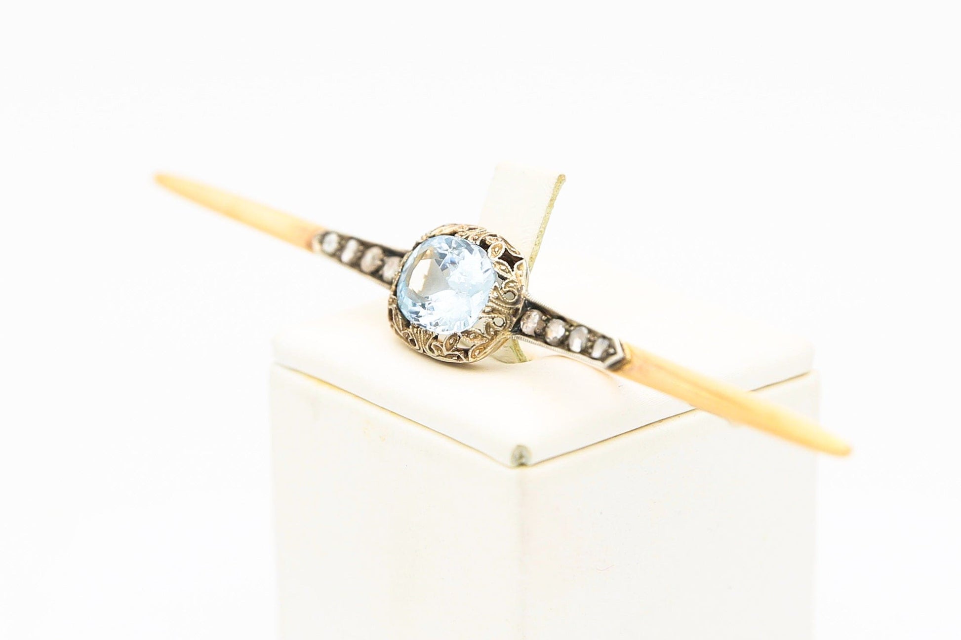 Spilla in oro giallo 18kt e brillanti con grande spinello azzurro centrale incastonato su una base in oro a forma di petali.